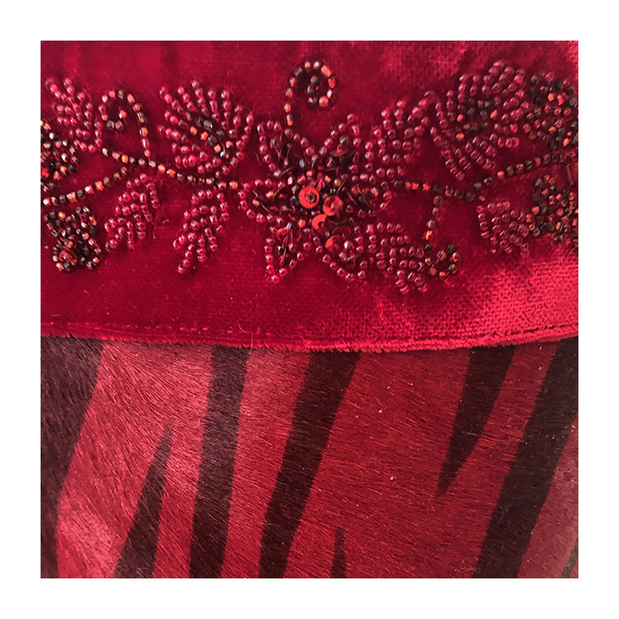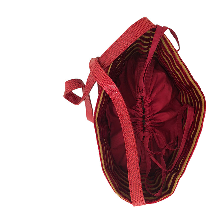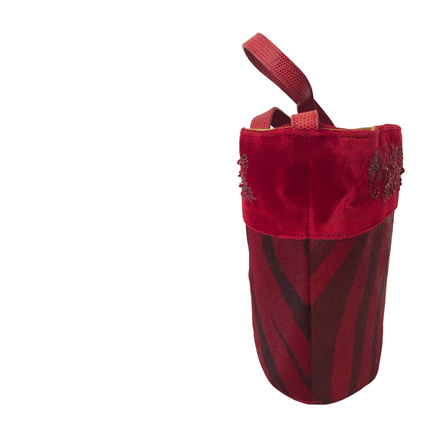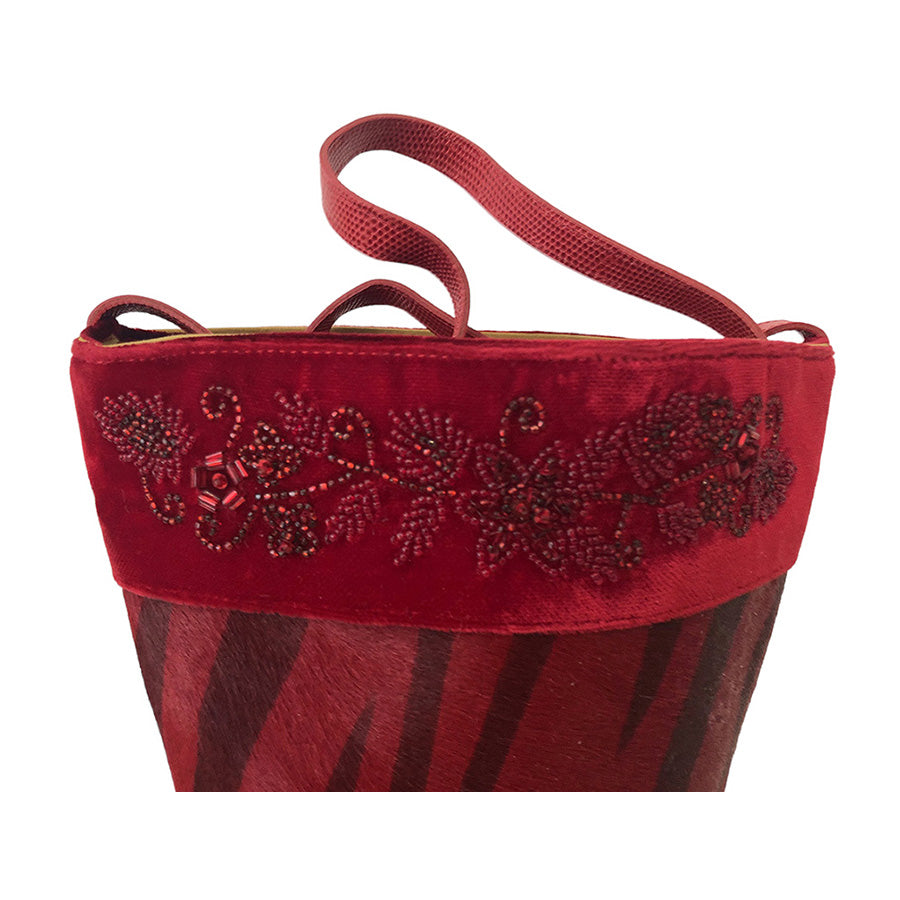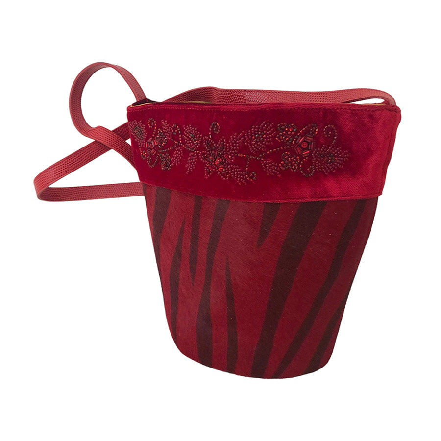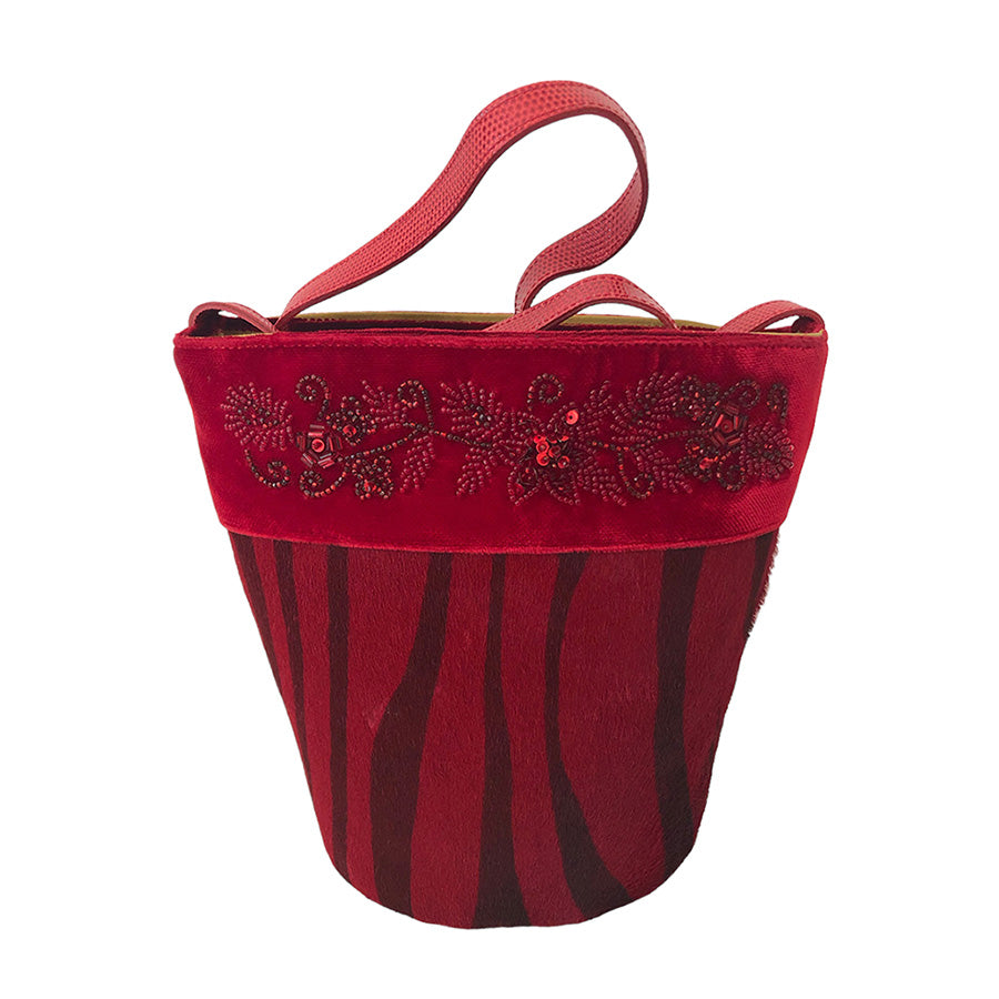 Bucket bag in cavallino con bordura in velluto e perline