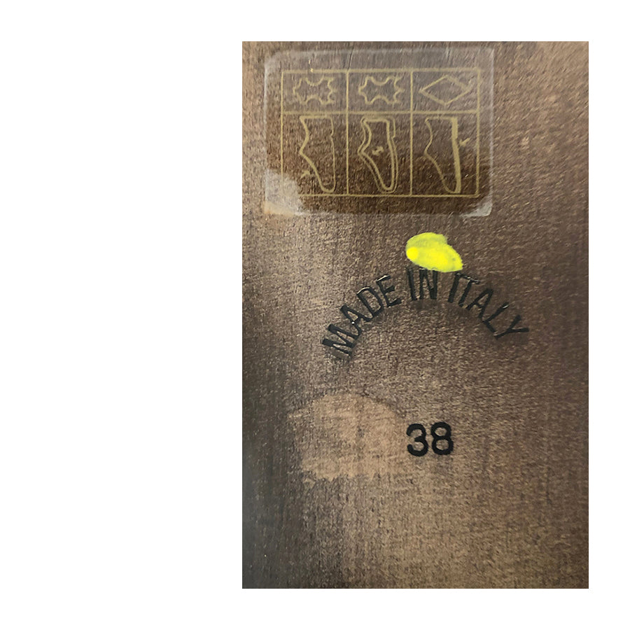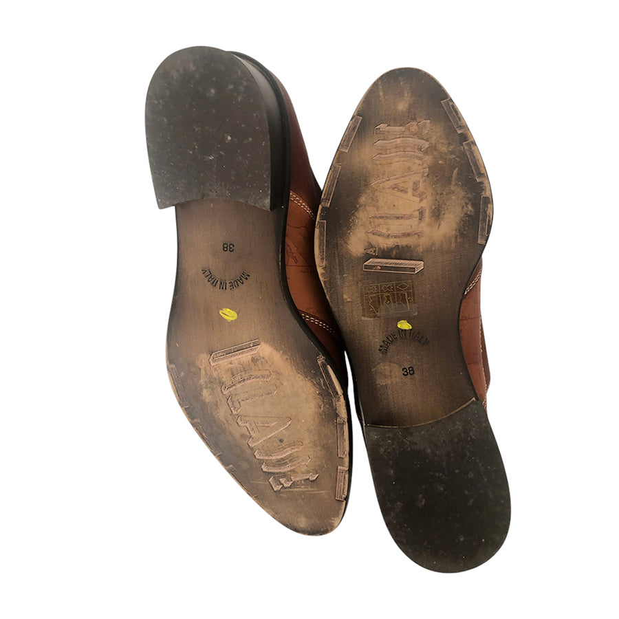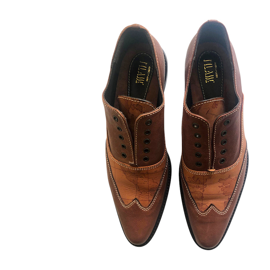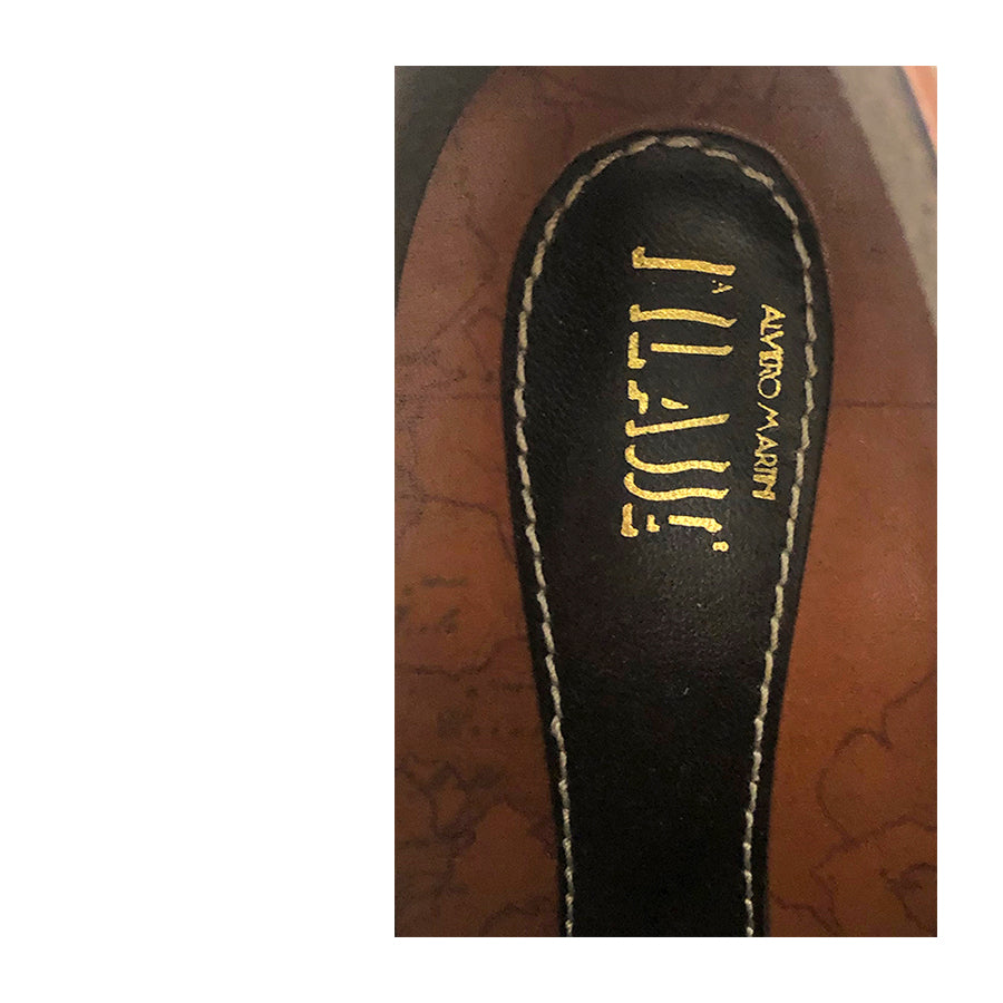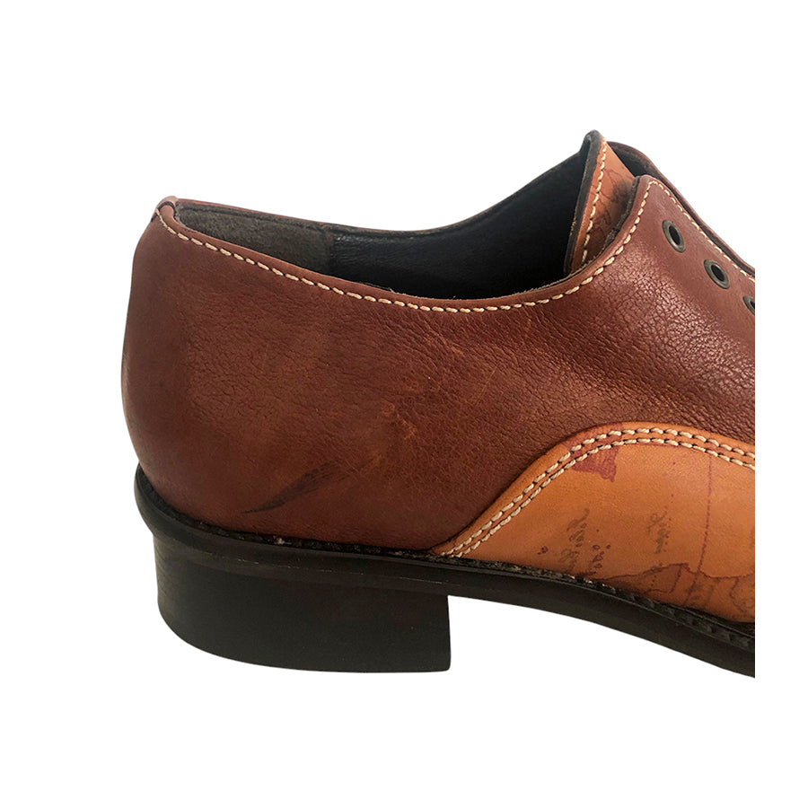 Francesine in pelle bicolore firmata Prima Classe Oliviero Martini, con inserti in stampa geografica Alviero Martini e cuciture a contrasto.