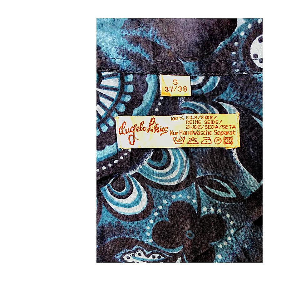 Aloha shirt vintage in seta firmata Angelo Litrico, con fantasia floreale tropicale nei toni del blu e del nero su fondo lucido. Taglio rilassato, maniche corte e chiusura frontale a bottoni.