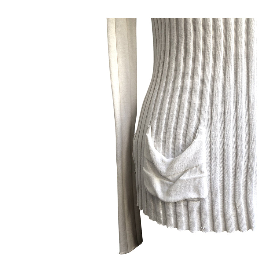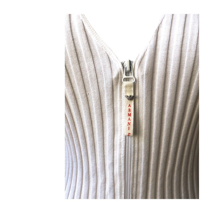Pull cardigan slim fit Armani Jeans in cotone e con coste verticali che valorizzano la silhouette femminile. Chiusura frontale con zip a doppio cursore personalizzata con logo, scollo a V profondo e due pratiche taschine applicate sul davanti. Sul retro è arricchito da un dettaglio distintivo: l’iconico fiore in tessuto tono su tono, firma di stile e raffinatezza del brand.