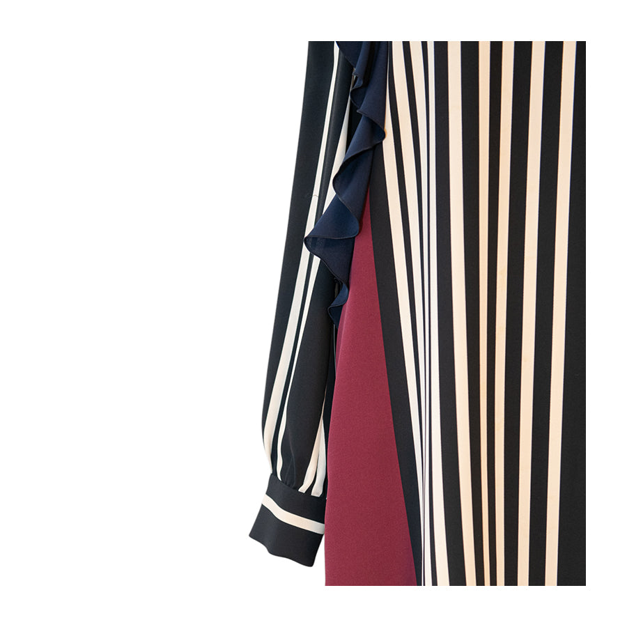 Abito Beatrice B in tessuto fluido con righe verticali bianche, nere e blu che slanciano la silhouette e un inserto laterale bordeaux. La fusciacca coordinata permette di indossarlo sia in versione oversize che in vita stretta mentre le maniche lunghe con rouches donano movimento e femminilità.