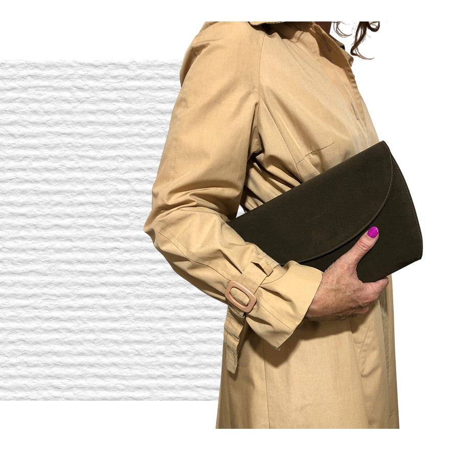 Clutch vintage color tortora in tessuto. Presenta una chiusura a patta arrotondata ed è accessoriata con tracolla asportabile. Dotata di dustbag originale.