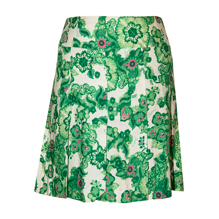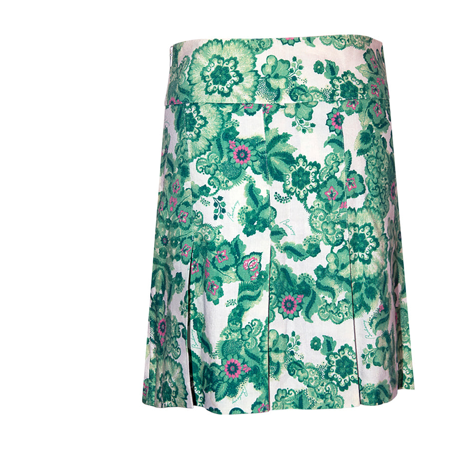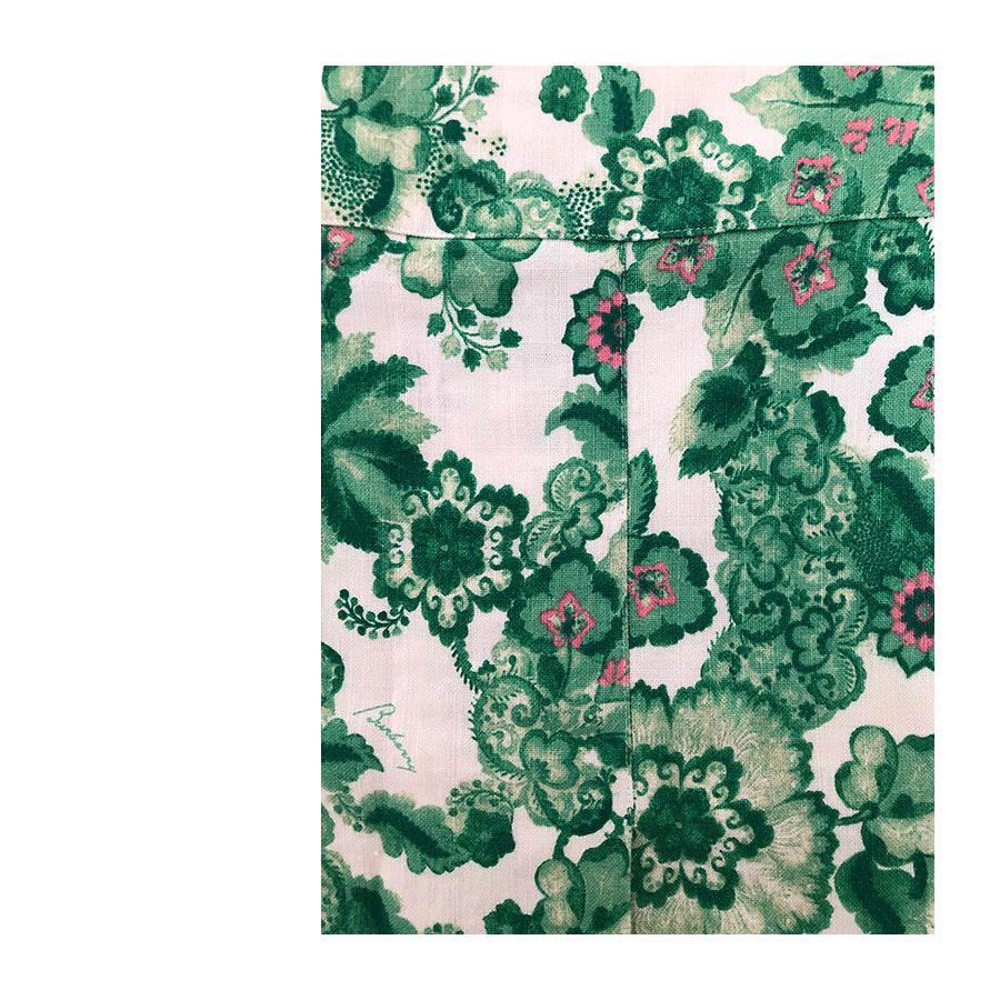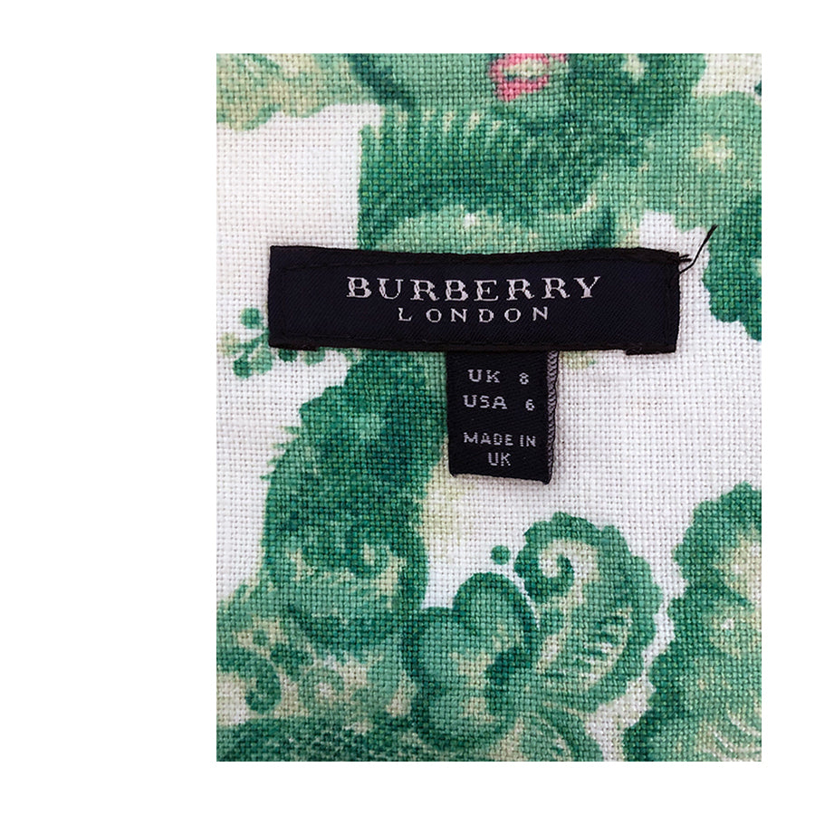 Gonna vintage ’90 Burberry in puro lino con stampa floreale verde e rosa su sfondo panna. Il taglio svasato con pieghe morbide la rende comoda, ariosa e super femminile.