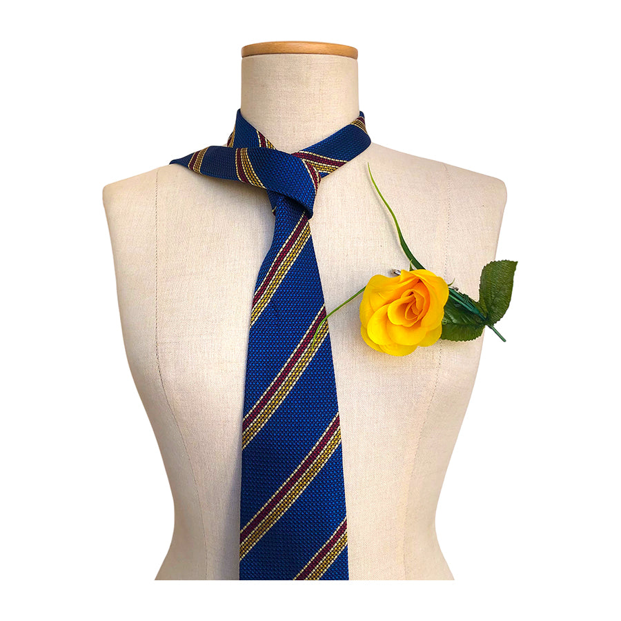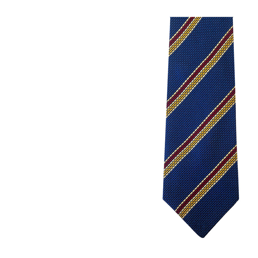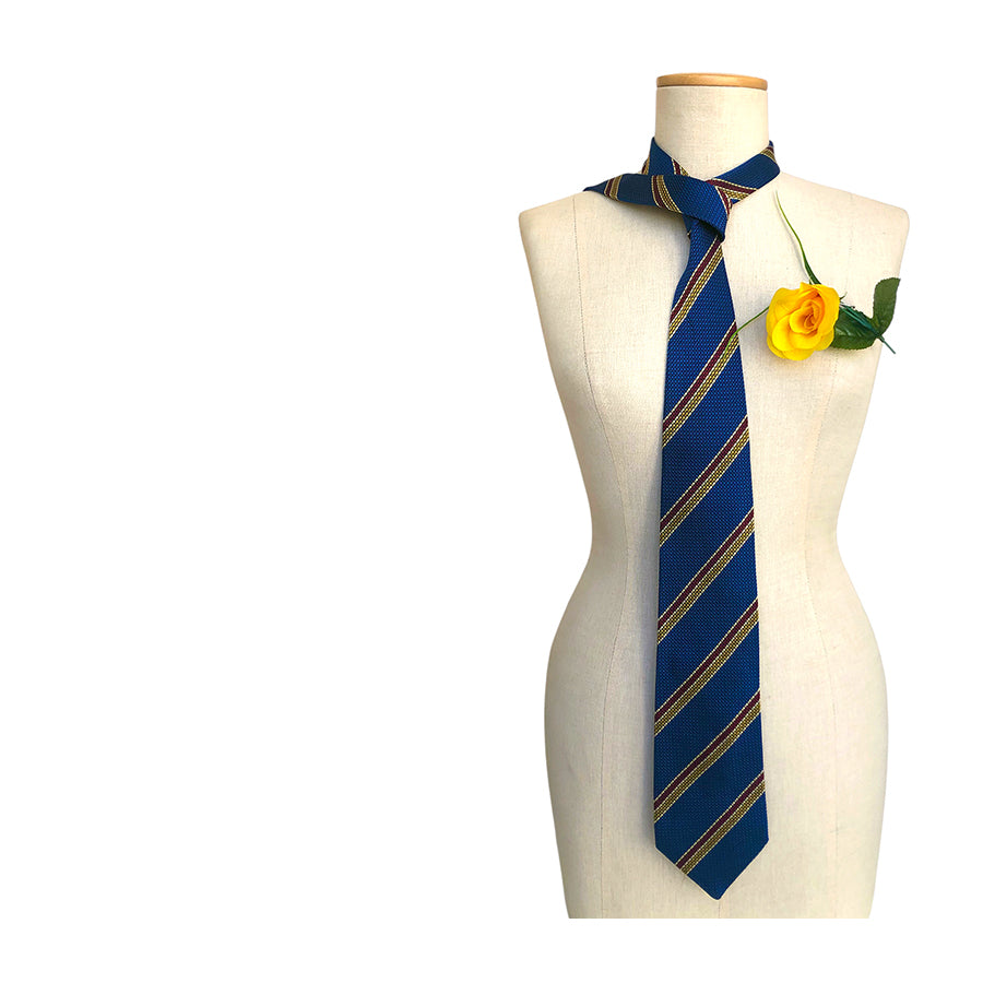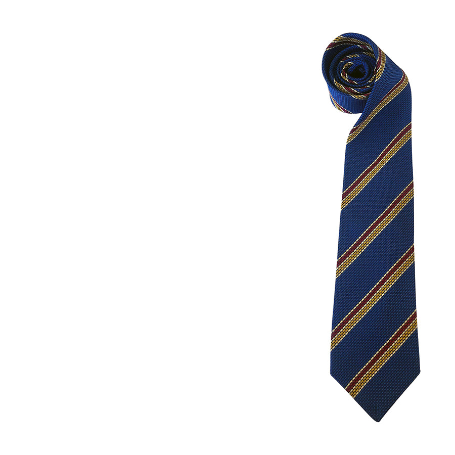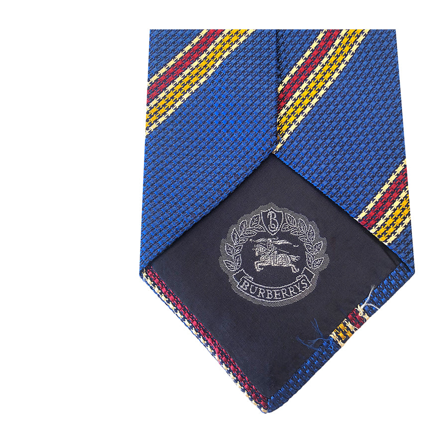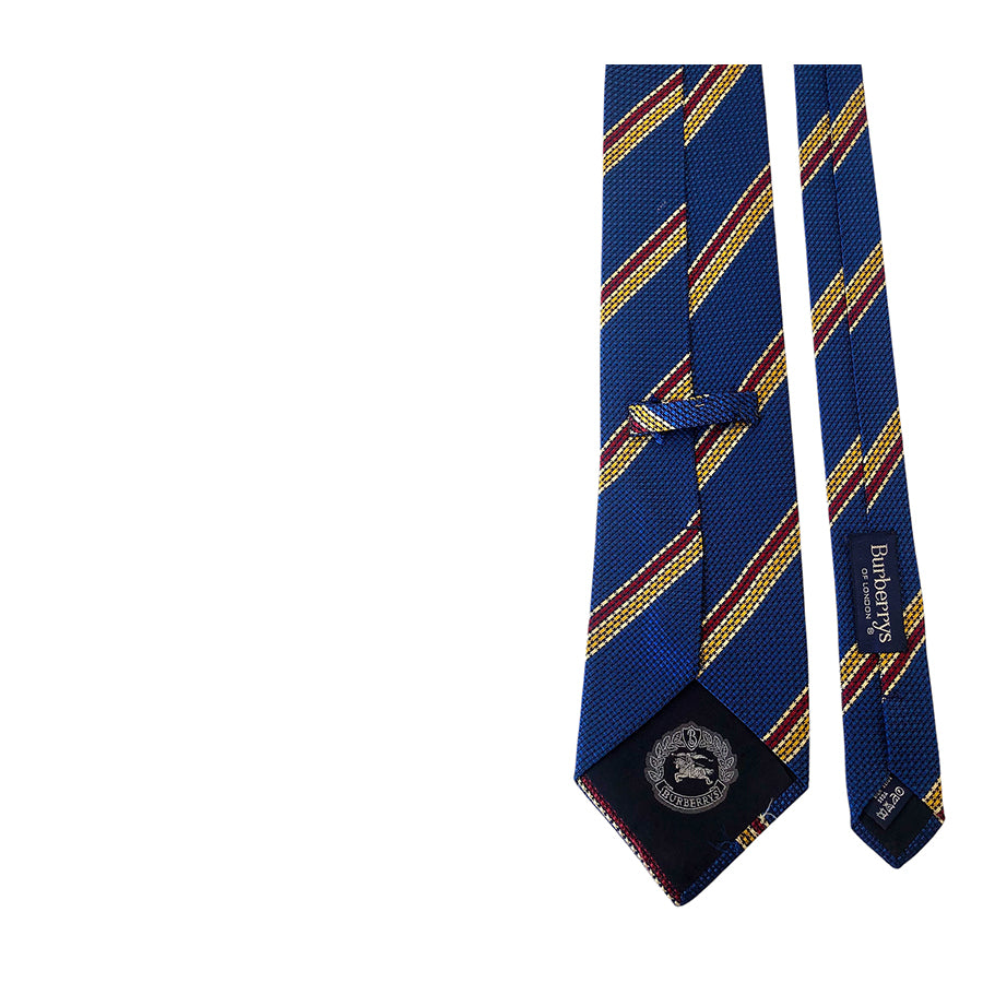 Cravatta vintage ‘80/’90 Burberrys in seta. Il design a righe diagonali blu navy, bordeaux e giallo oro su fondo blu intenso richiama lo stile British heritage. Il tessuto in seta lucida, morbido al tatto, con trama jacquard dona profondità e carattere.