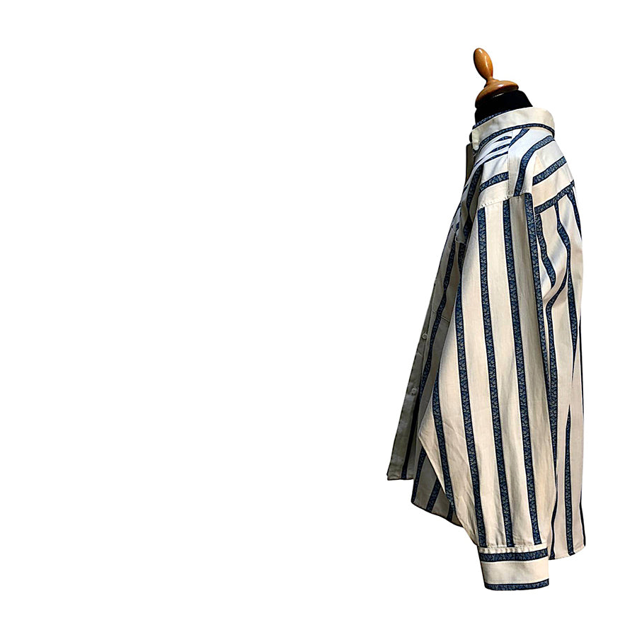 Camicia vintage Burton da uomo in puro cotone con fantasia a righe verticali blu e panna e dettagli jacquard. Colletto button-down e vestibilità rilassata.