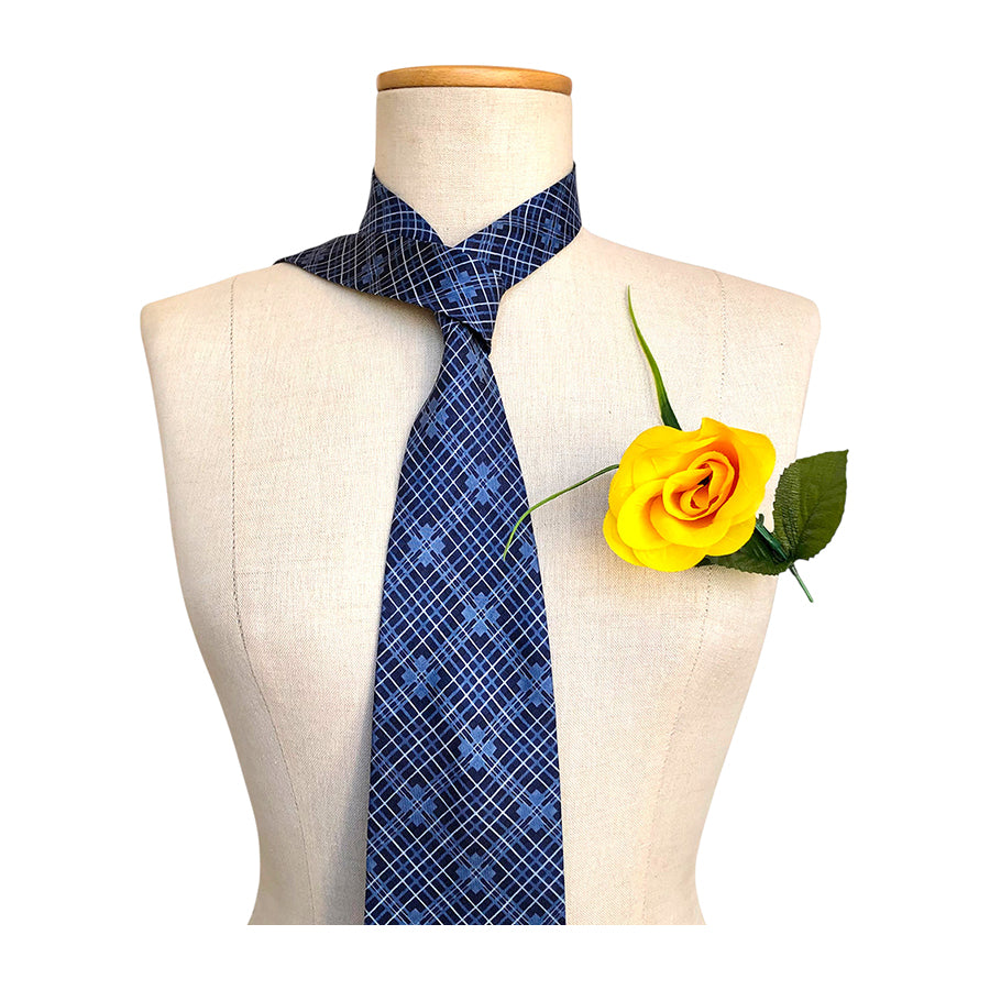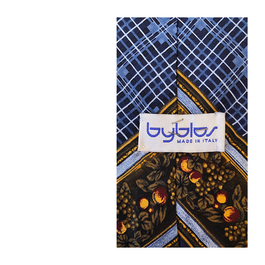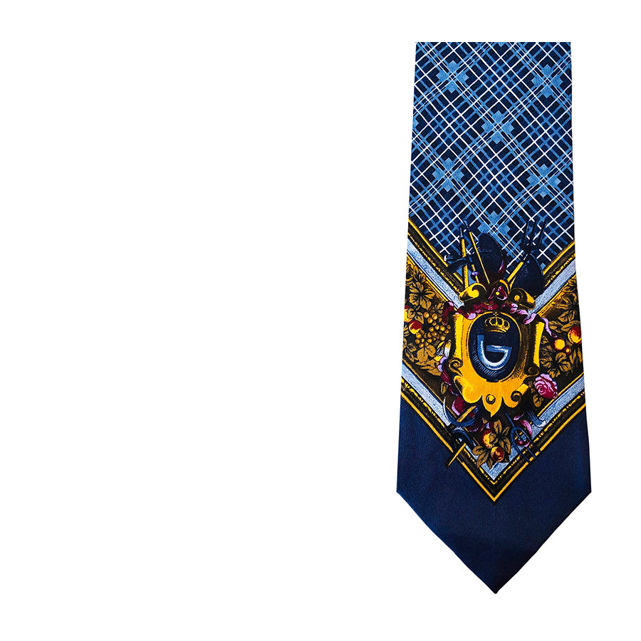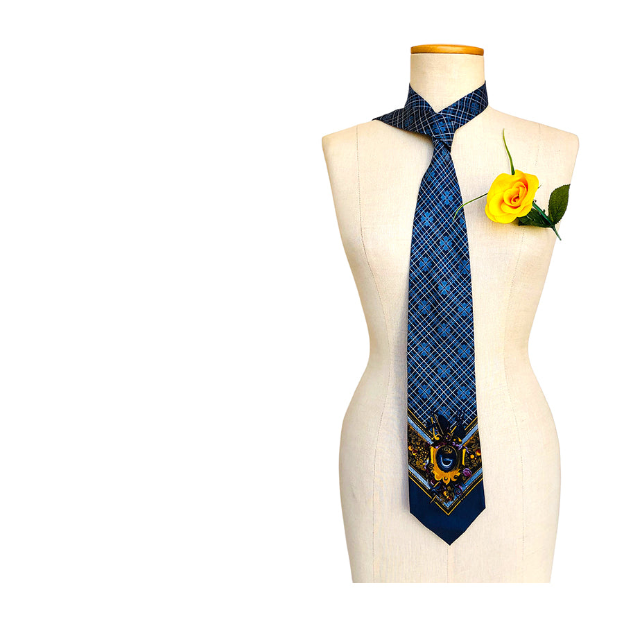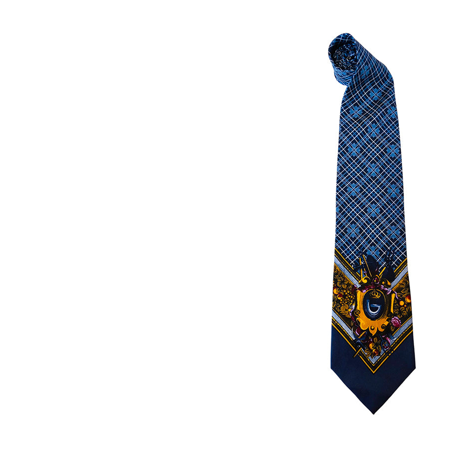 Cravatta in seta vintage Byblos. Il fondo blu con motivo geometrico a quadri si arricchisce nella parte inferiore di uno scenografico stemma barocco decorato con dettagli oro, corone e fregi floreali, simbolo di prestigio ed eleganza senza tempo.