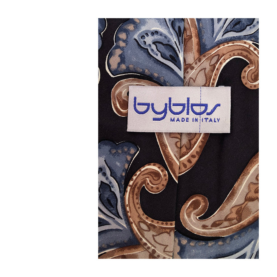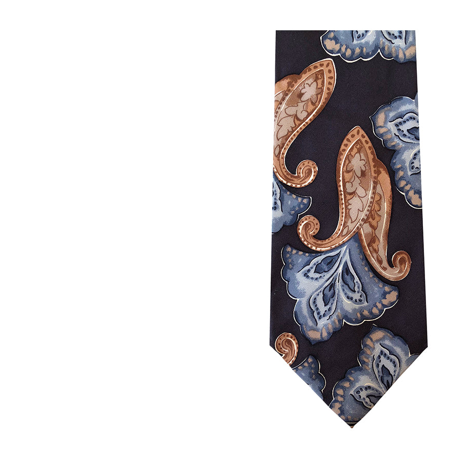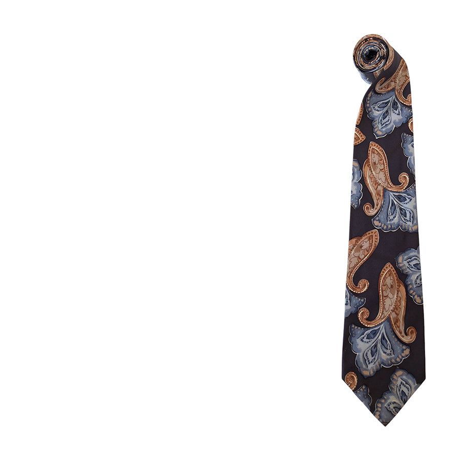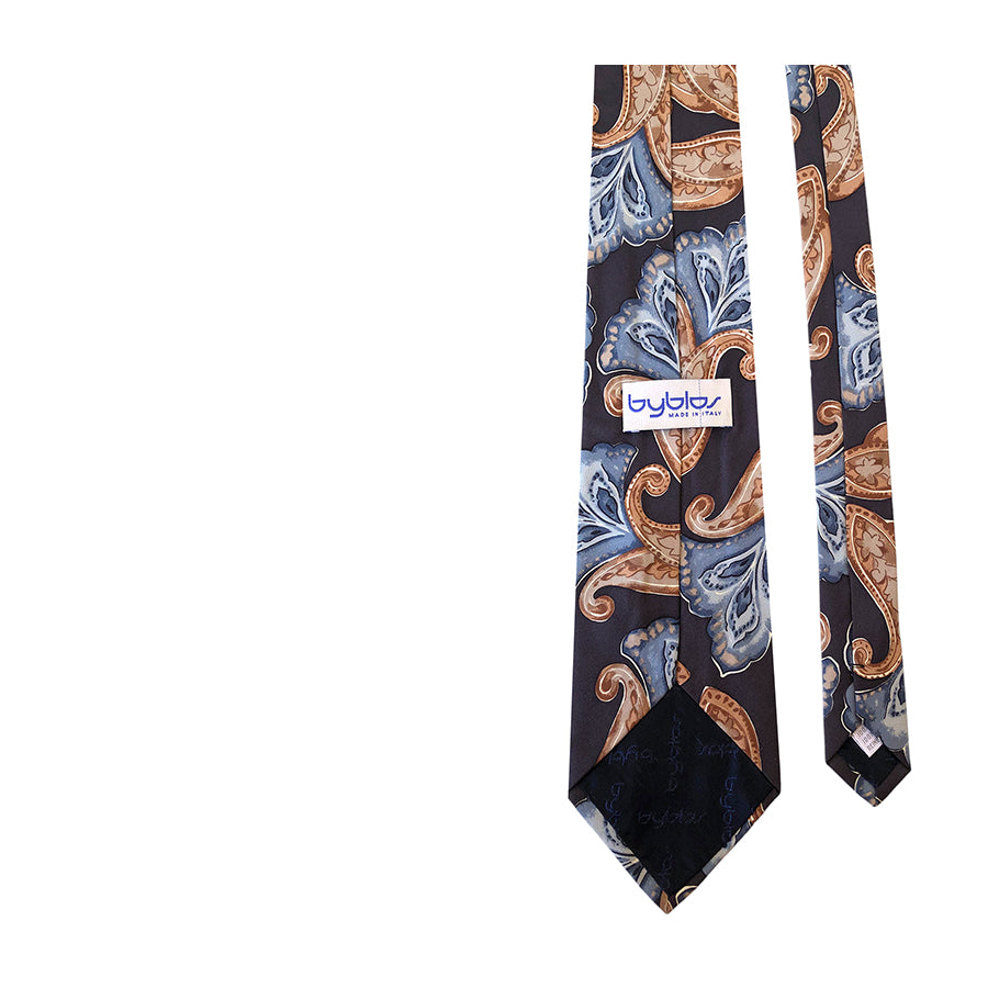 Cravatta vintage ’90 Byblos in seta con motivo paisley multicolore sui toni del marrone e azzurro su fondo piombo.