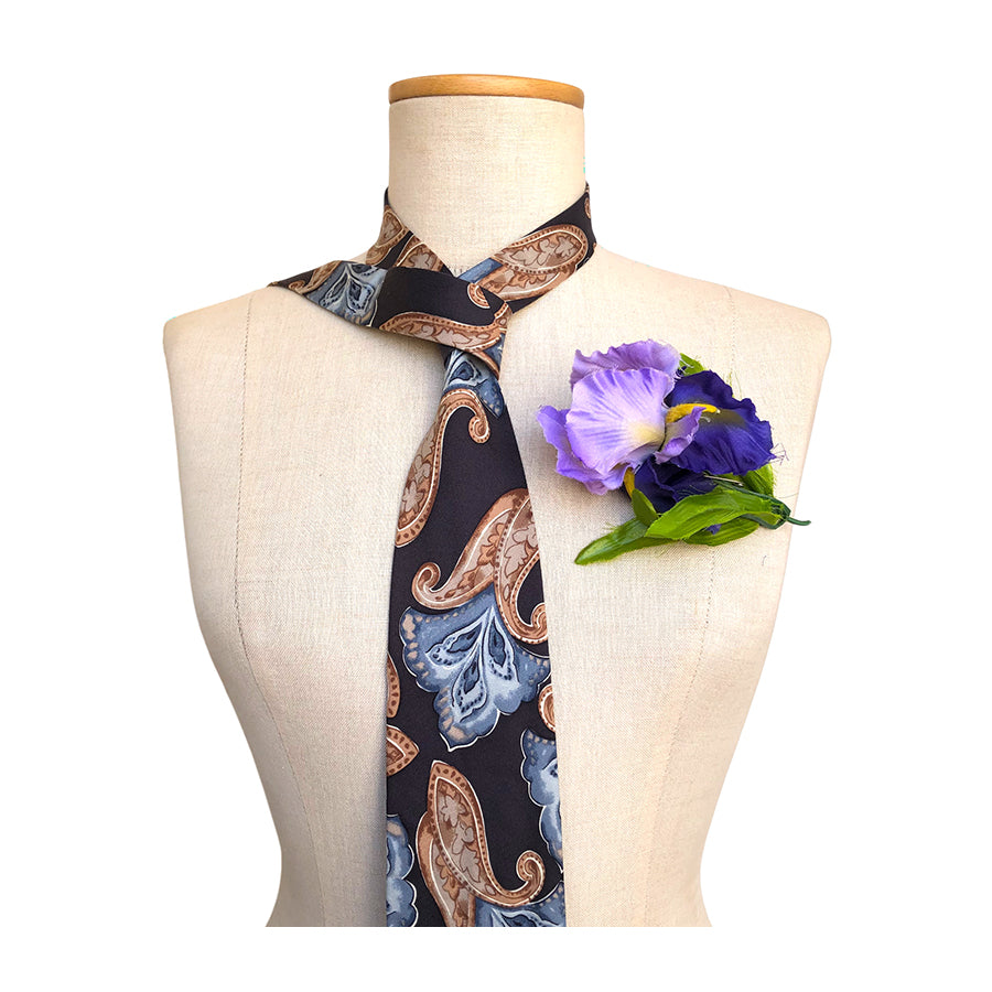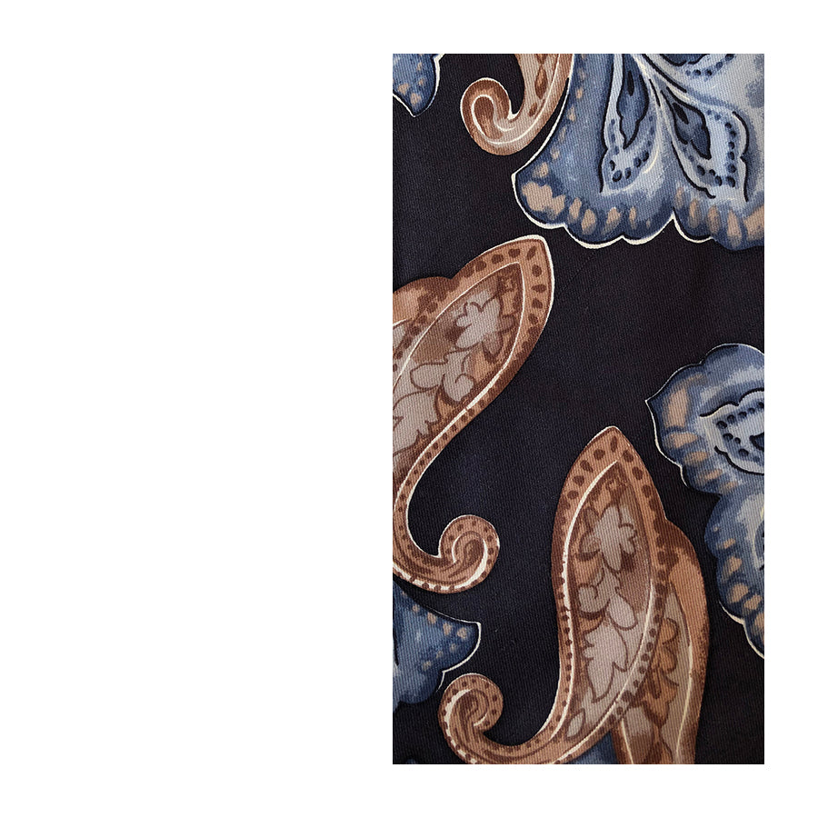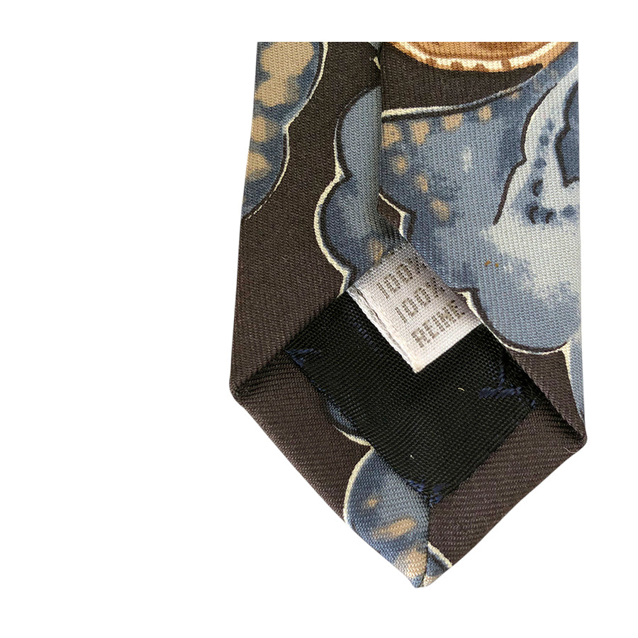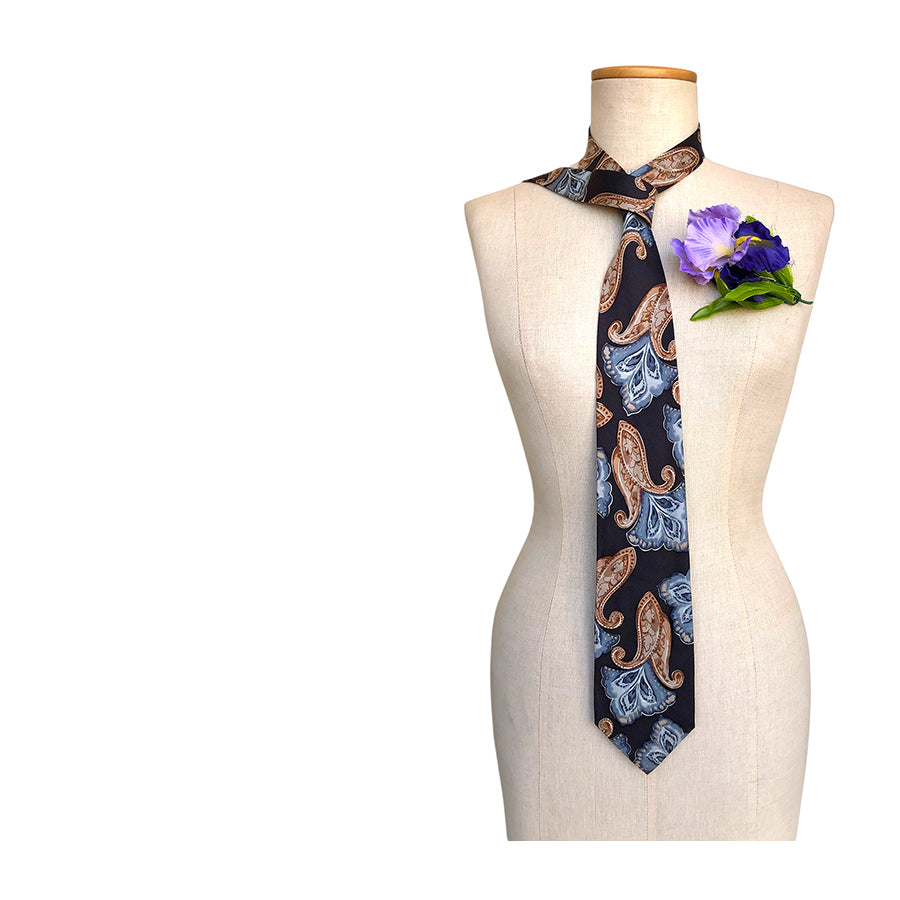 Cravatta vintage ’90 Byblos in seta con motivo paisley multicolore sui toni del marrone e azzurro su fondo piombo.