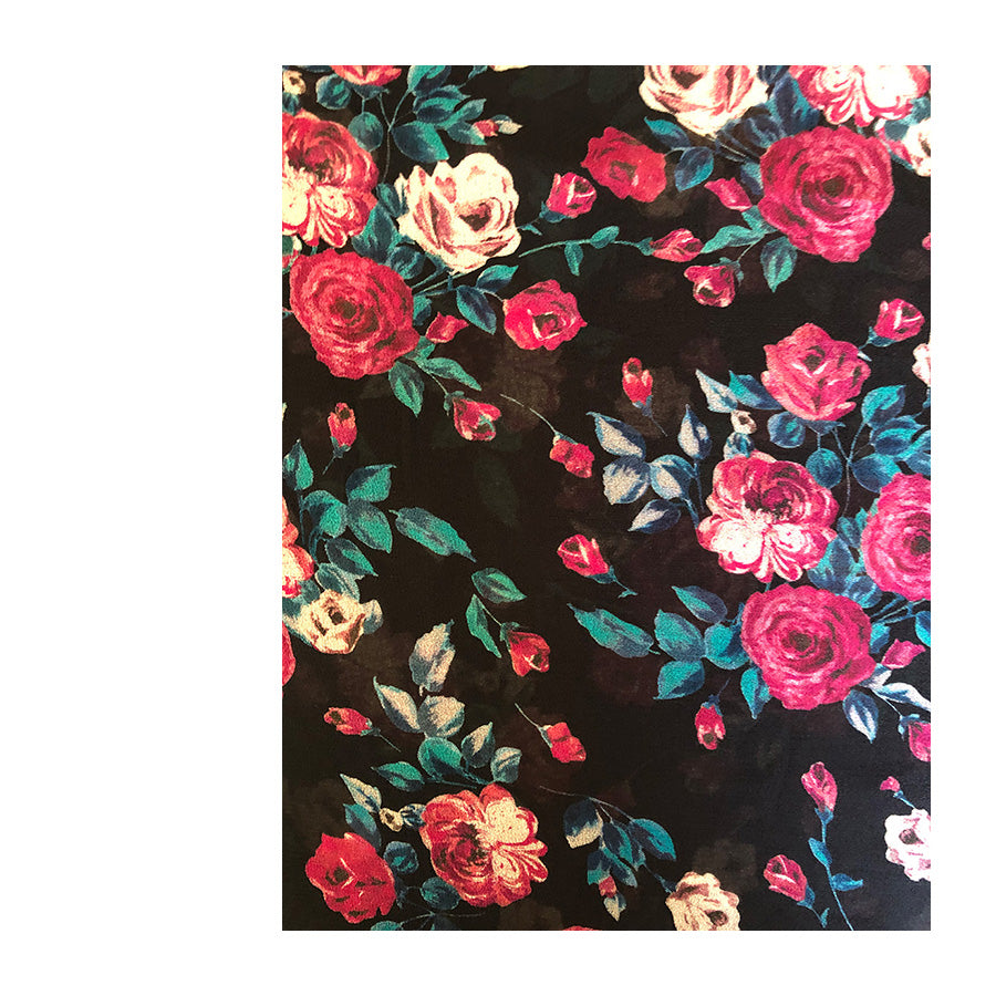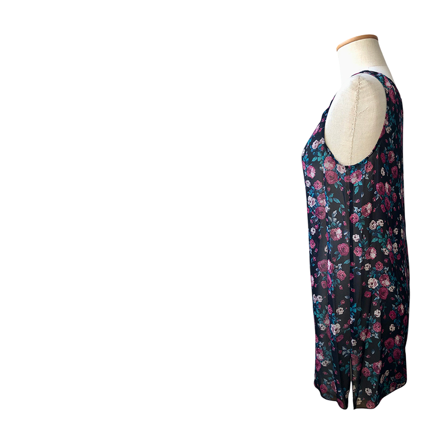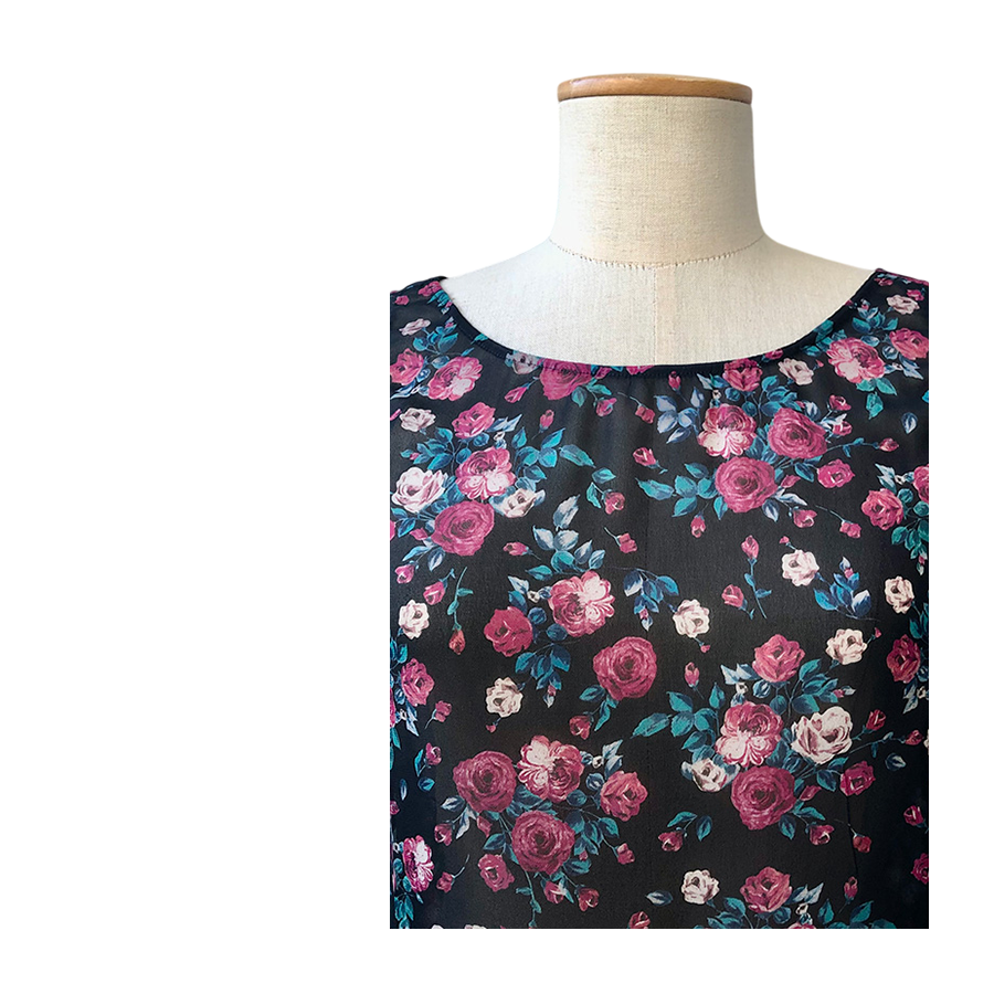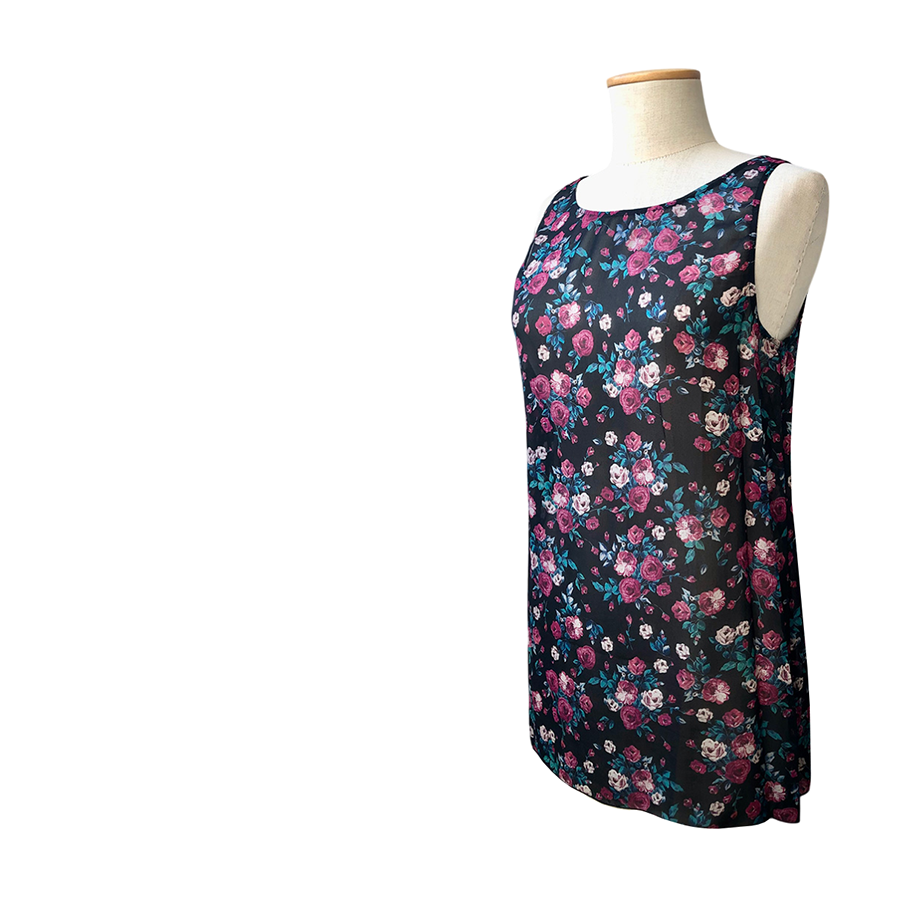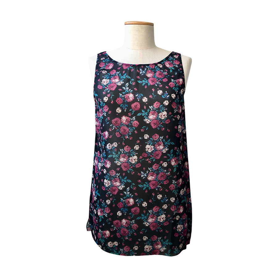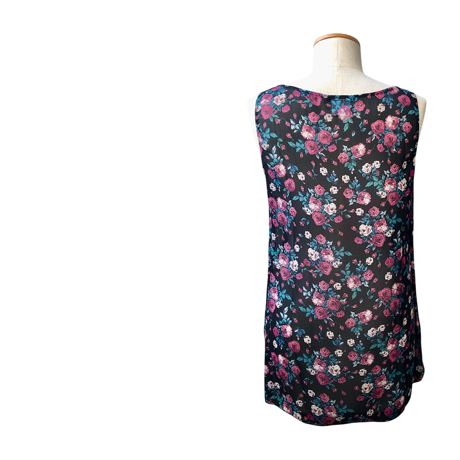Canotta Carla G in viscosa leggera a fantasia floreale su fondo nero. Design smanicato con scollo rotondo, linea dritta e motivo a rose vintage nei toni del bordeaux, rosa e turchese.