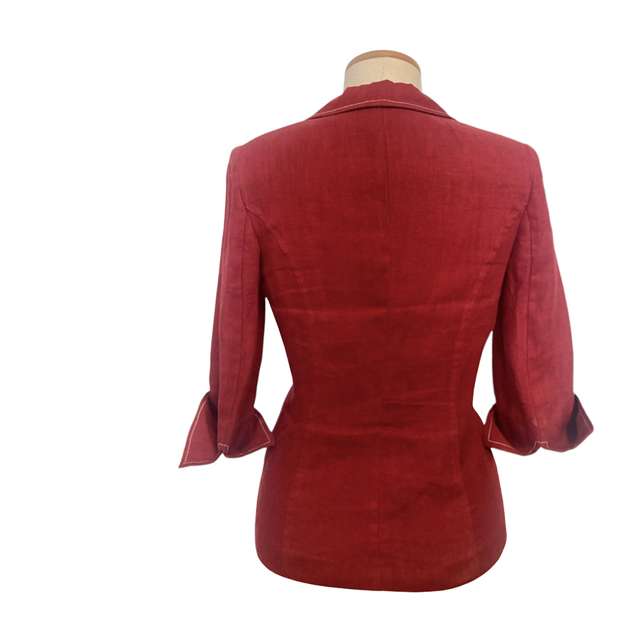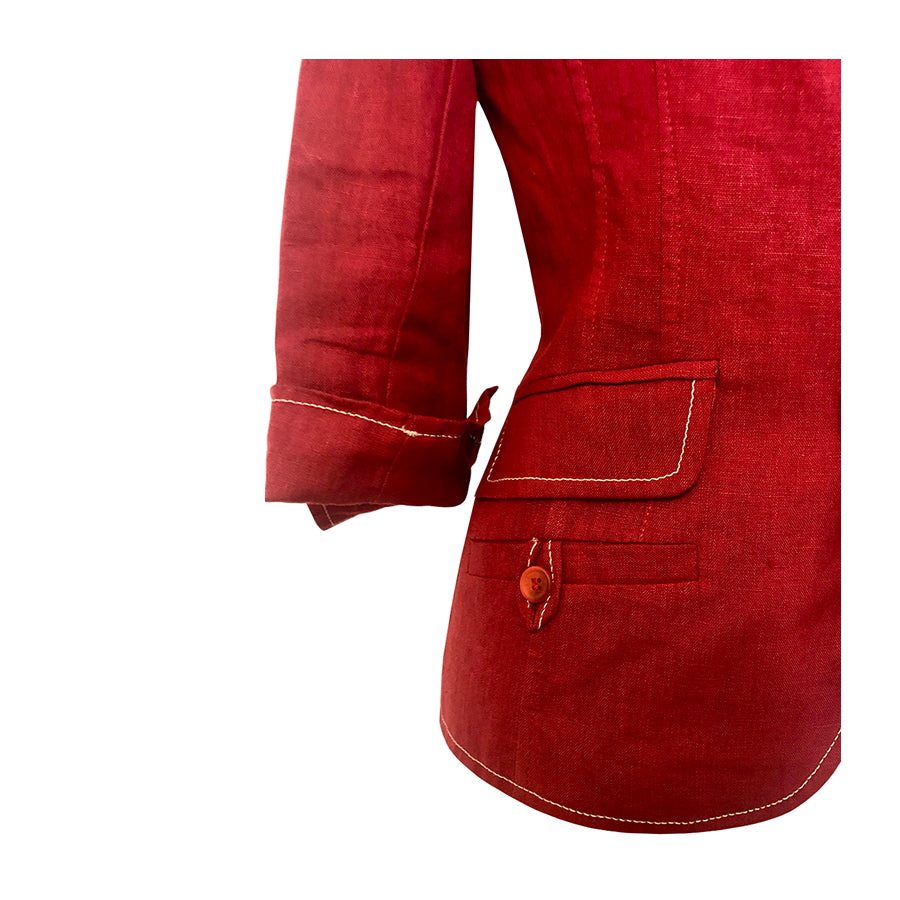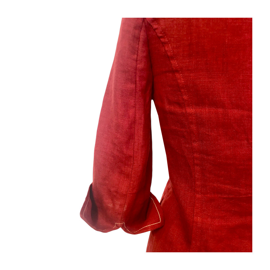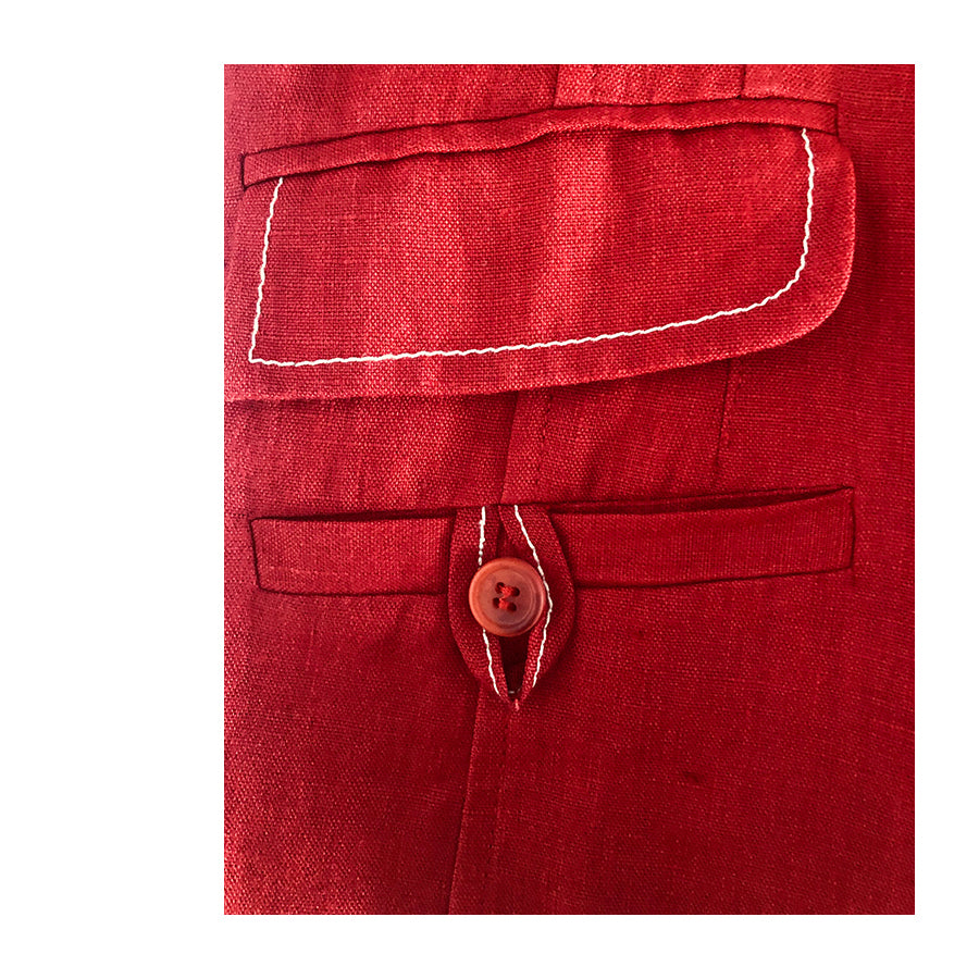 Giacchino vintage Chopin in lino rosso con maniche 3/4 risvoltate, revers classico, chiusura a tre bottoni e tasche frontali con dettagli sartoriali e cuciture a contrasto. La vestibilità strutturata valorizza la silhouette.