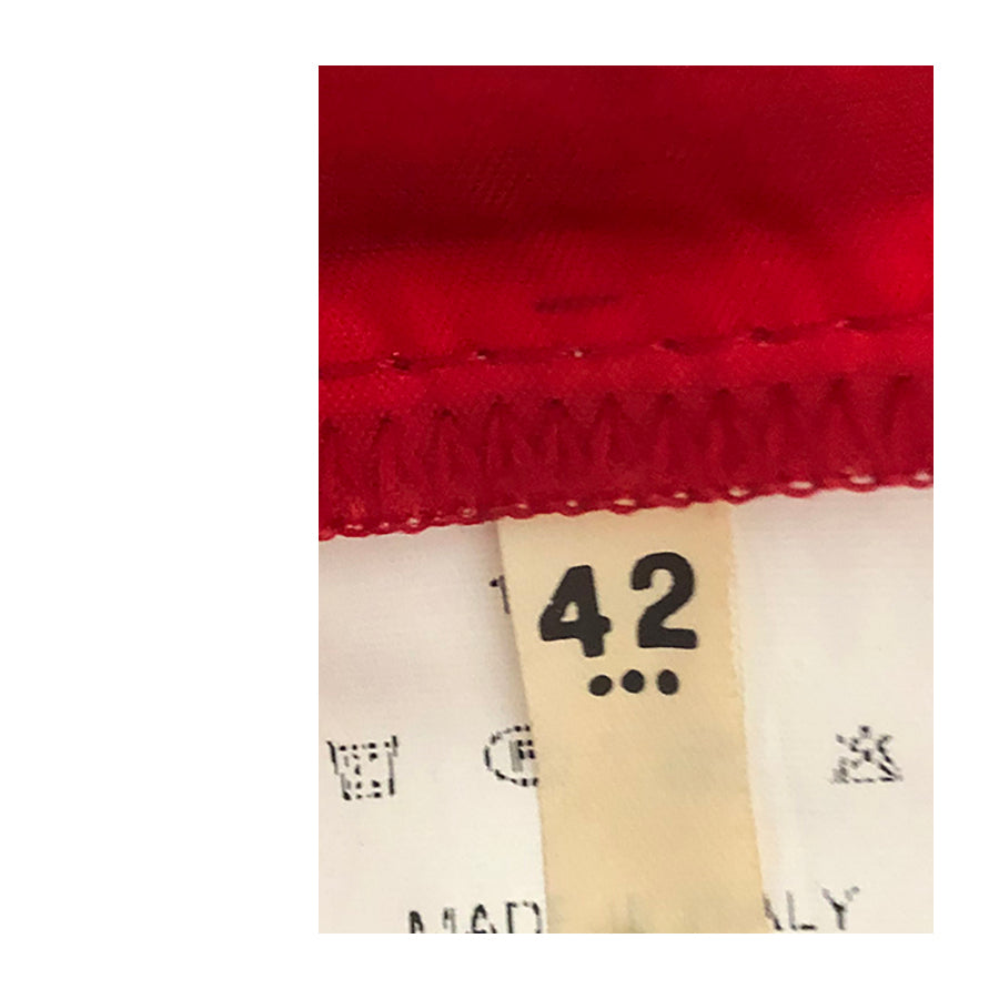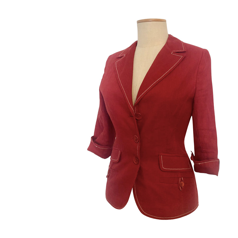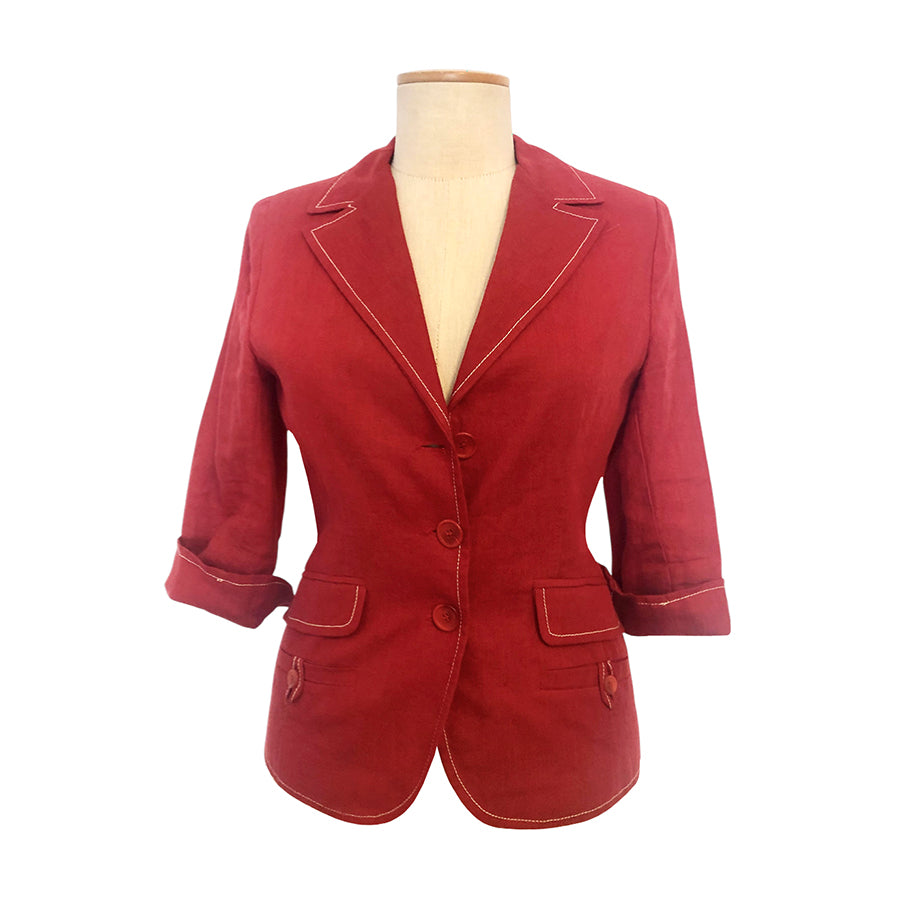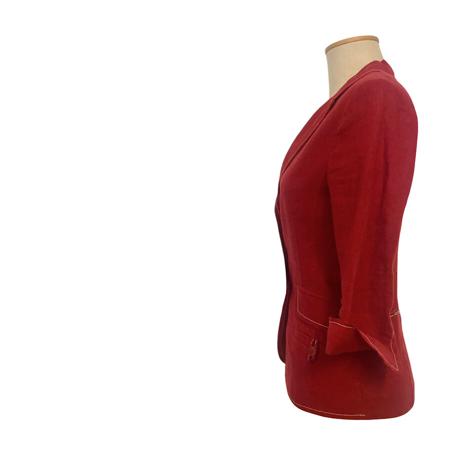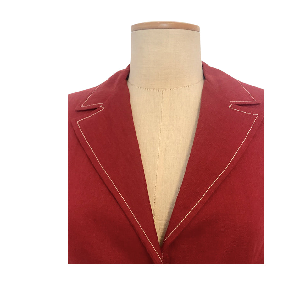 Giacchino vintage Chopin in lino rosso con maniche 3/4 risvoltate, revers classico, chiusura a tre bottoni e tasche frontali con dettagli sartoriali e cuciture a contrasto. La vestibilità strutturata valorizza la silhouette.