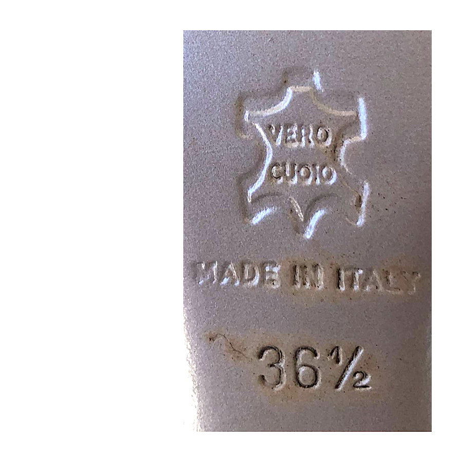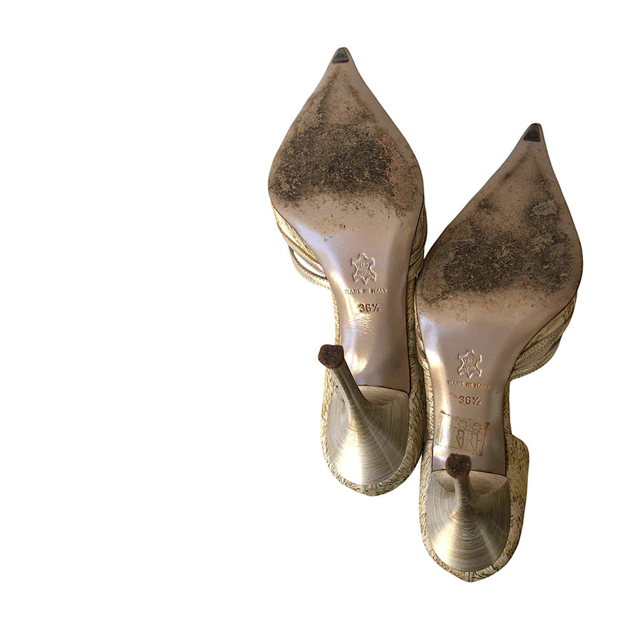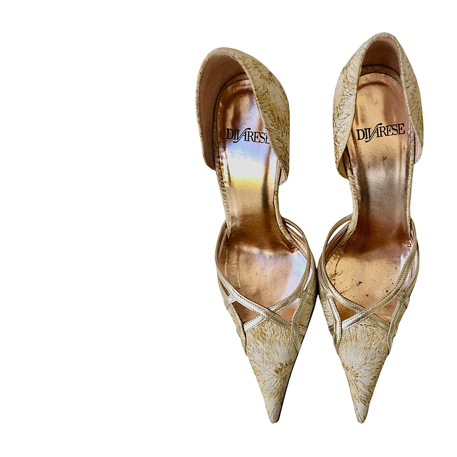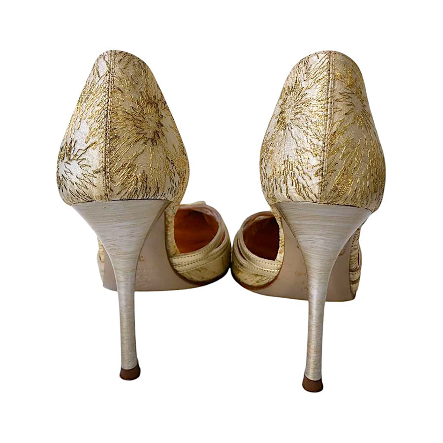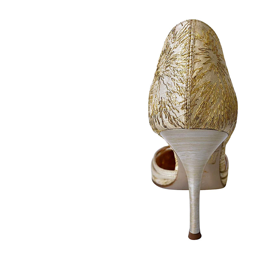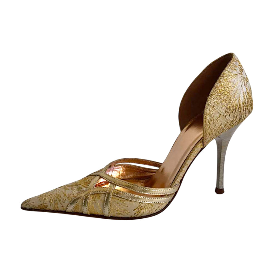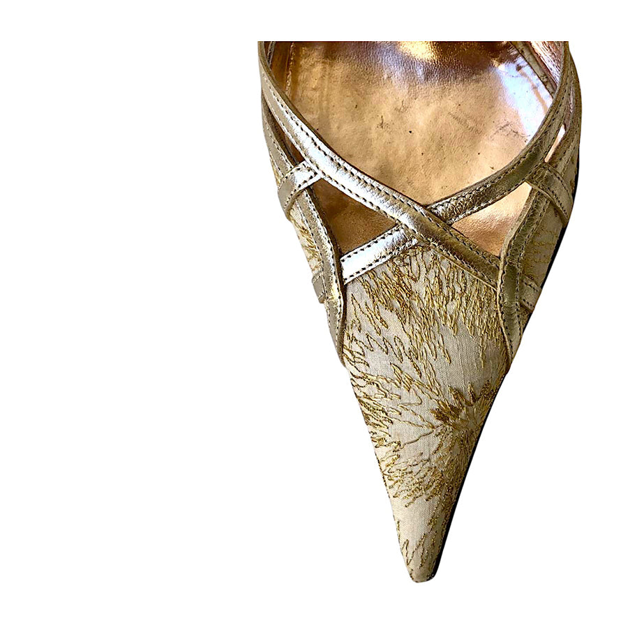 Décolleté d'Orsay di Varese. Punta affusolata, tomaia in tessuto broccato dorato con texture iridescente e intarsi dorati in pelle che creano giochi di luce ad ogni passo. Il tacco a spillo alto e sottile slancia la figura. Simbolo dell’artigianalità italiana e dello stile anni '90–2000.