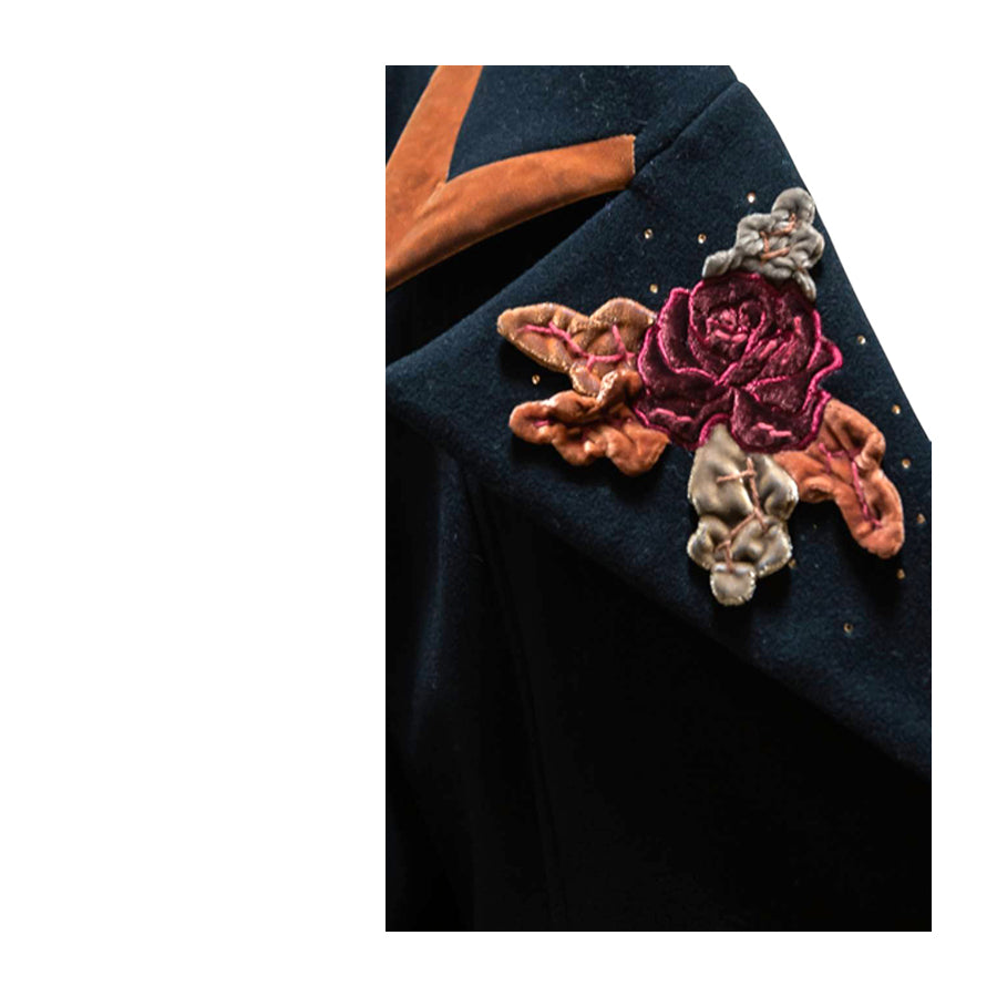 Dettagli distintivi: Ampio colletto a rever con applicazione floreale ricamata con perline e polsini rifiniti in velluto bronzo. Stile boho-chic con ispirazioni vintage e dettagli artigianali