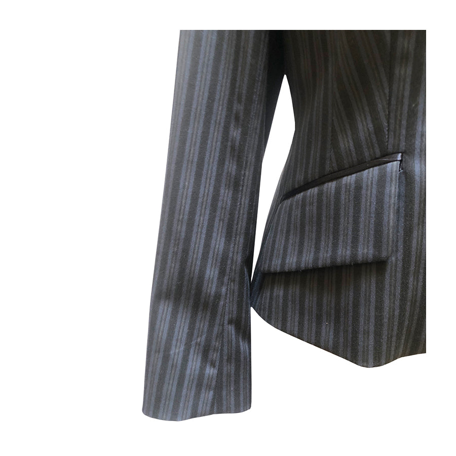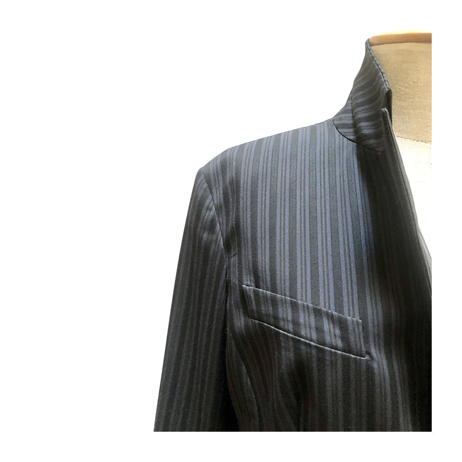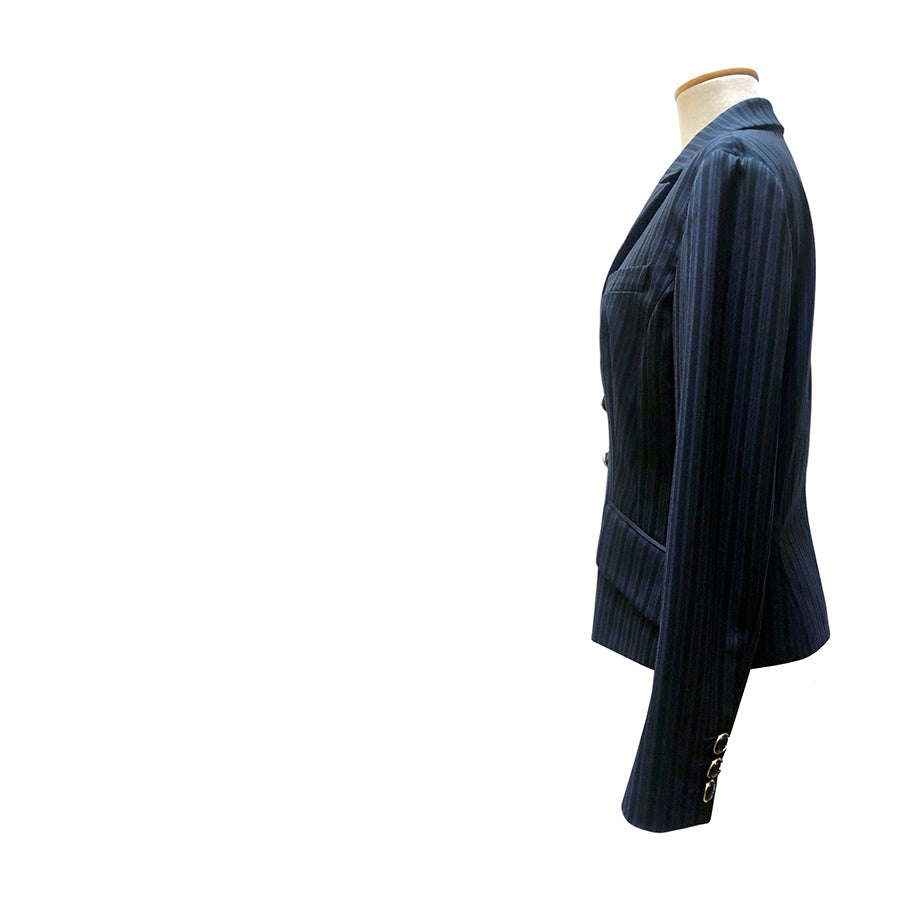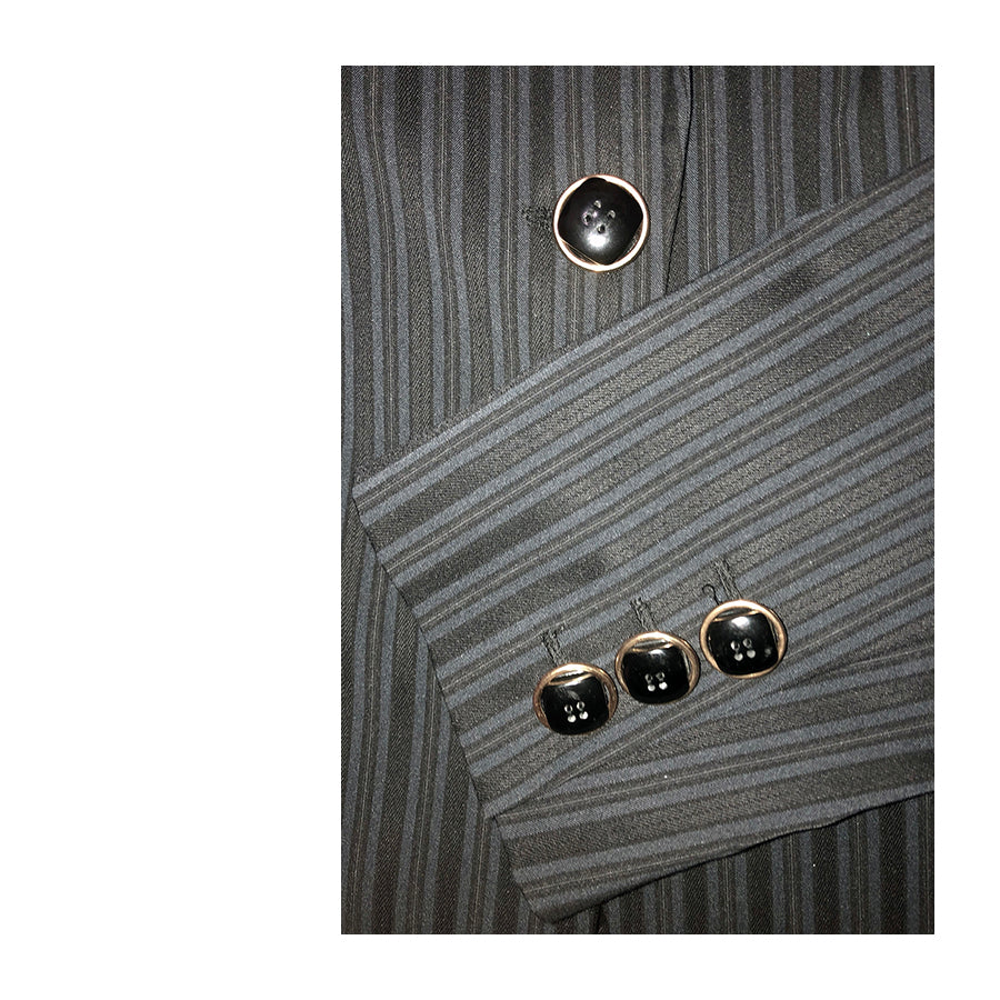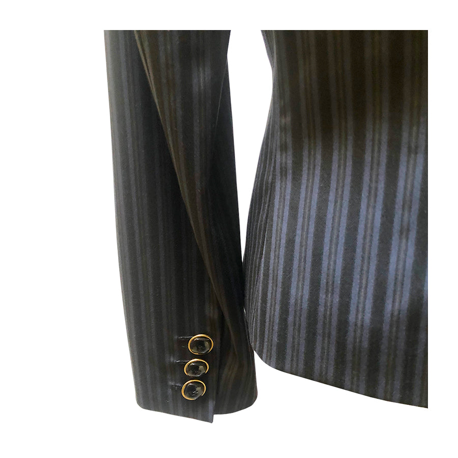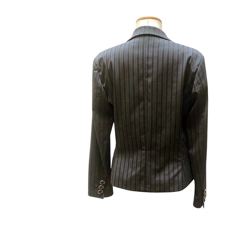 Stile Sartoriale Anni 90 per la Giacca vintage Dolce & Gabbana con sottile fantasia a righe gessate verticali. Presenta una silhouette leggermente sfiancata che valorizza la figura, spalle ben definite e tre bottoni dorati frontali con profilo nero smaltato.