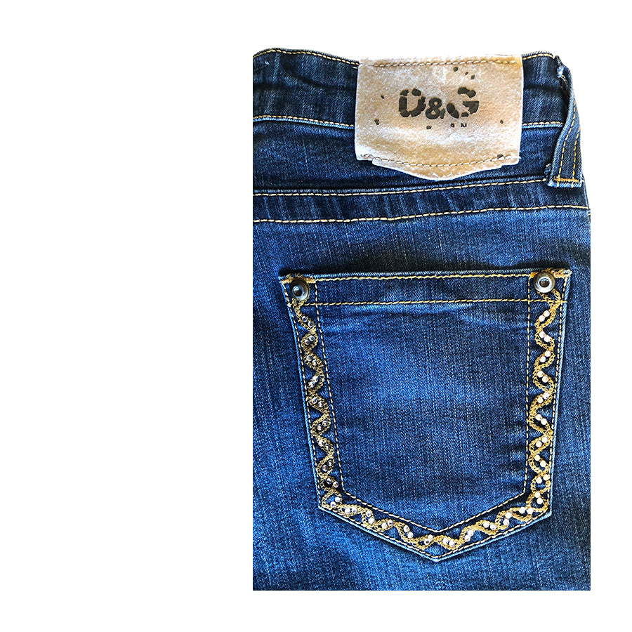 Jeans vintage Dolce & Gabbana in denim blu con ricamo oro sulle tasche per un tocco glam e sofisticato. Fit dritto a vita media.