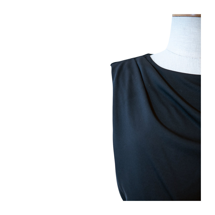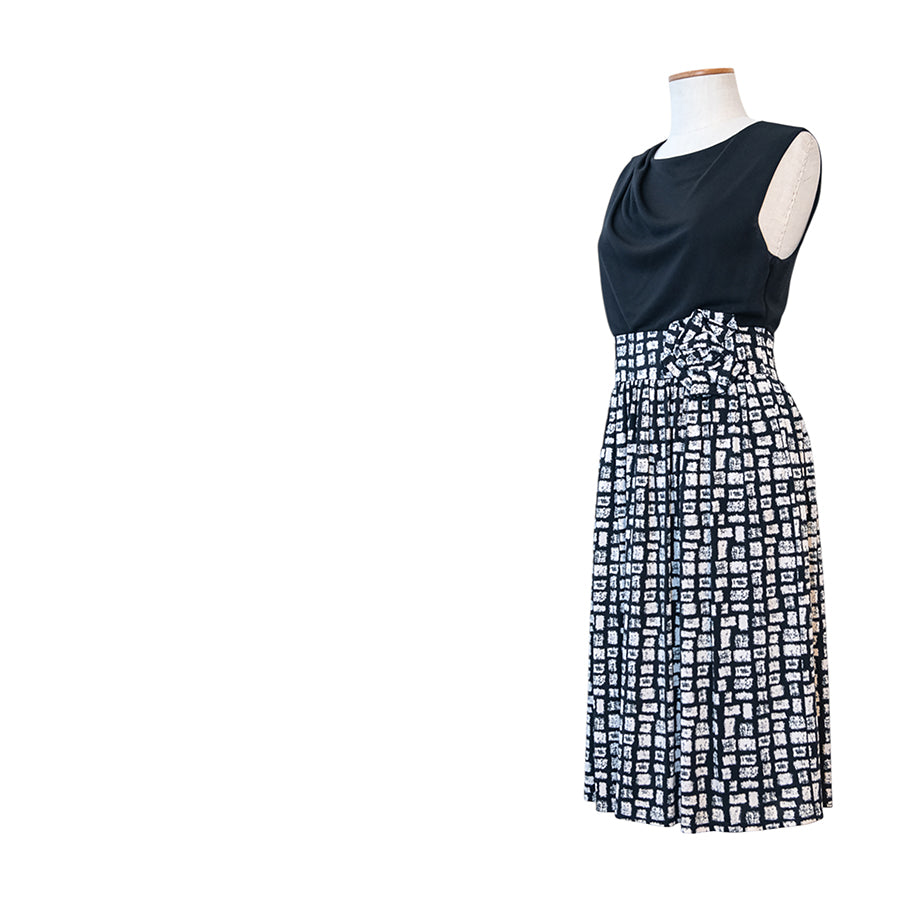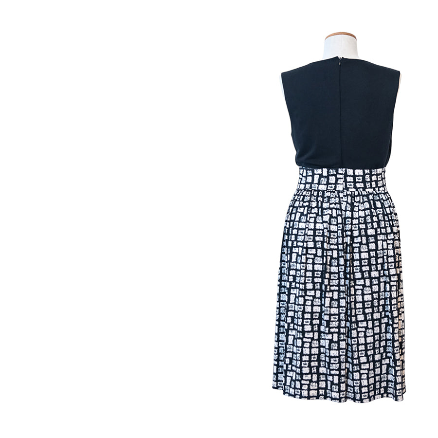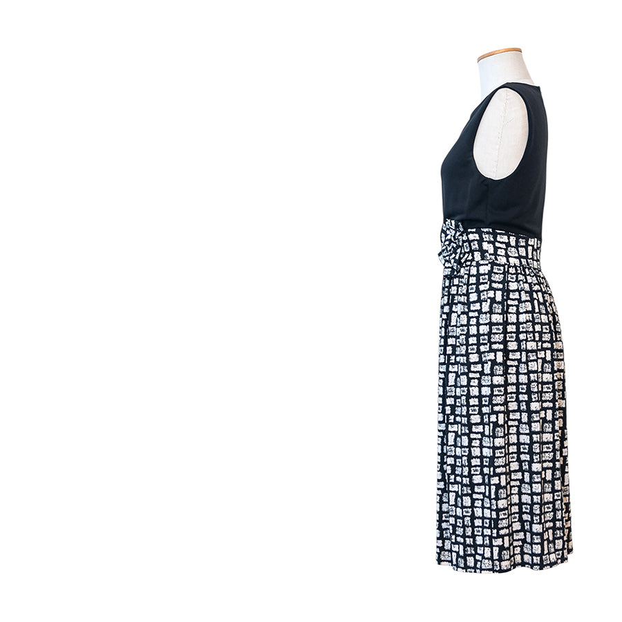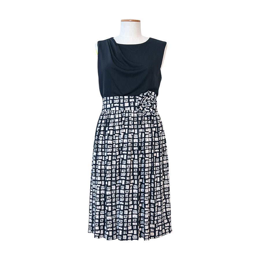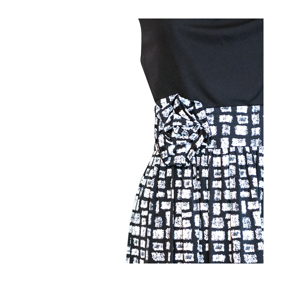 Abito Emme Marella con top nero drappeggiato e gonna plissettata a stampa geometrica in bianco e nero e fiore applicato in vita.