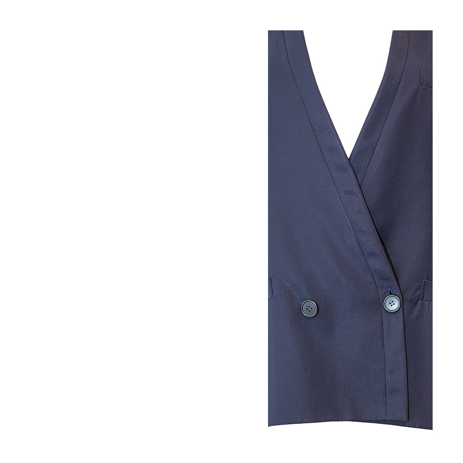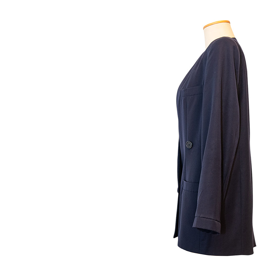 Blazer vintage ’80/’90 Erreuno in lana blu notte. Linea doppiopetto minimal con bottoni tono su tono e tasche applicate. Il taglio leggermente over e la scollatura profonda lo rendono estremamente versatile.