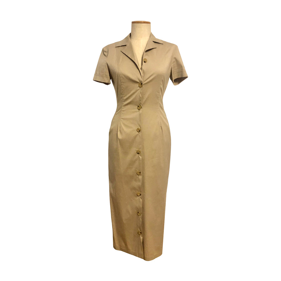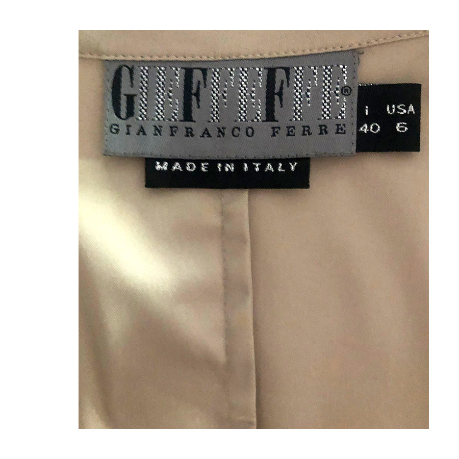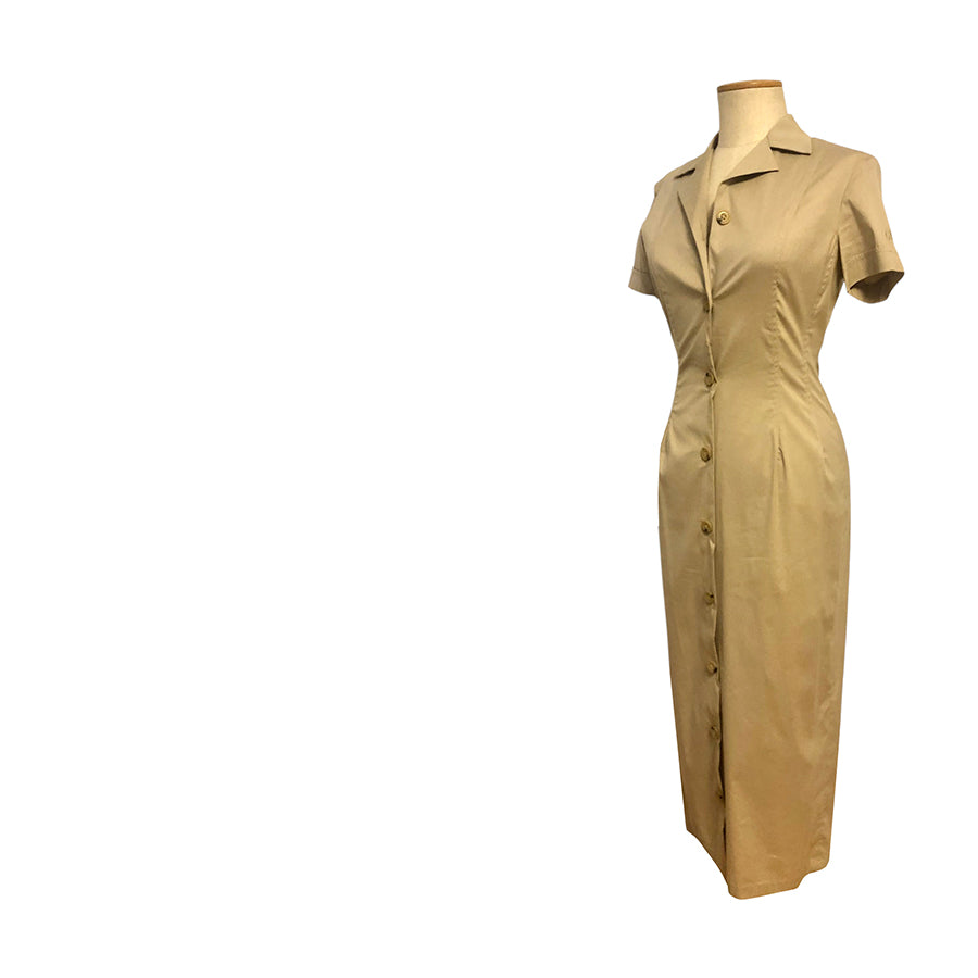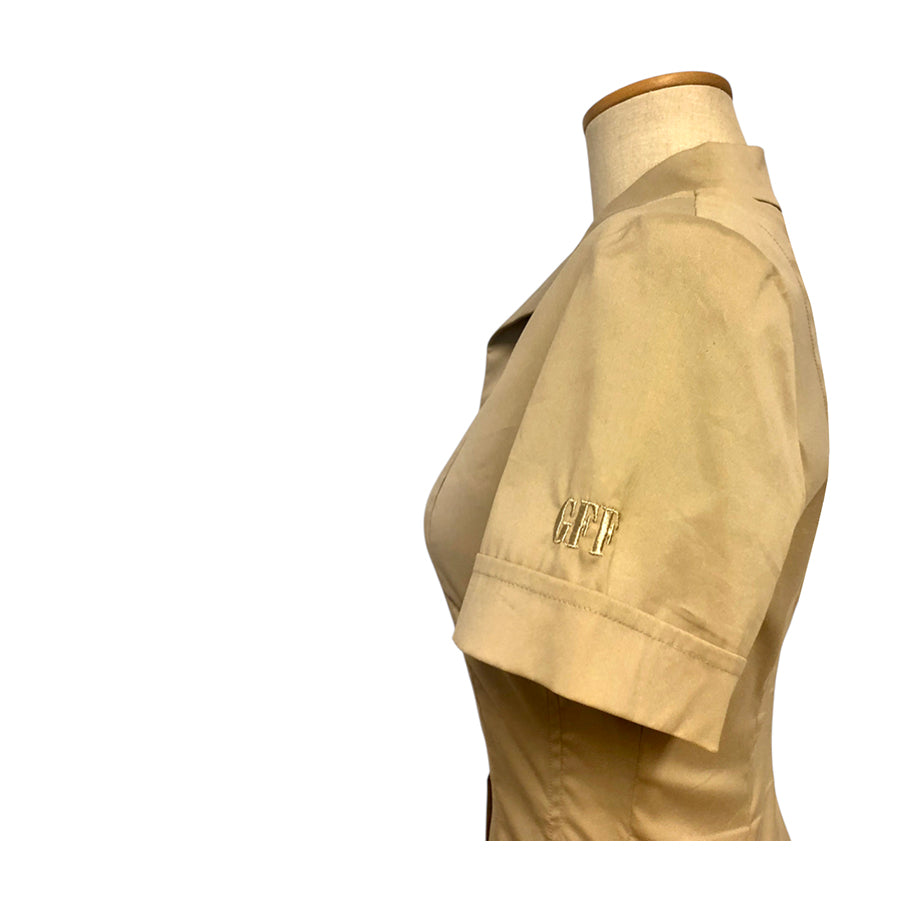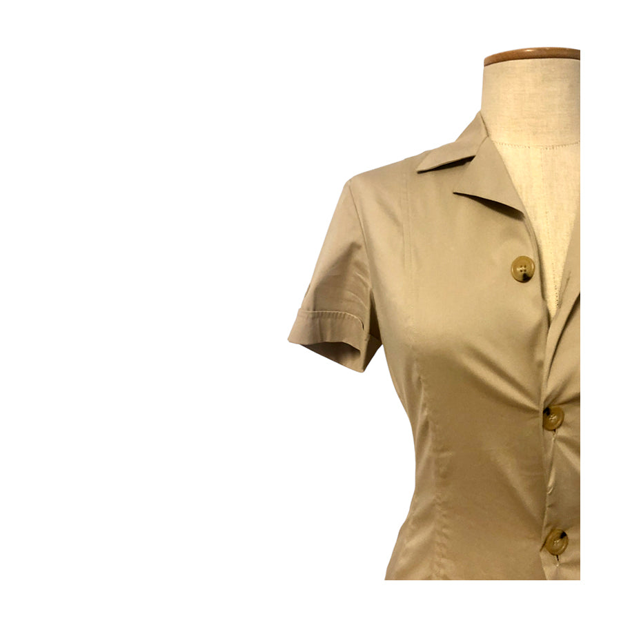 Chemisier vintage ’90 Gianfranco Ferré in cotone nocciola. Silhouette aderente, colletto a revers strutturato, chiusura frontale con bottoni in tono, maniche corte con logo GFT ricamato.