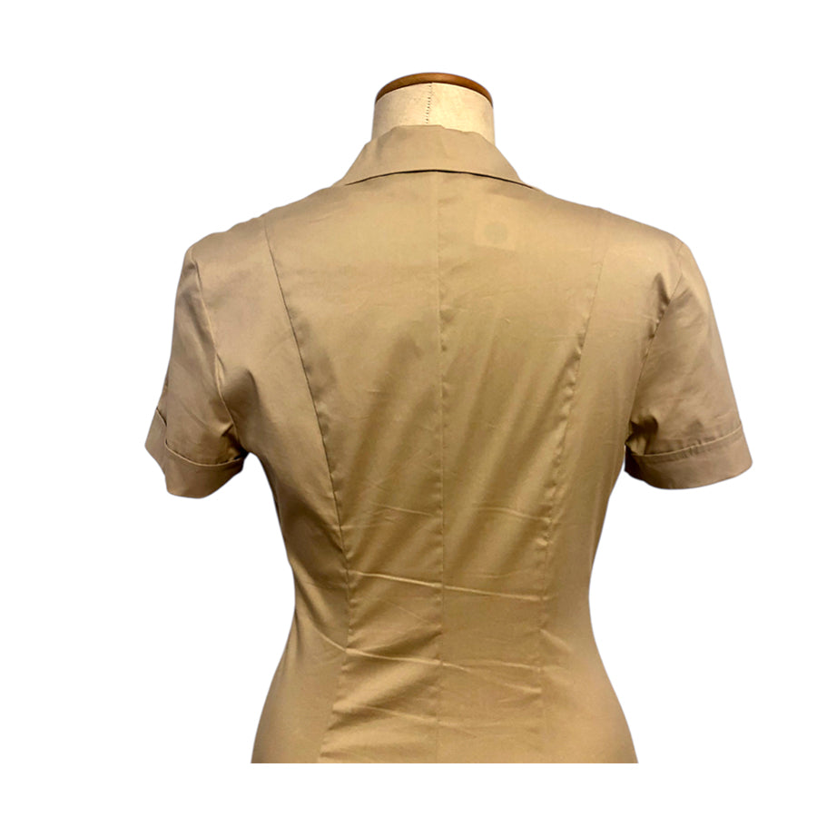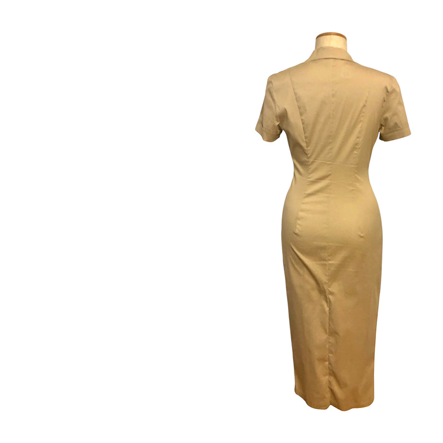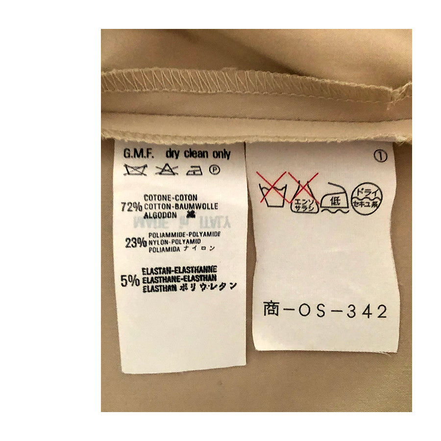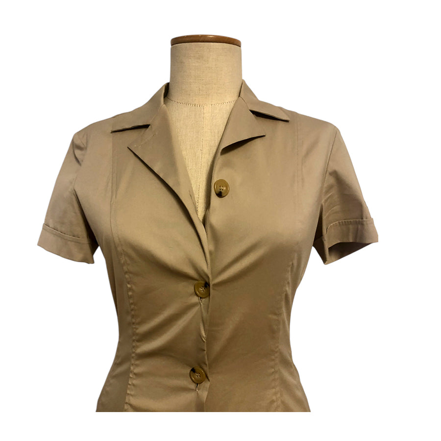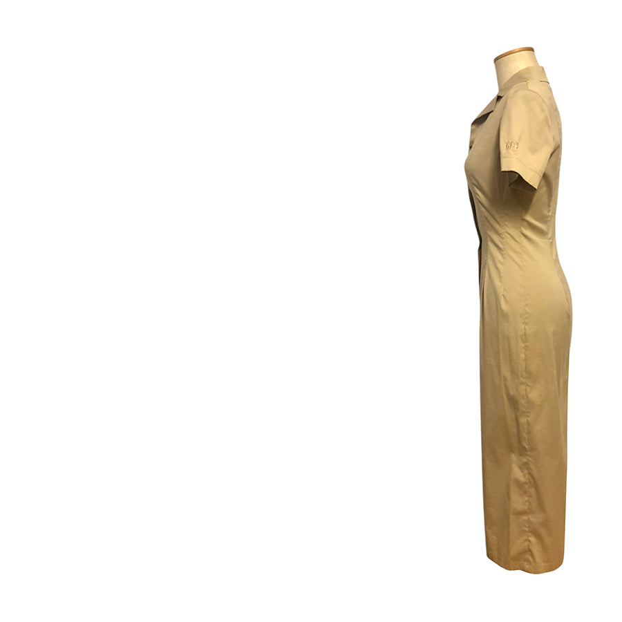 Chemisier vintage ’90 Gianfranco Ferré in cotone nocciola. Silhouette aderente, colletto a revers strutturato, chiusura frontale con bottoni in tono, maniche corte con logo GFT ricamato.