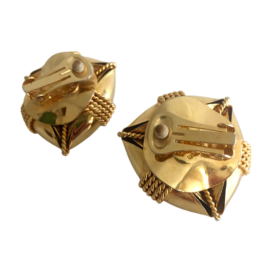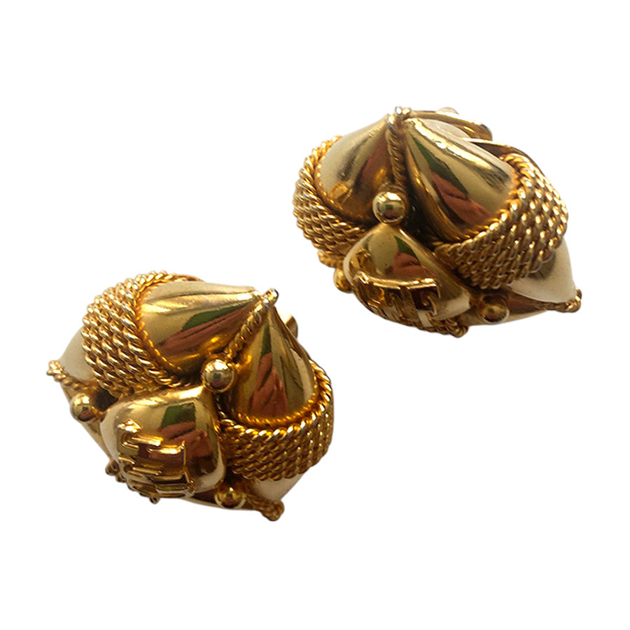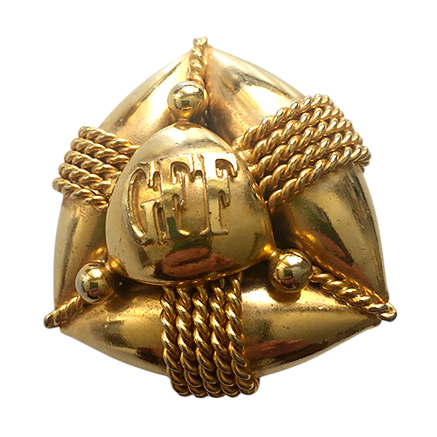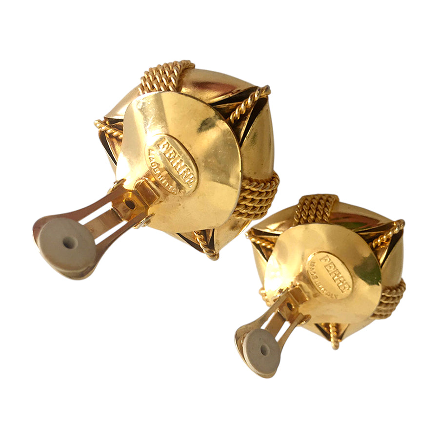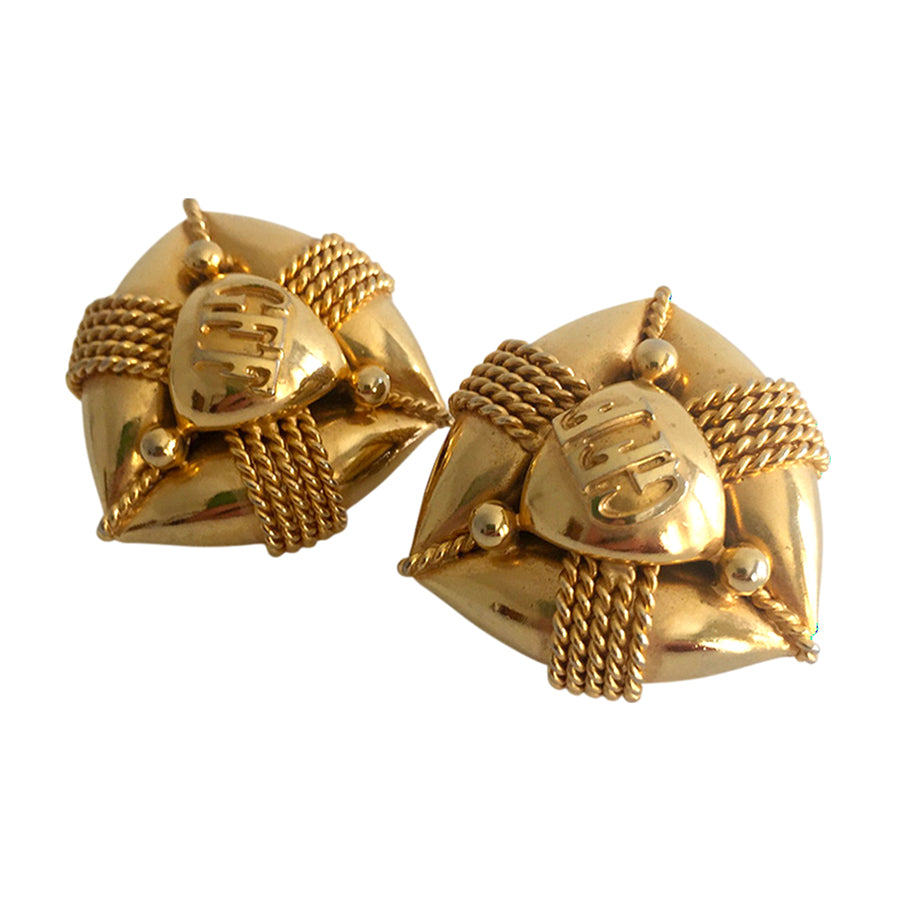 Orecchini vintage ‘80 a clip firmati Gianfranco Ferré, realizzati in metallo dorato lucido. Design scultoreo con intrecci in corda metallica e centrale a forma di scudo con logo inciso.