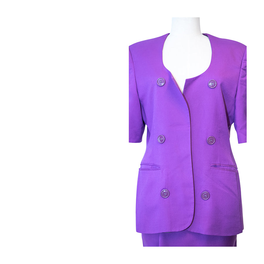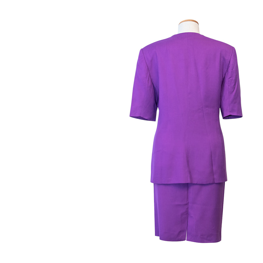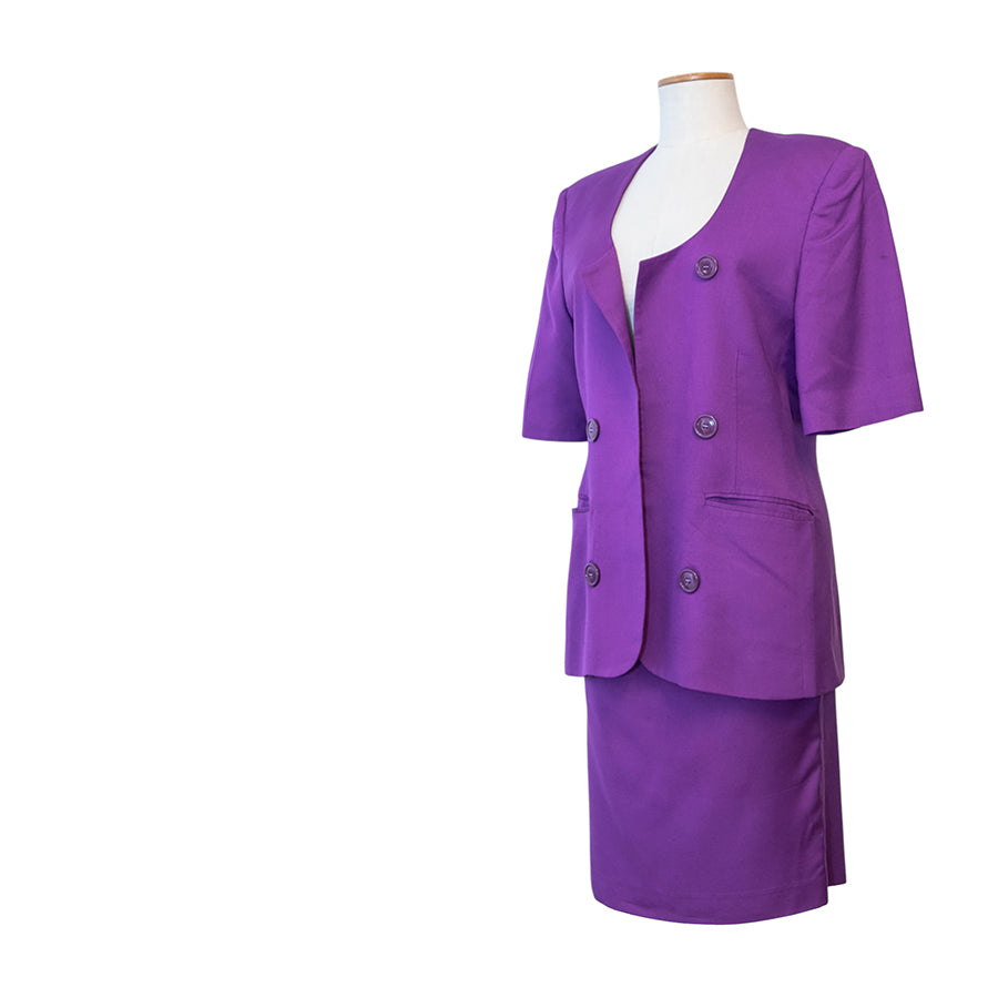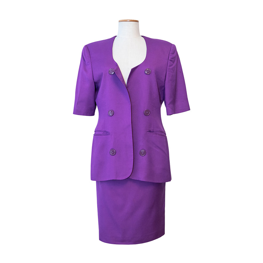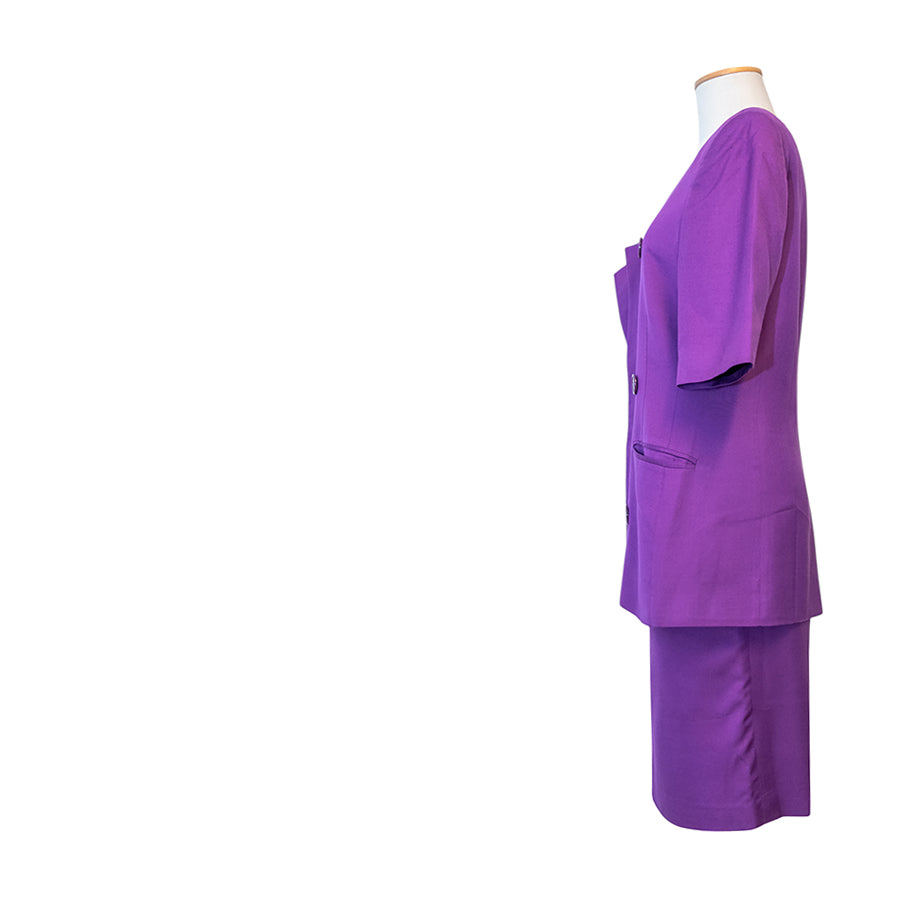 Completo vintage anni '80/'90 Studio 0001 by Gianfranco Ferré dalla intramontabile qualità sartoriale italiana. Realizzato in viscosa fluida è composto da giacca aperta con bottoni decorativi a mezza manica e scollo arrotondato e gonna dritta coordinata.
