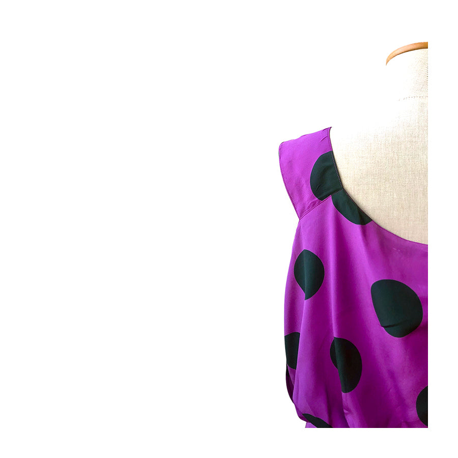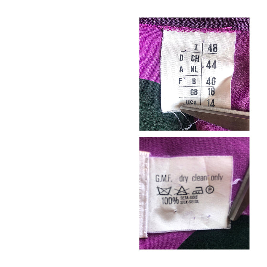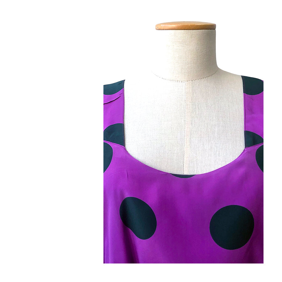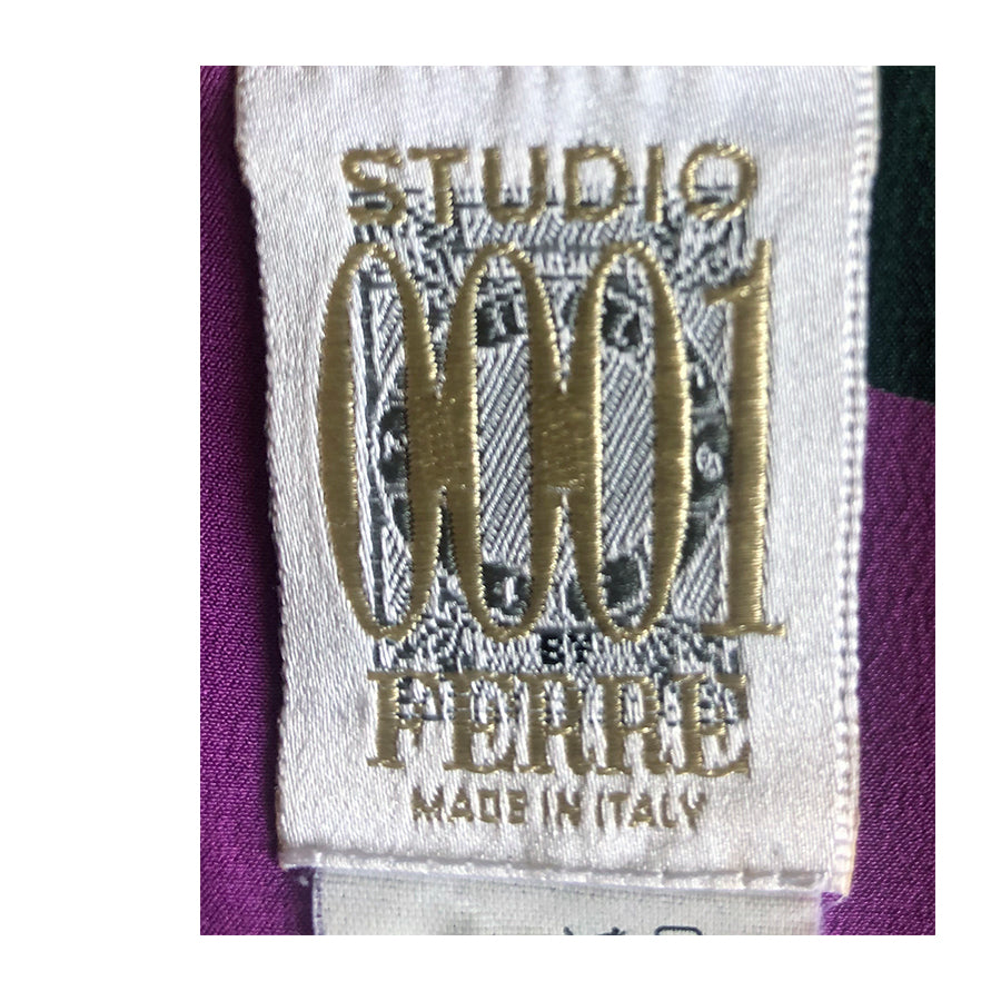 Top sottogiacca oversize in seta Studio 0001 Gianfranco Ferré con macropois verde bosco su base viola. Scollatura quadrata, linea blusante con baschina strutturata e zip nascosta. Vintage ’80/’90: un capo iconico e da collezione.