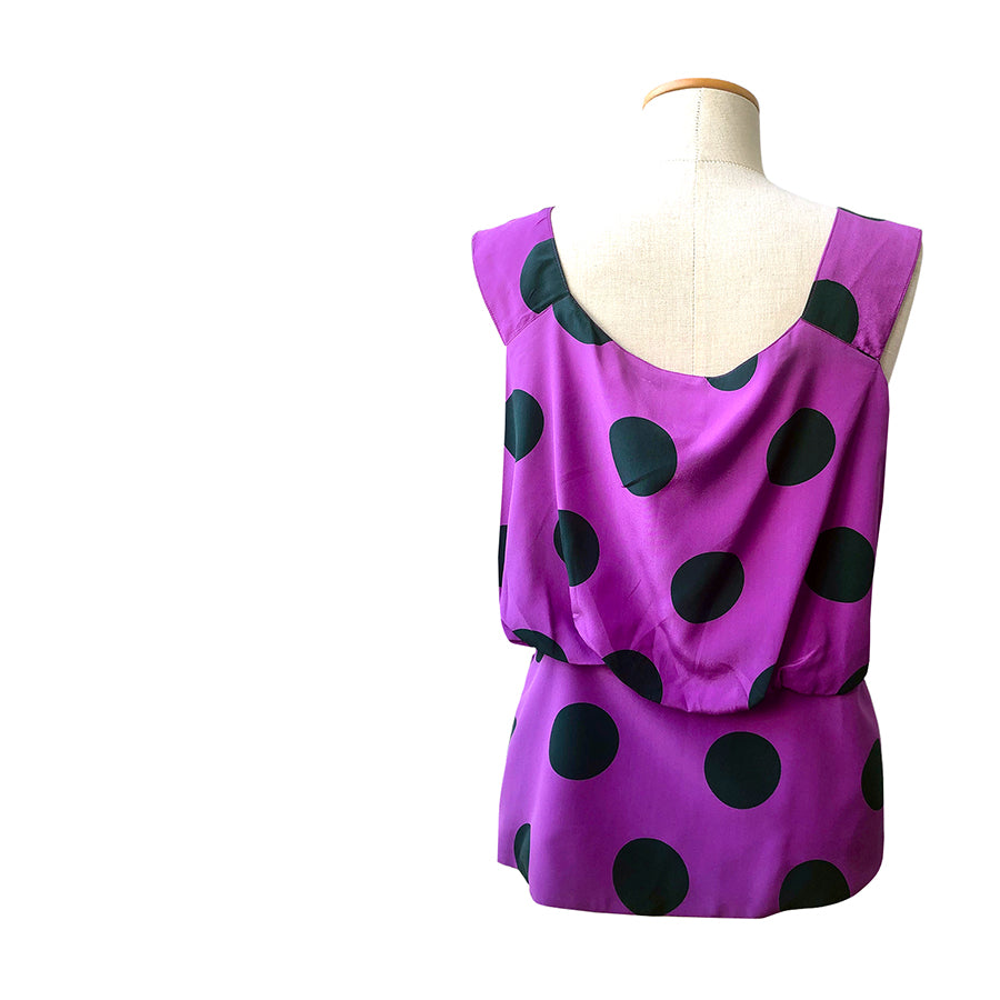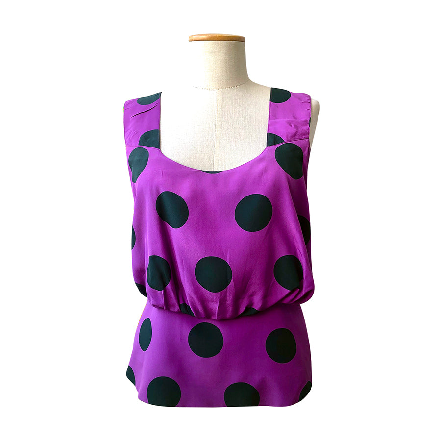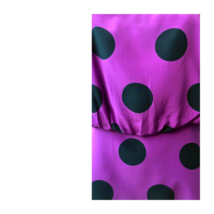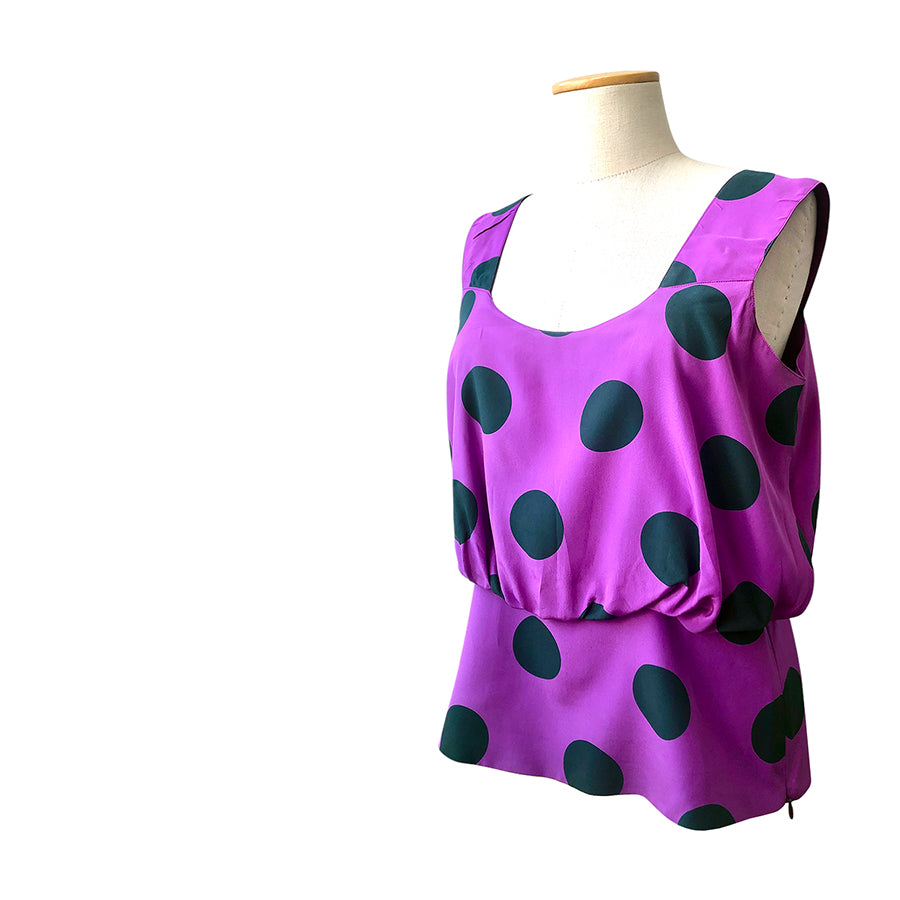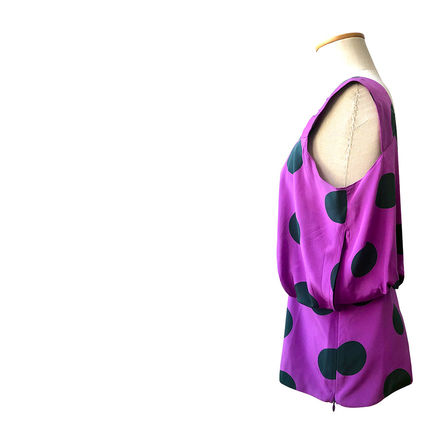 Top sottogiacca oversize in seta Studio 0001 Gianfranco Ferré con macropois verde bosco su base viola. Scollatura quadrata, linea blusante con baschina strutturata e zip nascosta. Vintage ’80/’90: un capo iconico e da collezione.