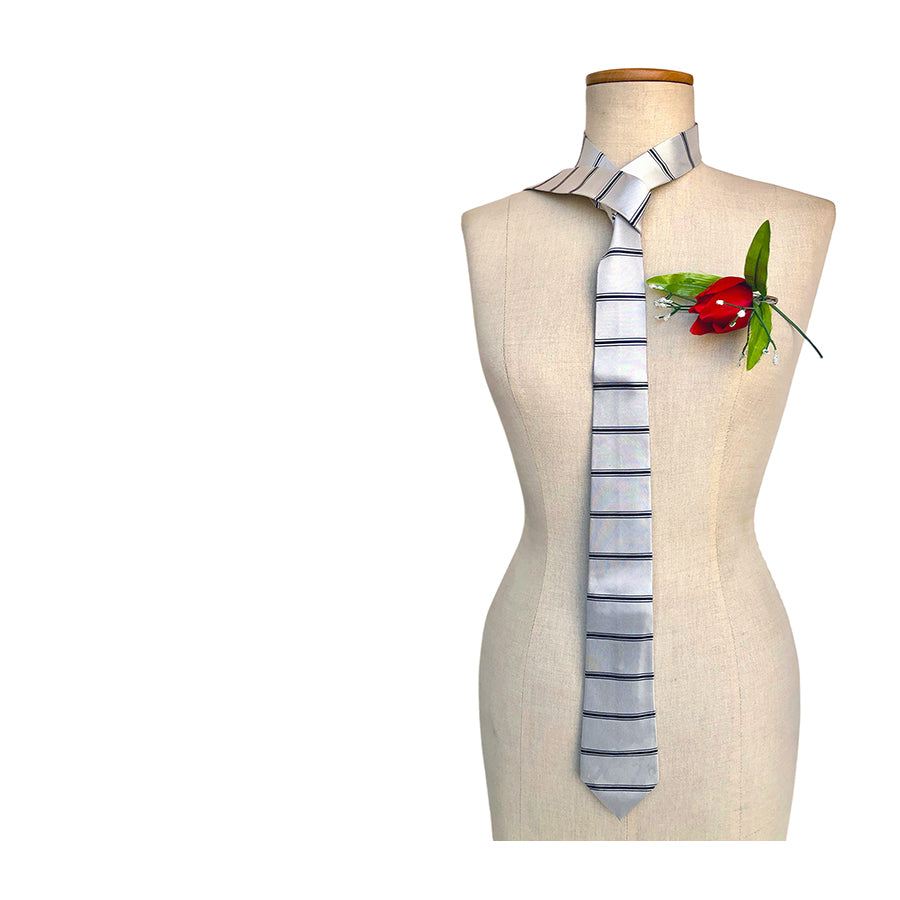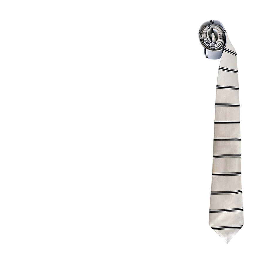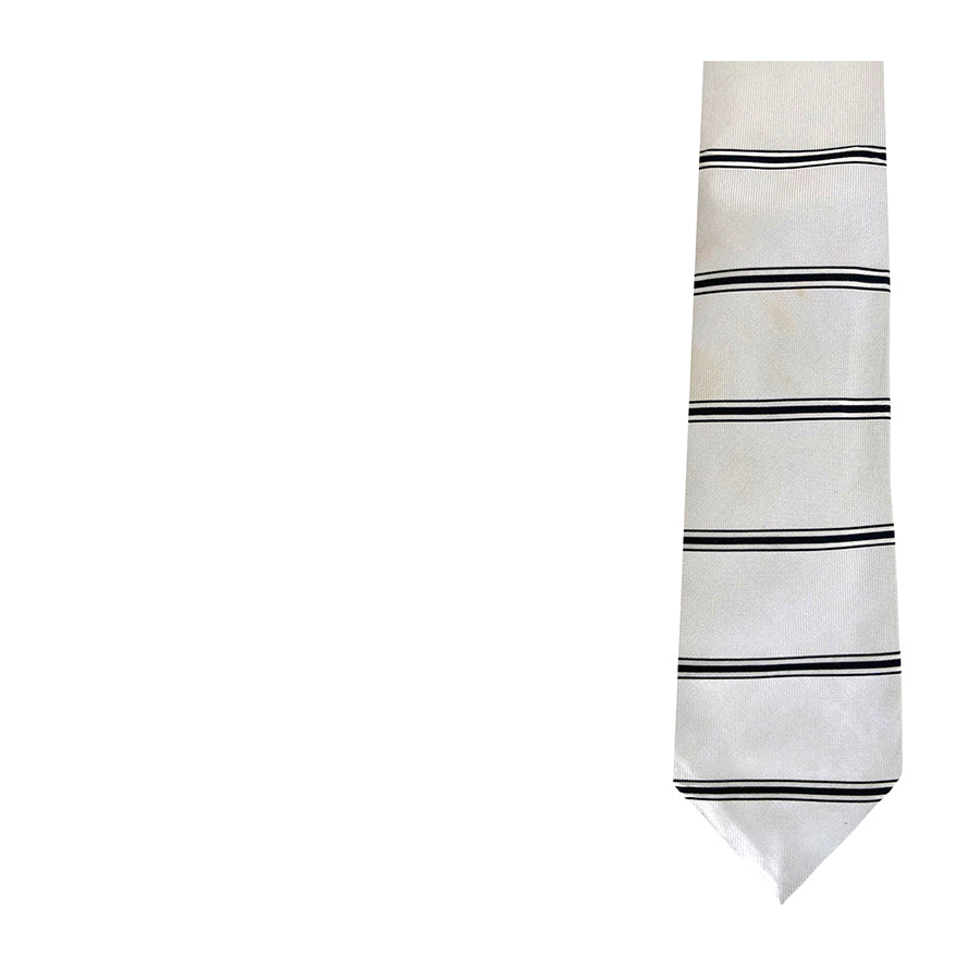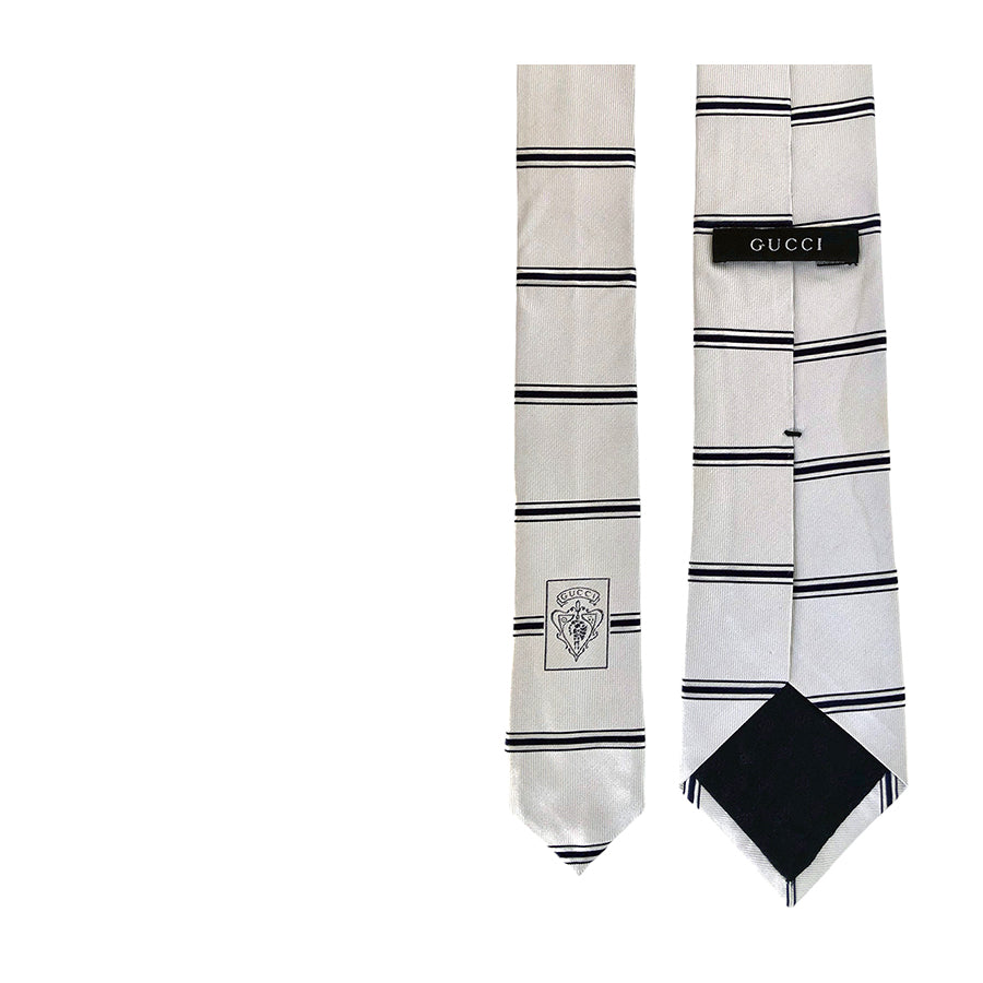 Cravatta vintage di Gucci in seta pura con sottili strisce nere su sfondo grigio argento chiaro. Raffinata e versatile, è un classico senza tempo. Si consiglia lavaggio a secco.