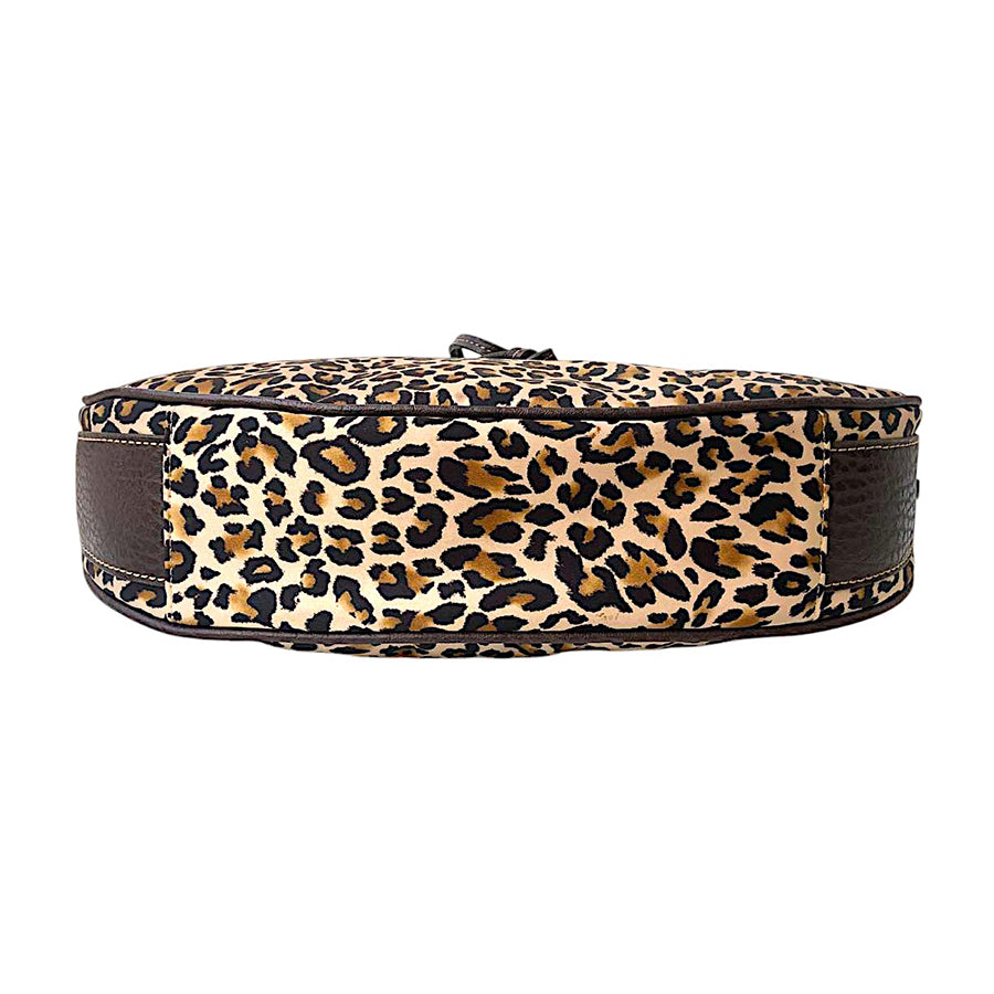 Hobo bag GUESS in stampa animalier leopardata in tessuto effetto suede con finiture in ecopelle marrone scuro e dettagli metallici dorati. Design a mezzaluna con doppio manico regolabile e laccio decorativo frontale.