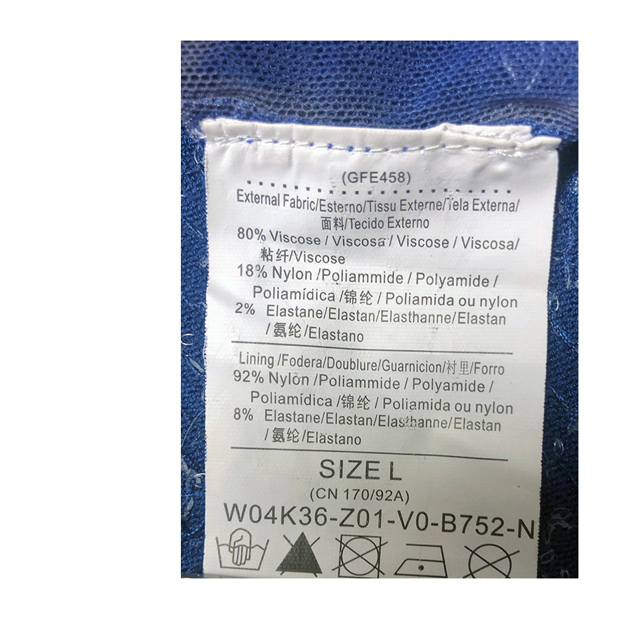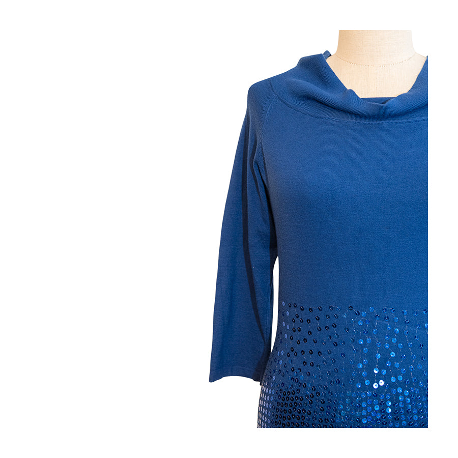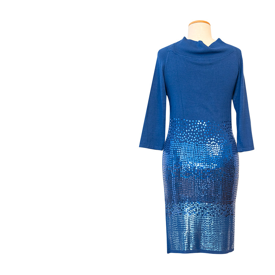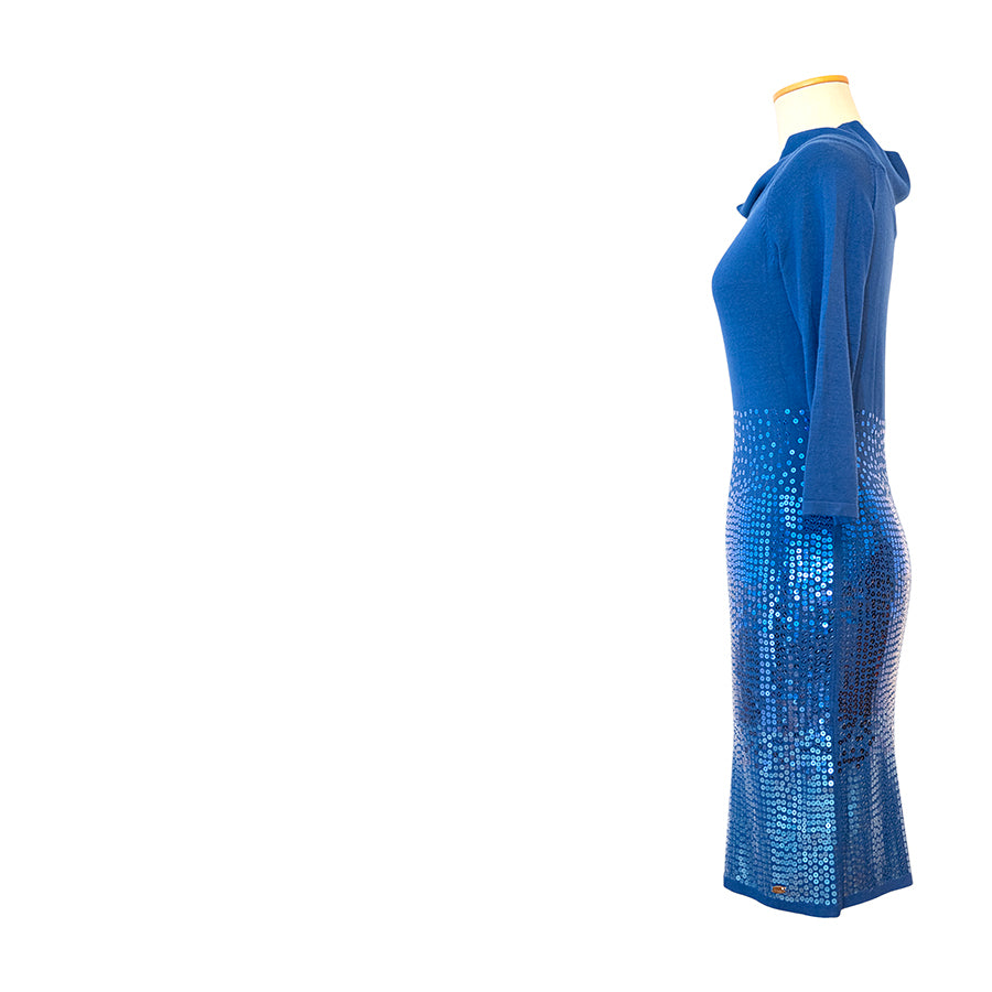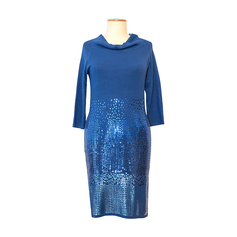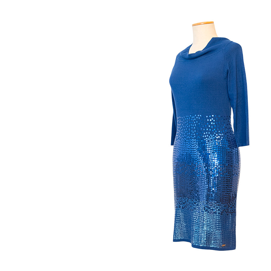 Tubino Guess in tonalità blu intenso in viscosa e elastan. Il design a maniche a 3/4 è impreziosito da un colletto morbido drappeggiato e dalla parte inferiore interamente ricoperta di paillettes blu. Vestibilità aderente che valorizza la silhouette.
