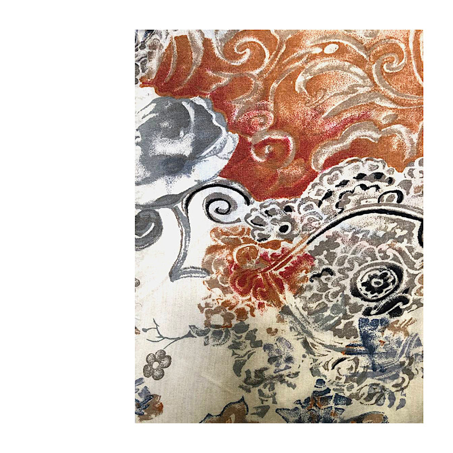 Aloha shirt vintage Jean Maseric in puro stile anni ‘90 con fantasia floreale e paisley nei toni del ruggine, blu, panna e grigio. Ha una vestibilità rilassata, maniche corte e taschino sul petto.