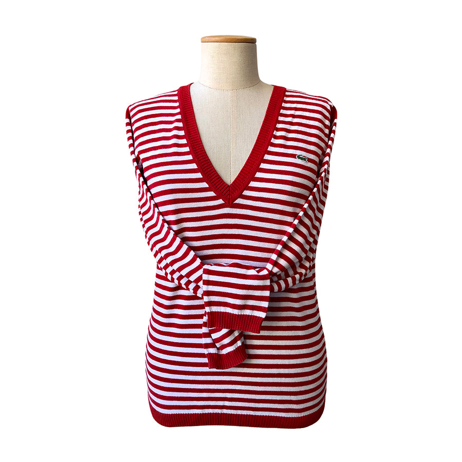 Pull vintage Lacoste in cotone con iconico motivo a righe rosse e bianche, scollo a V profondo e logo coccodrillo ricamato sul petto.