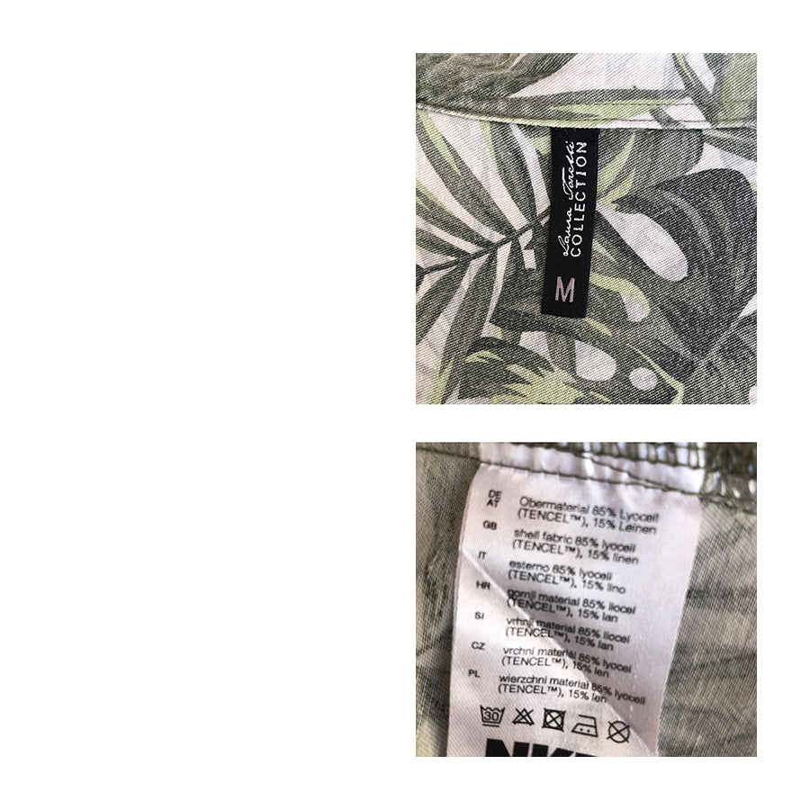 Camicia tropicale, taglia M (vestibilità comoda). Stampa all-over con foglie tropicali nei toni del verde. Perfetta per l’estate o look vacanza