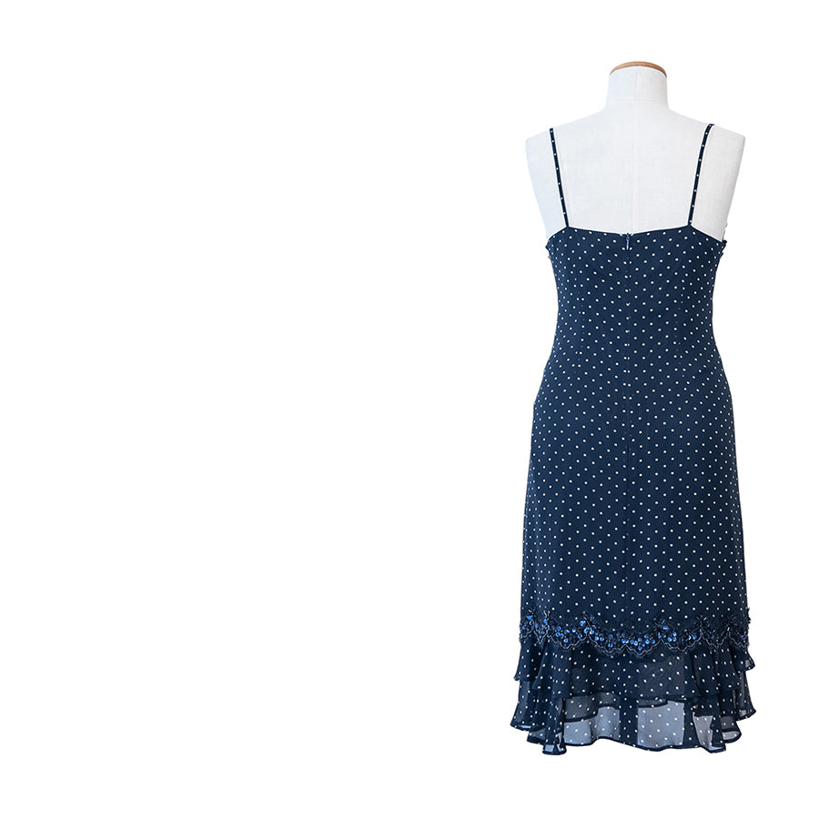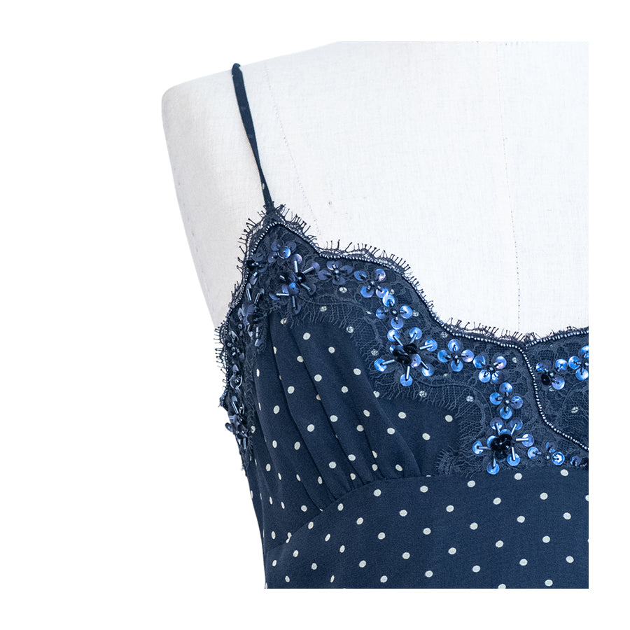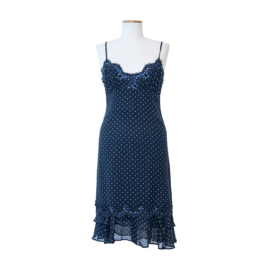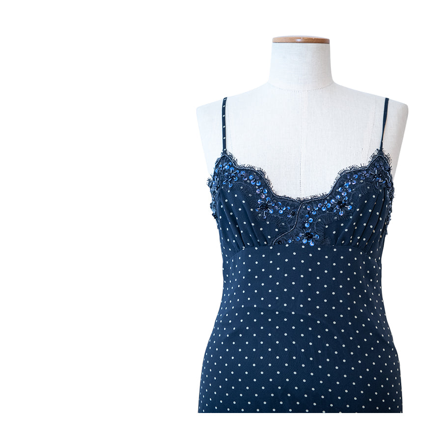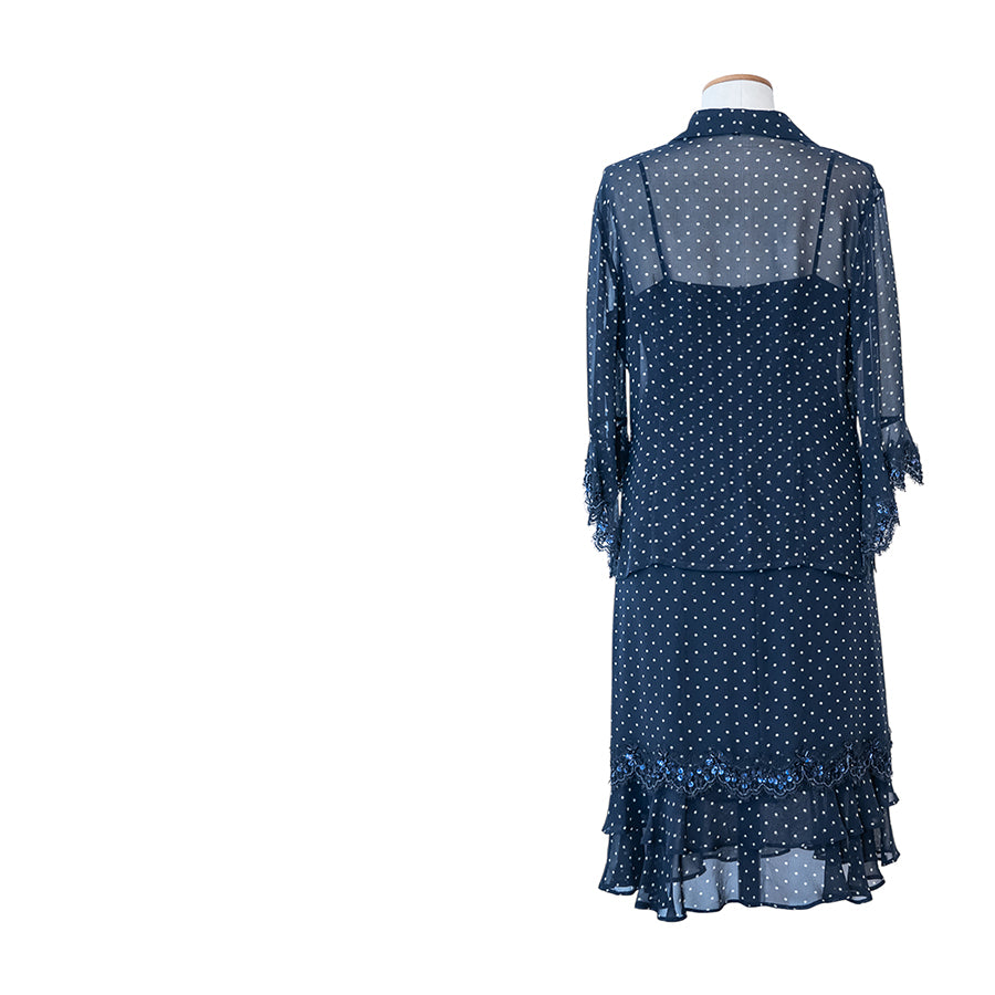 Completo 2 pezzi vintage Luisa Spagnoli in pura seta blu navy a pois bianchi, composto da abito sottoveste (taglia 42 IT) e giacca coordinata (taglia 44 IT). L’abito presenta spalline sottili, scollo decorato con ricami e paillettes tono su tono e orlo a balze leggermente svasato. La giacca, in chiffon di seta semitrasparente, ha maniche a 3/4 con dettagli in pizzo sul fondo e chiusura aperta.