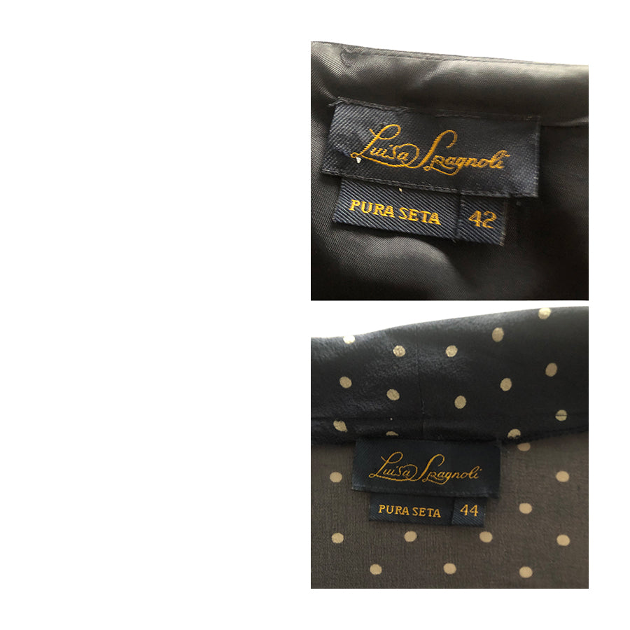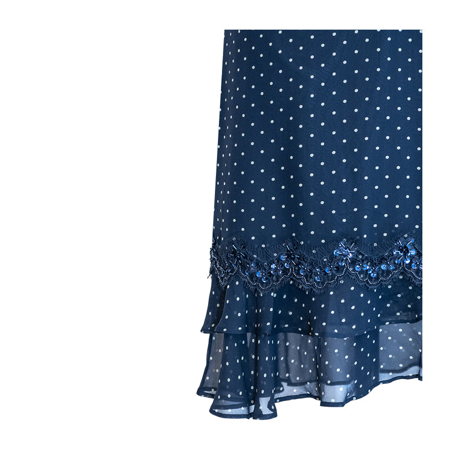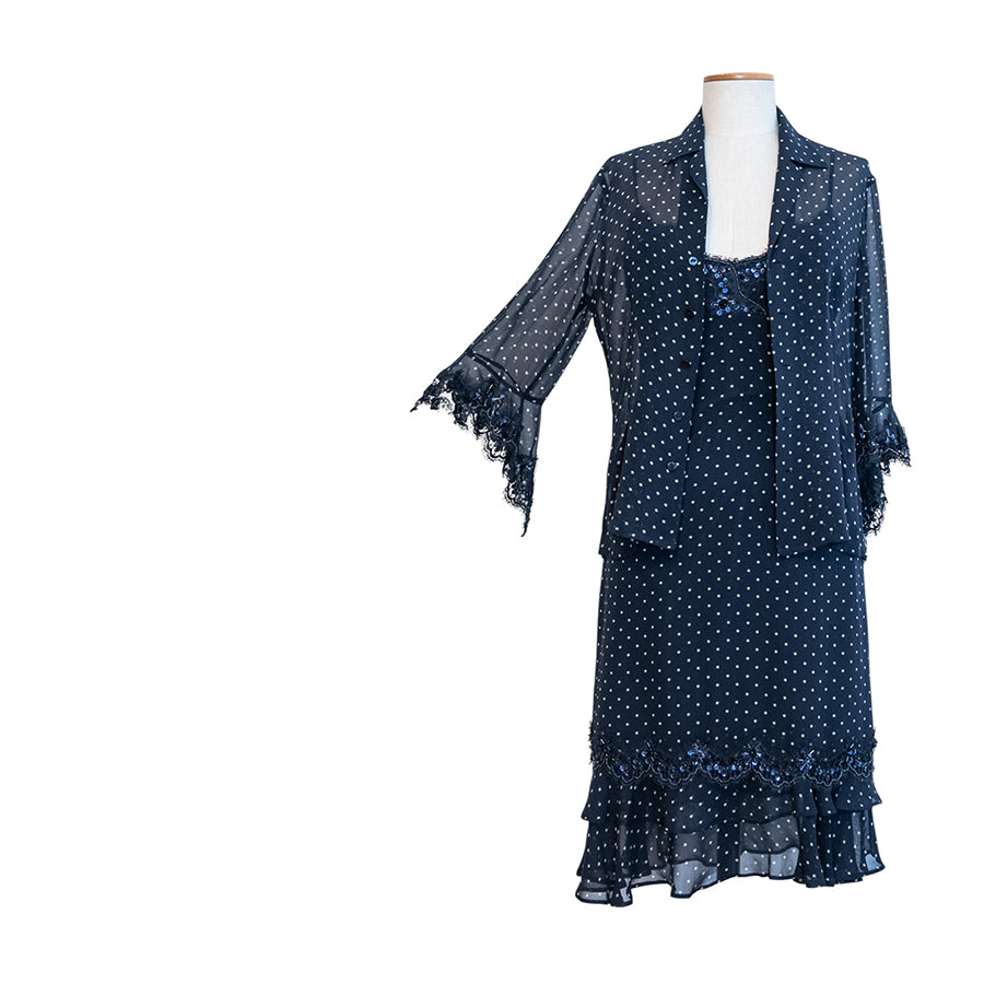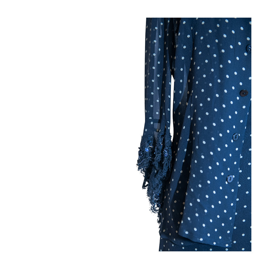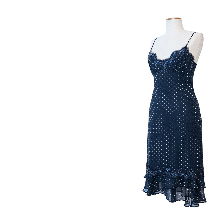 Completo 2 pezzi vintage Luisa Spagnoli in pura seta blu navy a pois bianchi, composto da abito sottoveste (taglia 42 IT) e giacca coordinata (taglia 44 IT). L’abito presenta spalline sottili, scollo decorato con ricami e paillettes tono su tono e orlo a balze leggermente svasato. La giacca, in chiffon di seta semitrasparente, ha maniche a 3/4 con dettagli in pizzo sul fondo e chiusura aperta.