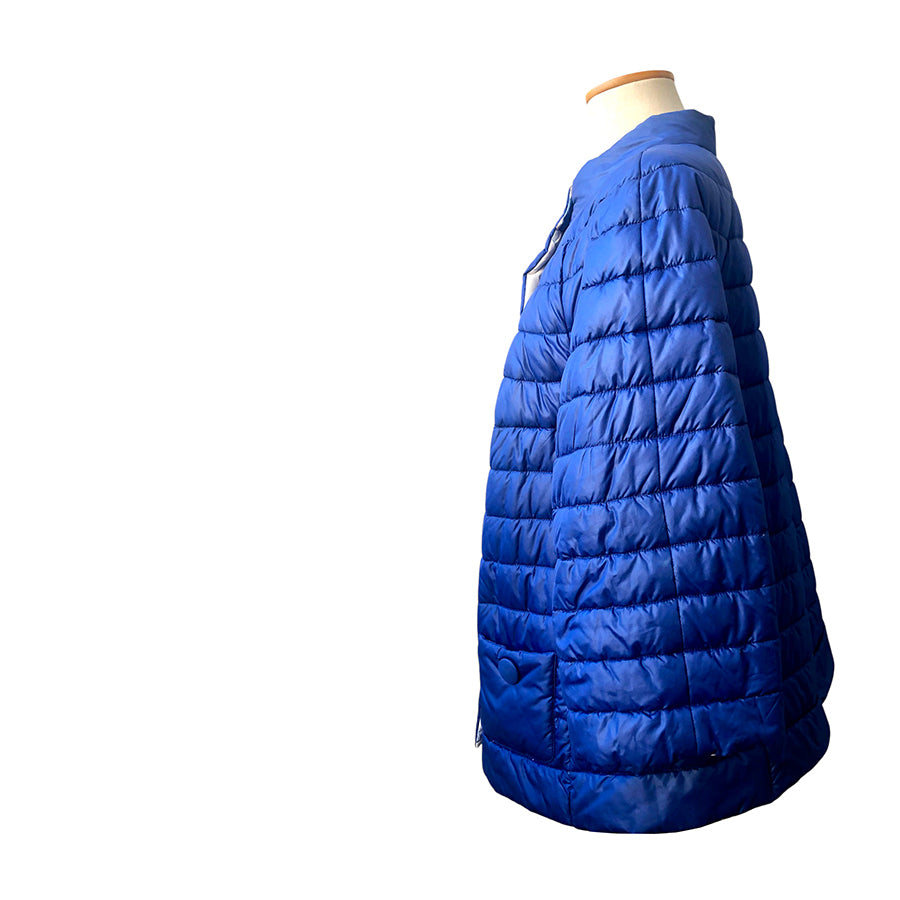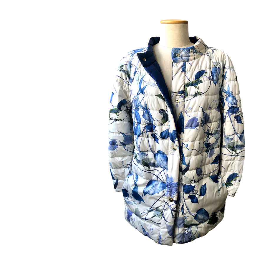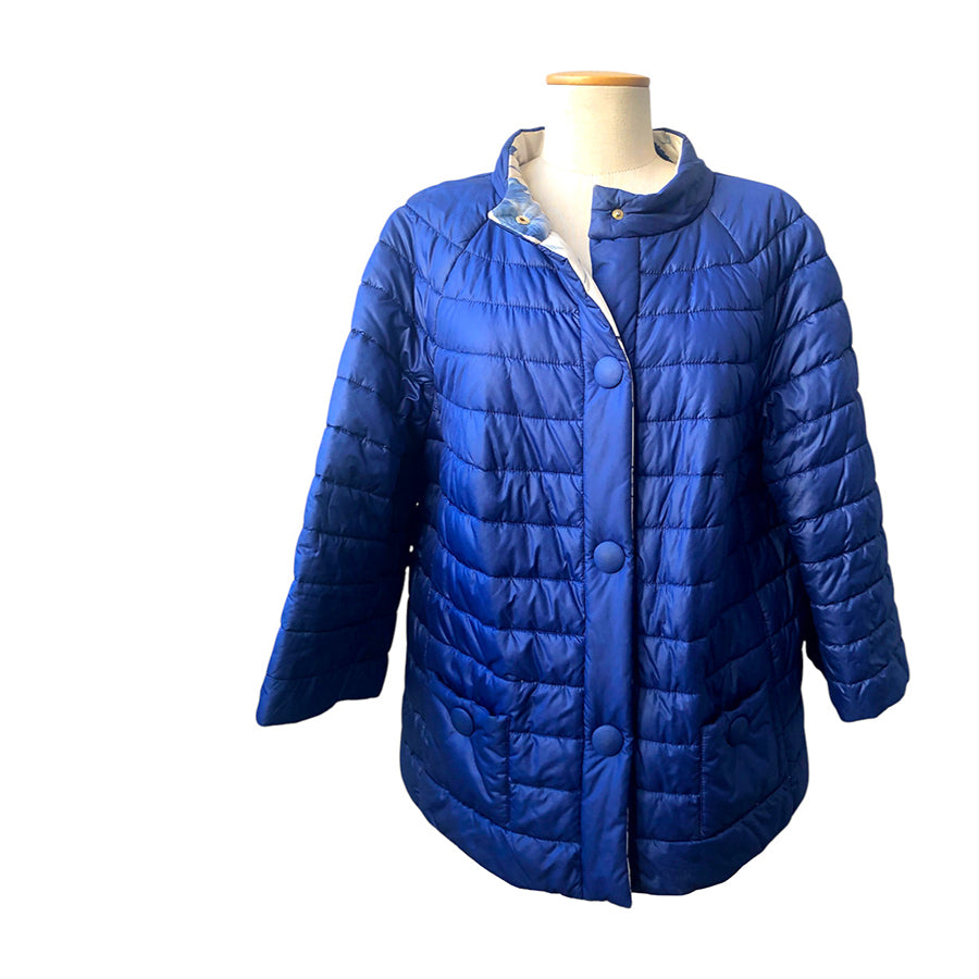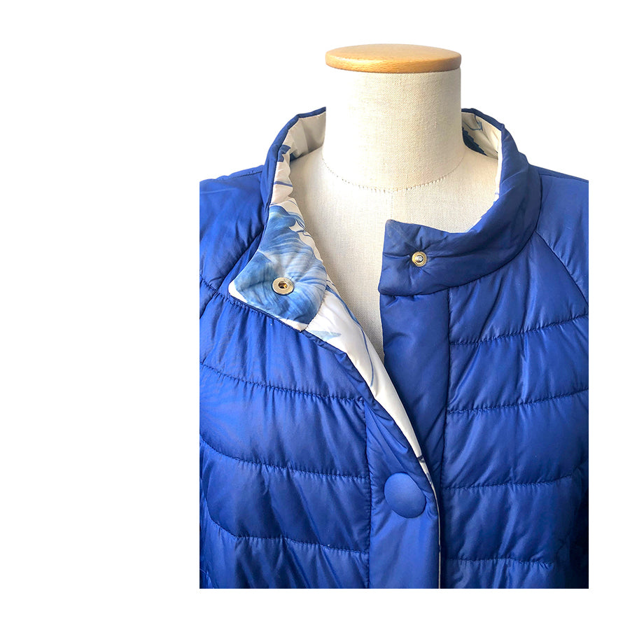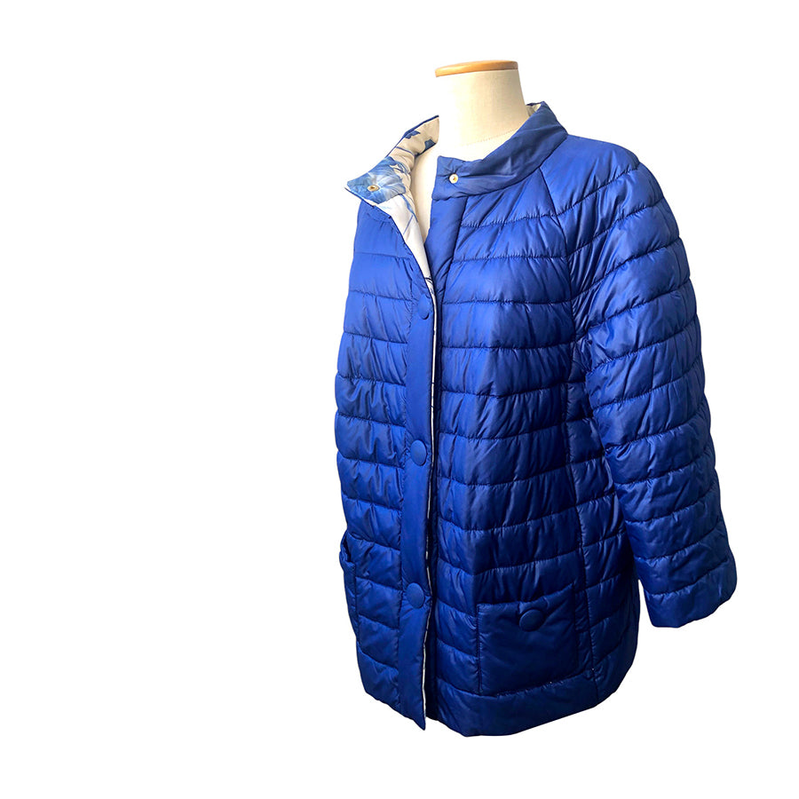 Piumino double face Luisa Spagnoli in tessuto trapuntato, leggero ma caldo. Un capo versatile che offre due look in uno: da un lato in tinta unita blu elettrico, dall’altro con stampa floreale. Chiusura frontale con bottoni automatici, tasche laterali pratiche e taglio dritto leggermente svasato.