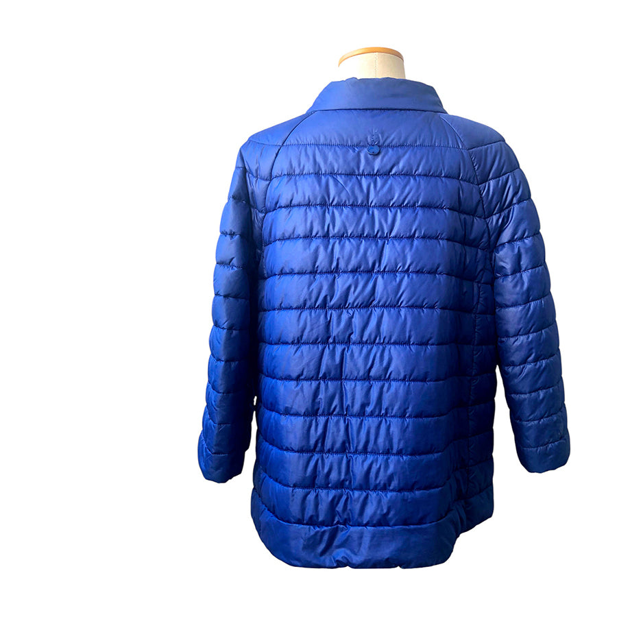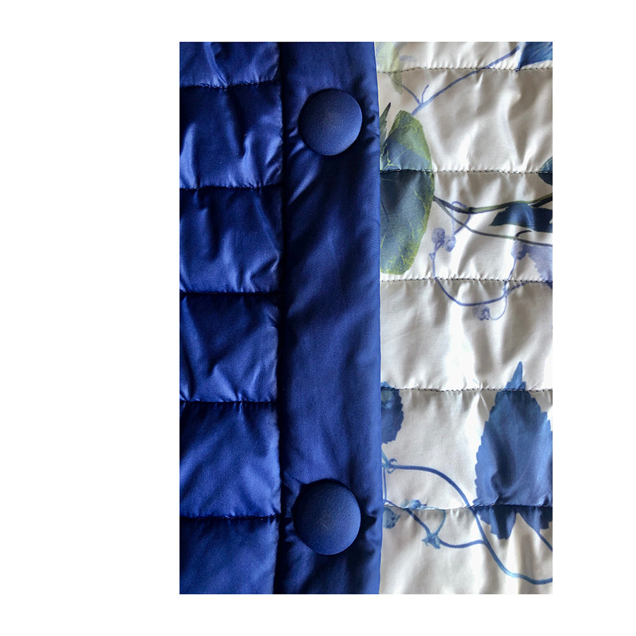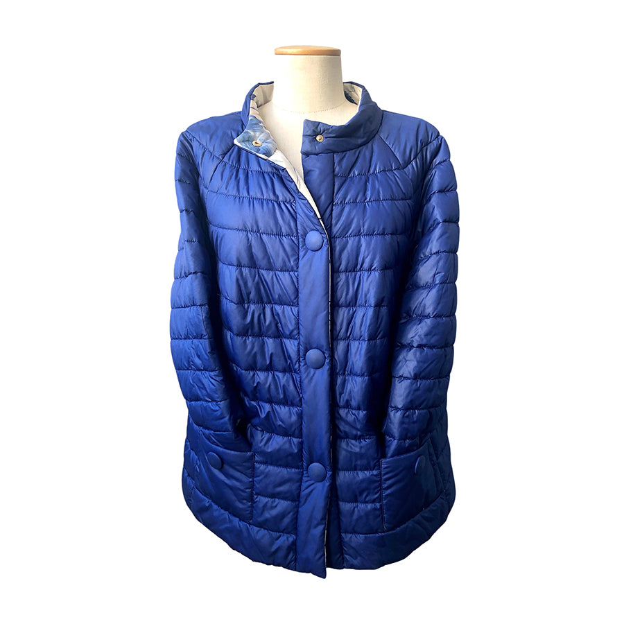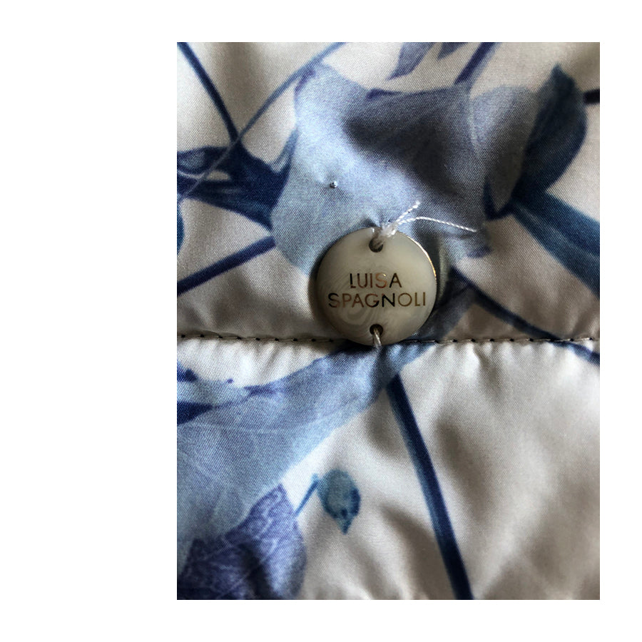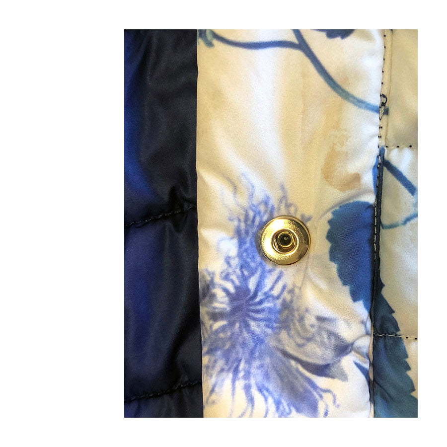 Piumino double face Luisa Spagnoli in tessuto trapuntato, leggero ma caldo. Un capo versatile che offre due look in uno: da un lato in tinta unita blu elettrico, dall’altro con stampa floreale. Chiusura frontale con bottoni automatici, tasche laterali pratiche e taglio dritto leggermente svasato.