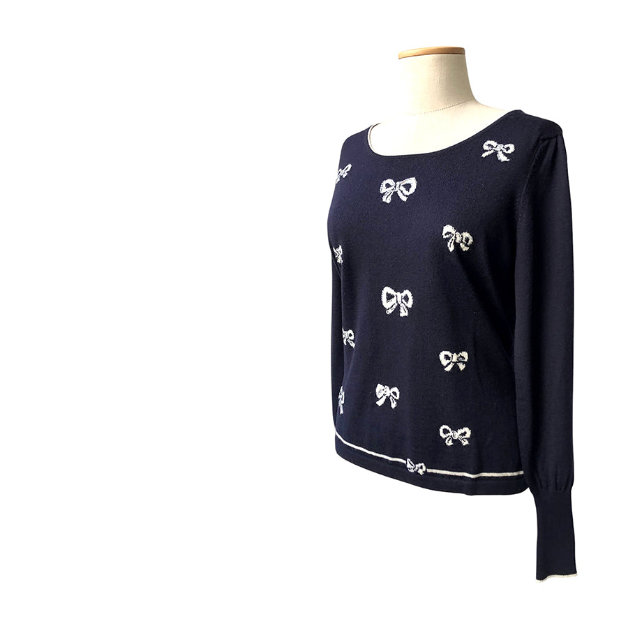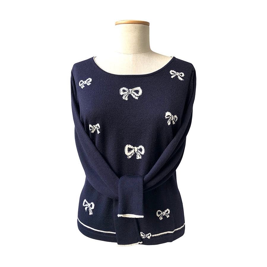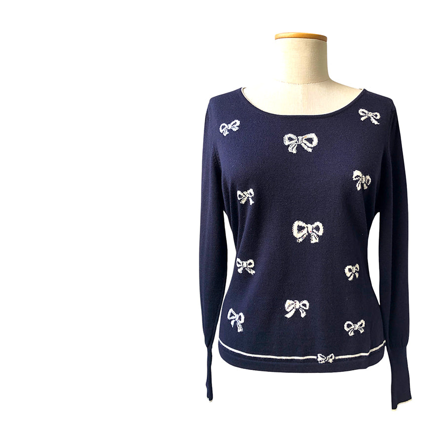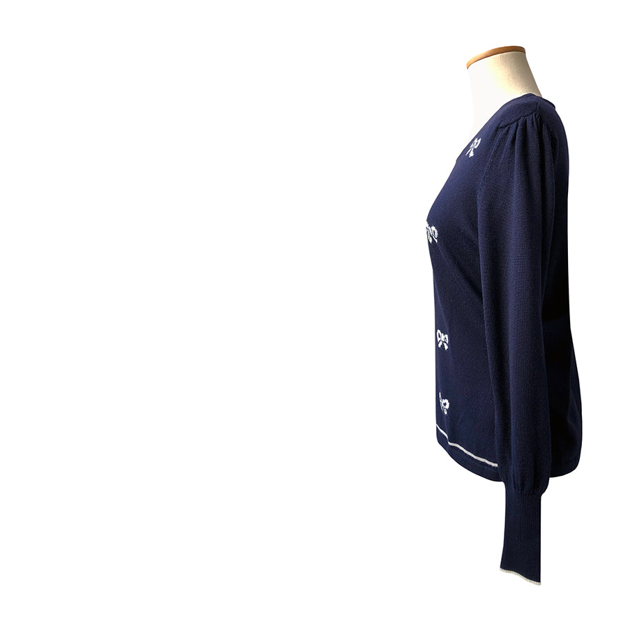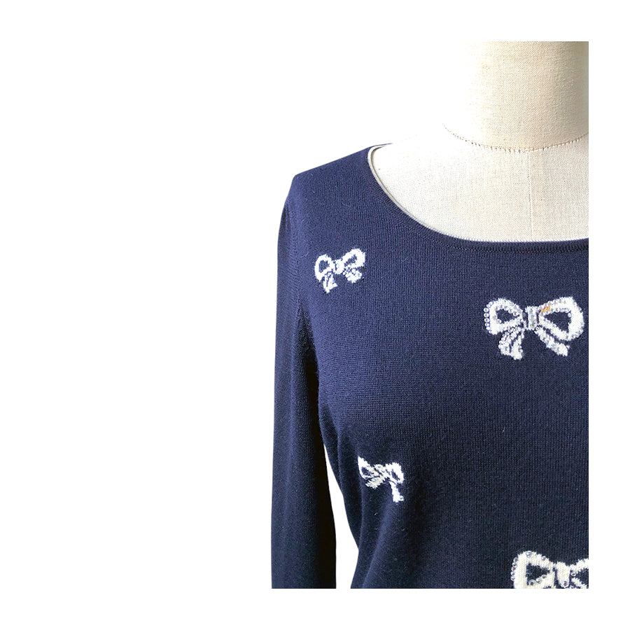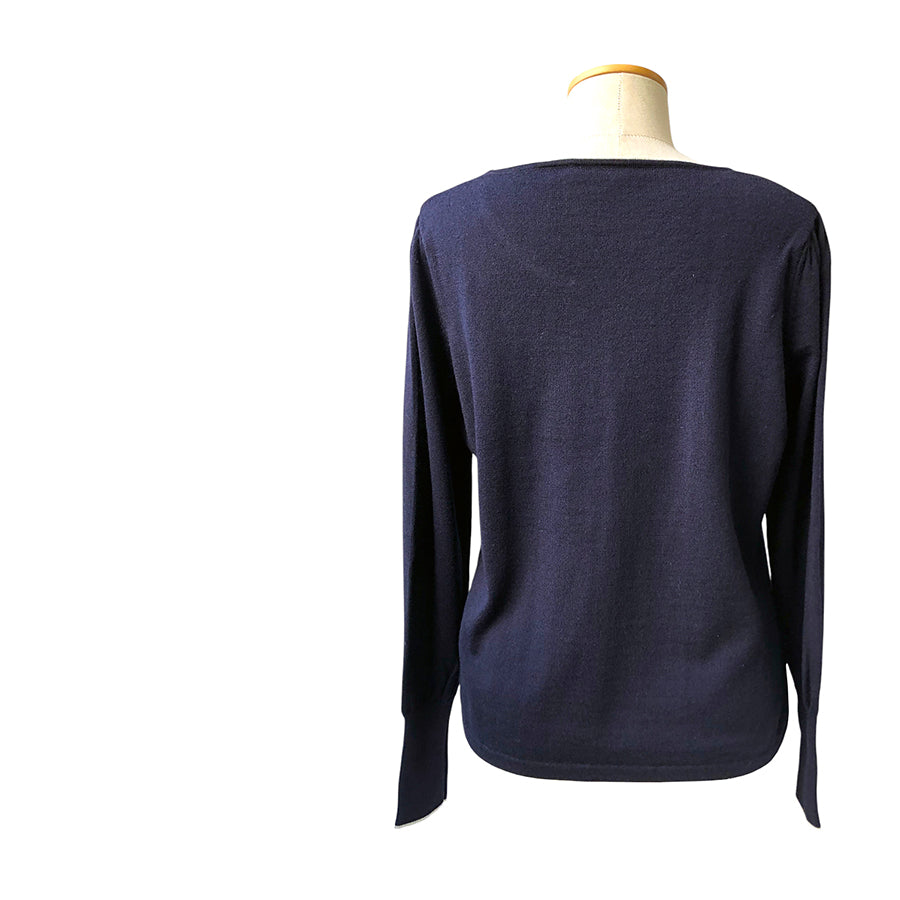 Pull vintage ’80–’90 Luisa Spagnoli in lana blu notte con ricami color panna. Linea morbida, scollo leggermente ampio e maniche con dettagli rifiniti. Caldo, comodo e versatile.