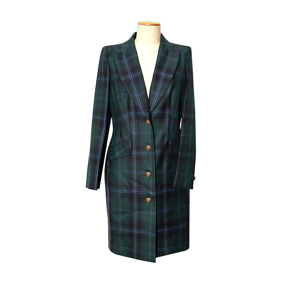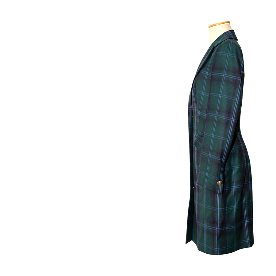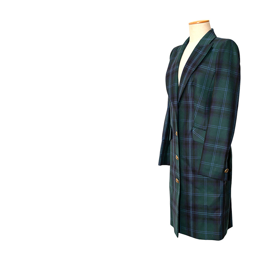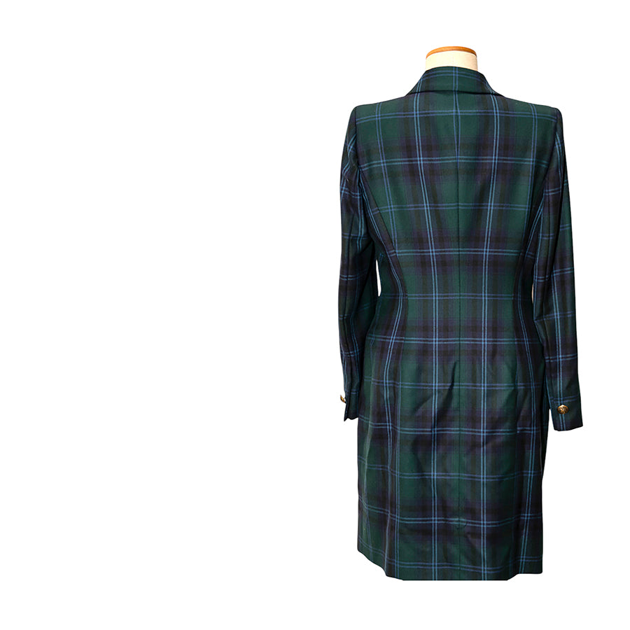 Redingote vintage realizzata in un pregiato tessuto a quadri scozzesi nei toni del verde bosco e blu notte dal taglio strutturato. La silhouette slanciata è enfatizzata dalla vita leggermente segnata e dalle spalle ben costruite, il colletto è a lancia e la chiusura con bottoni dorati logati. Presenta due tasche con pattina anteriori e una lunghezza al ginocchio che la rende versatile sia come cappotto leggero che come abito-giacca.