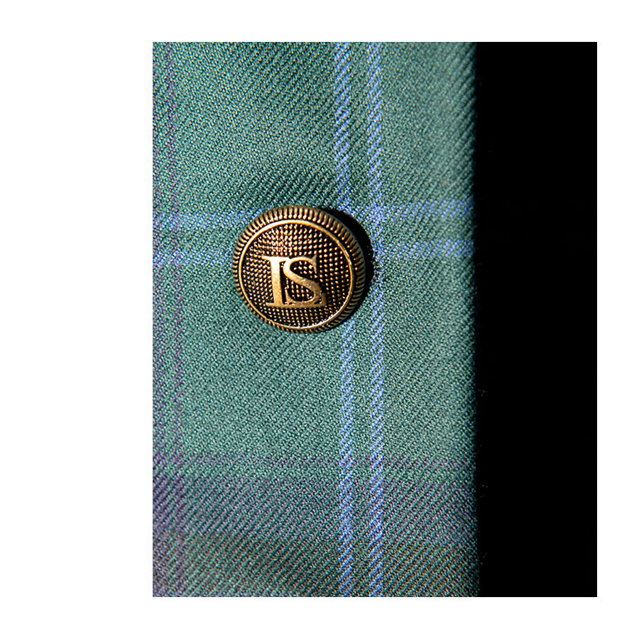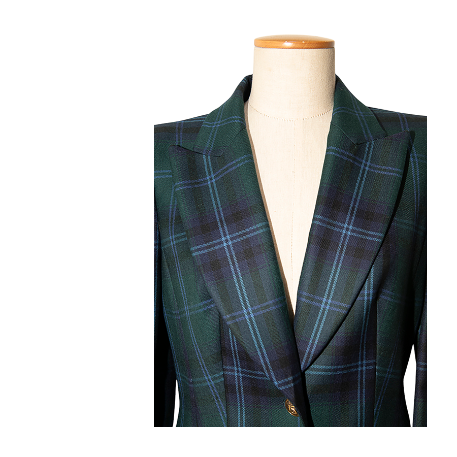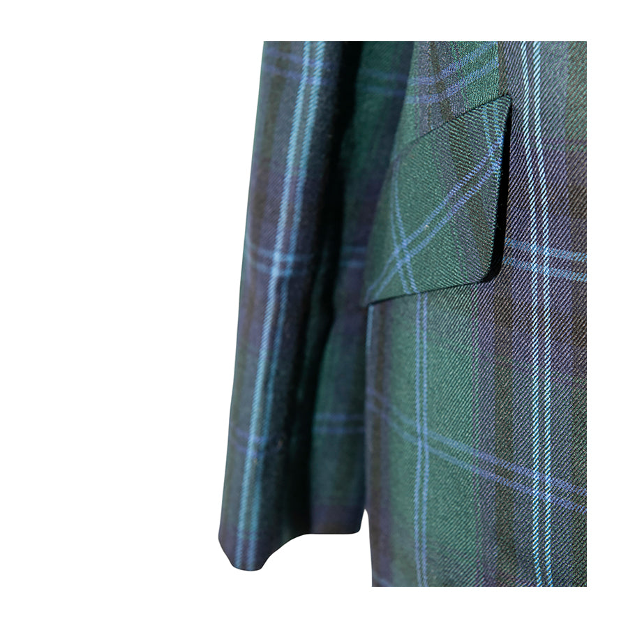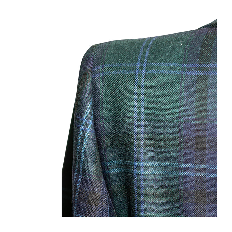Redingote vintage realizzata in un pregiato tessuto a quadri scozzesi nei toni del verde bosco e blu notte dal taglio strutturato. La silhouette slanciata è enfatizzata dalla vita leggermente segnata e dalle spalle ben costruite, il colletto è a lancia e la chiusura con bottoni dorati logati. Presenta due tasche con pattina anteriori e una lunghezza al ginocchio che la rende versatile sia come cappotto leggero che come abito-giacca.
