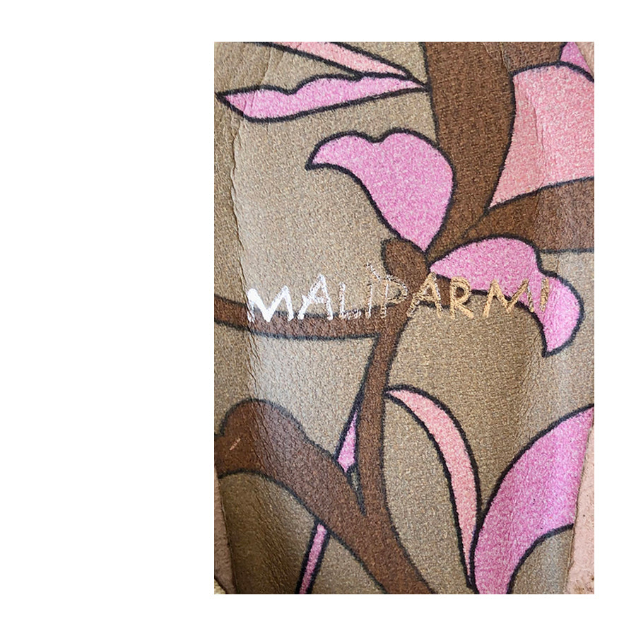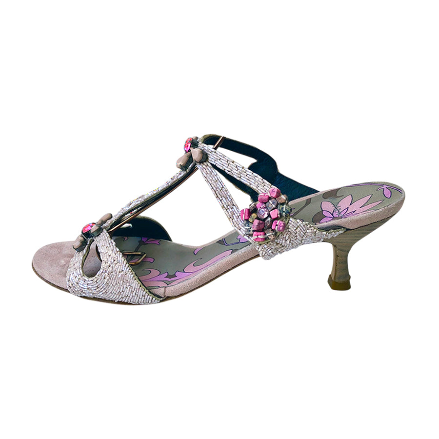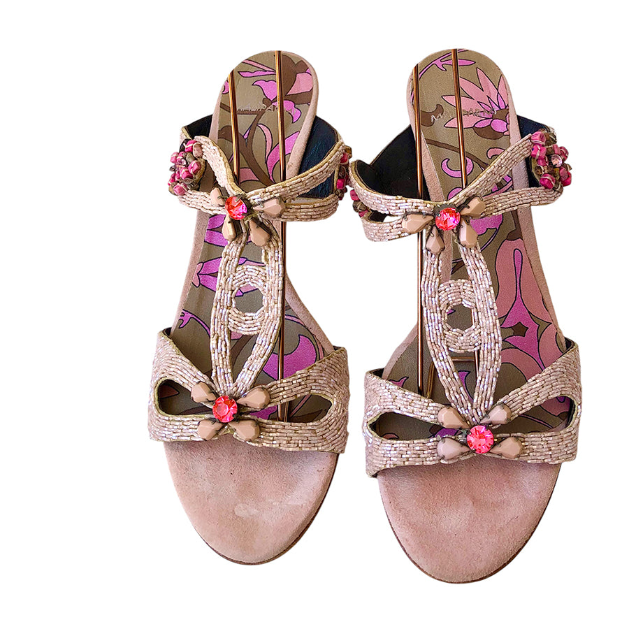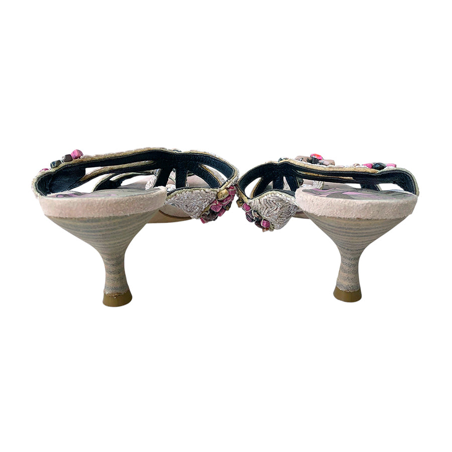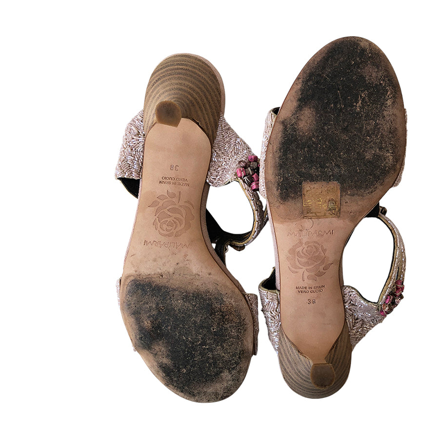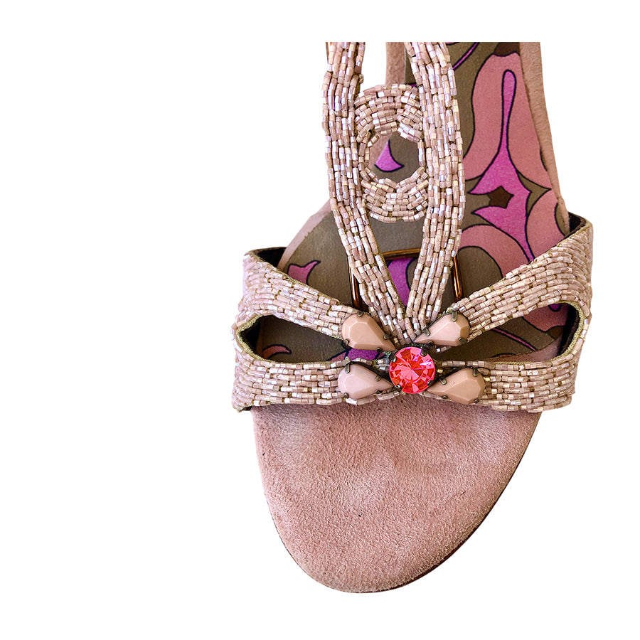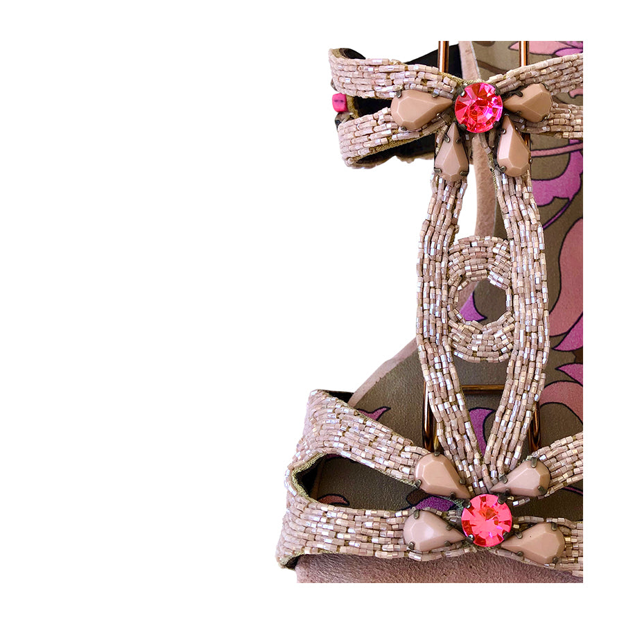 Sandali gioiello Maliparmi con tomaia in perline e cristalli rosa. Sottopiede stampato in stile floreale e punta in suede.