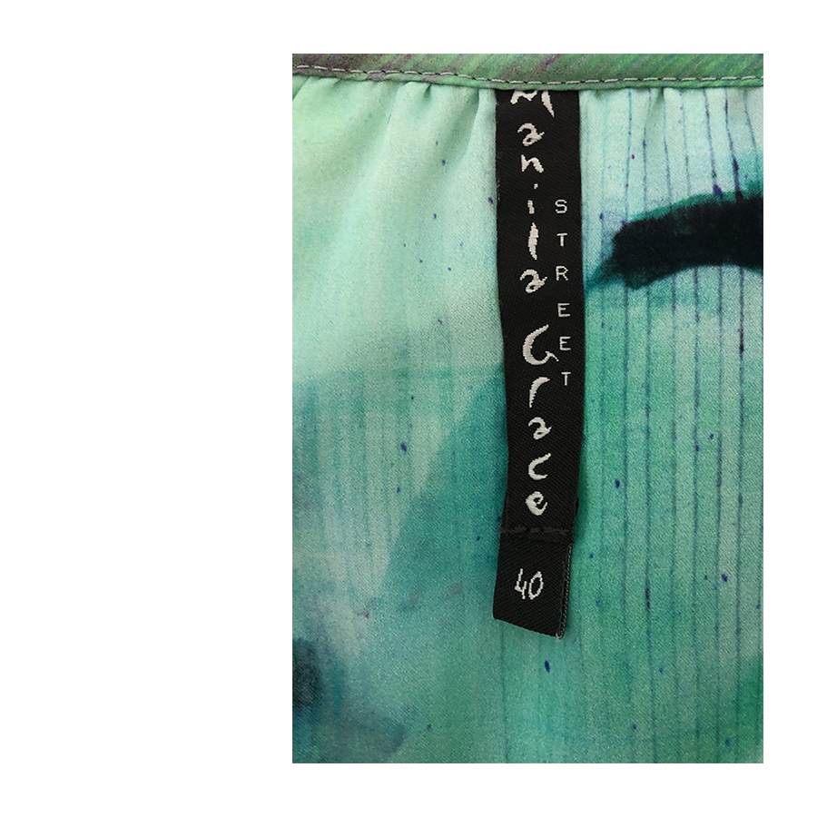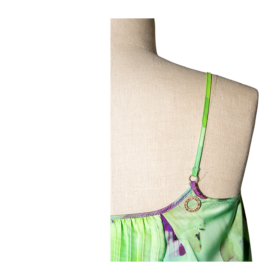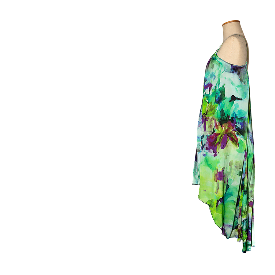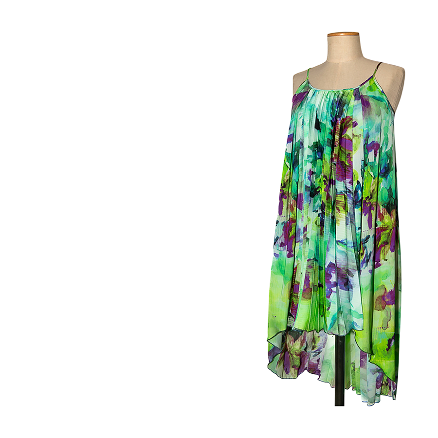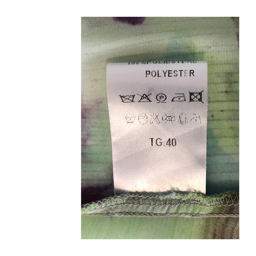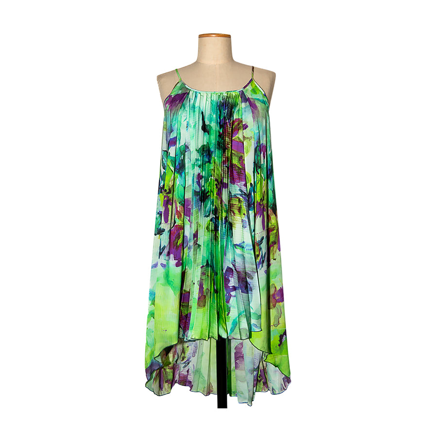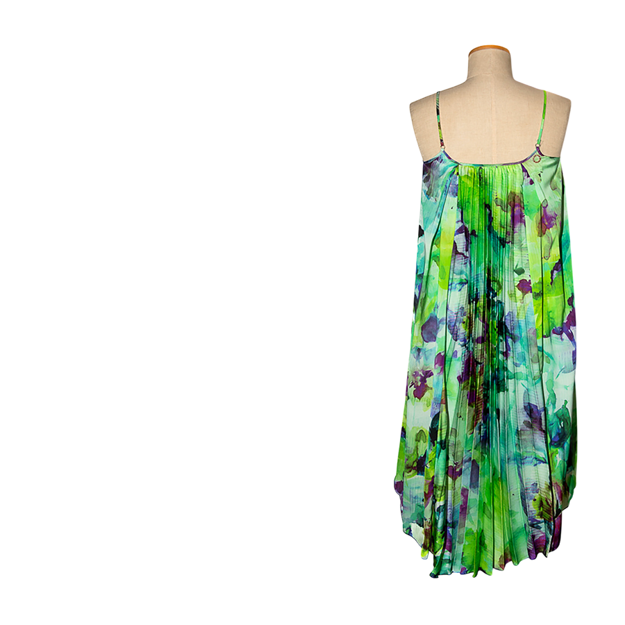 Abito firmato Manila Grace, realizzato in tessuto plissettato con stampa astratta nei toni del verde, turchese, viola e lime. Modello senza maniche con spalline sottili e scollo morbido, caratterizzato da una linea fluida e ampia. L’orlo asimmetrico, più lungo sul retro, dona movimento e un effetto svolazzante ultra femminile.
