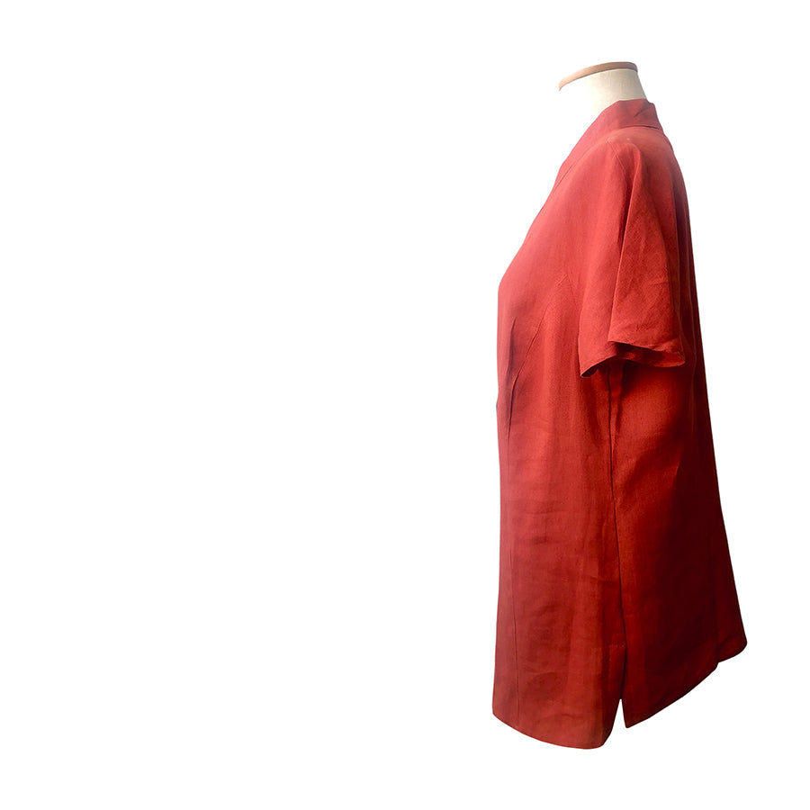 Blusa in lino oversize Marina Rinaldi color terracotta. Taglio essenziale e fluido, maniche corte, colletto a V.