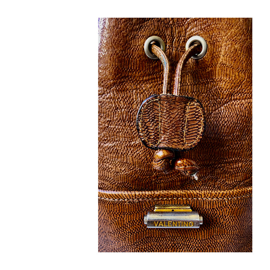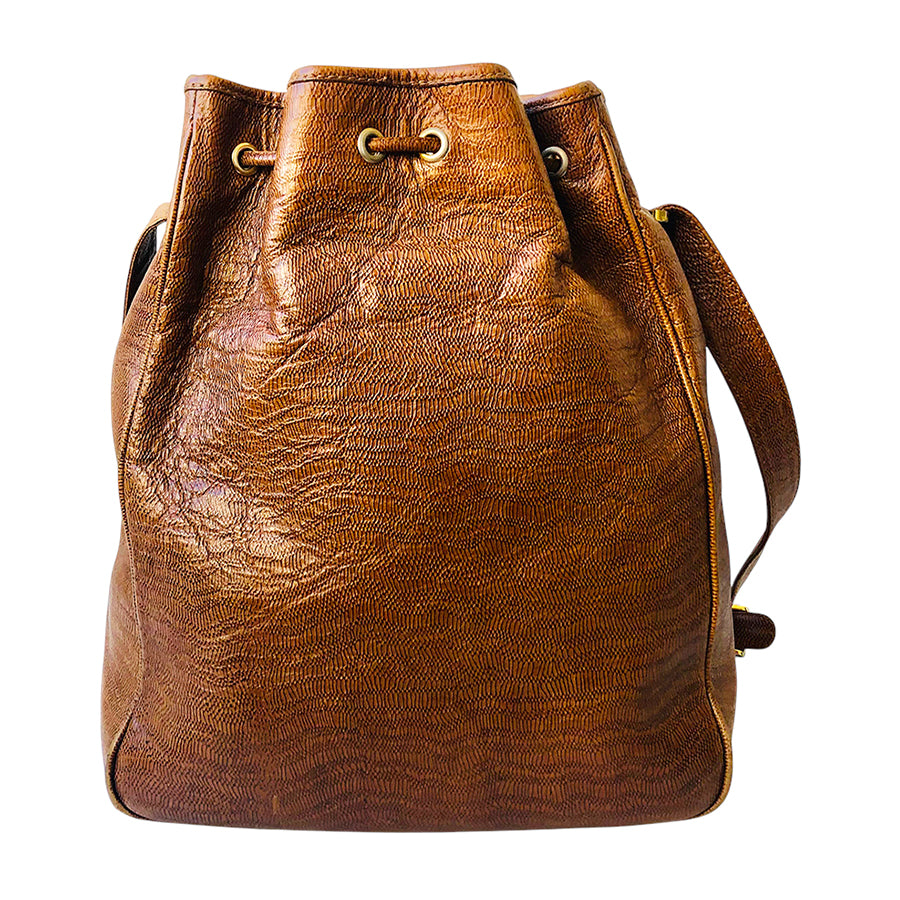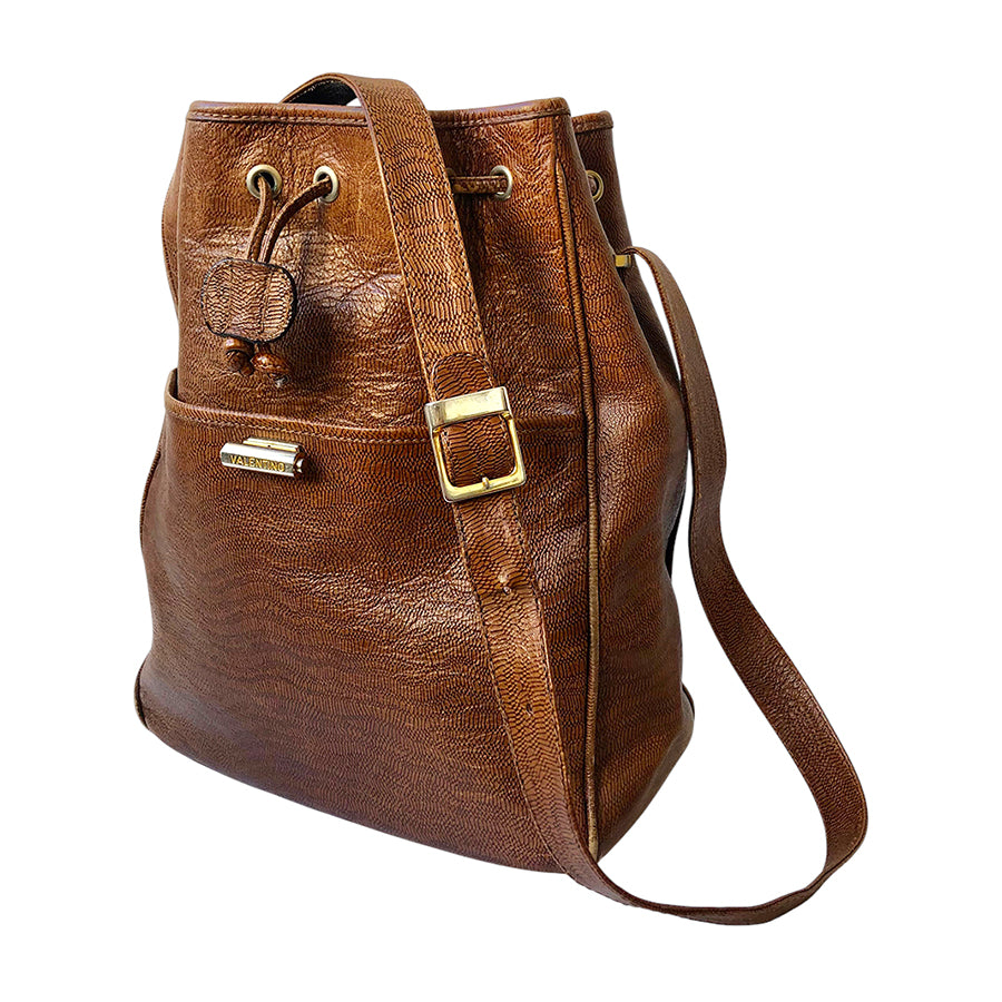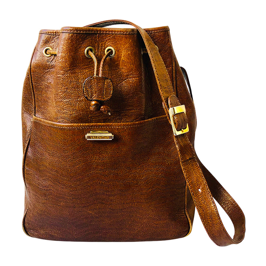 Tracolla vintage ’80–’90 Mario Valentino in pelle color cuoio caldo e texture effetto lucertola. Secchiello rigido con chiusura a coulisse, tracolla regolabile e placca dorata con logo.