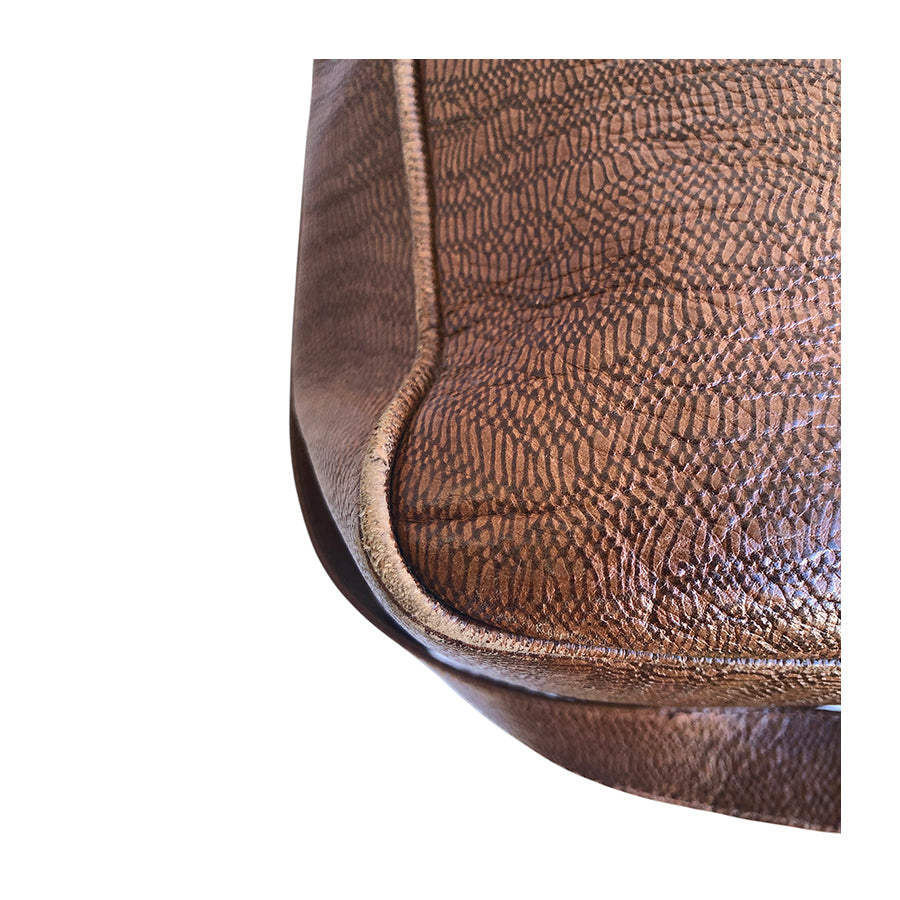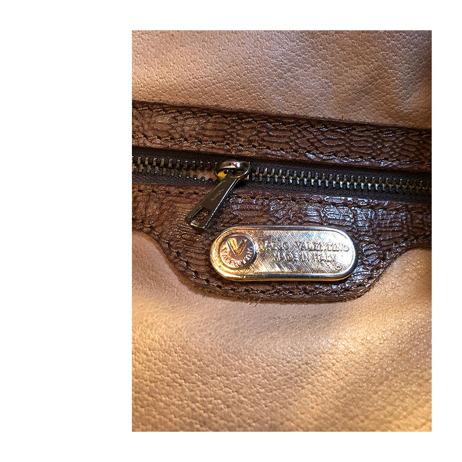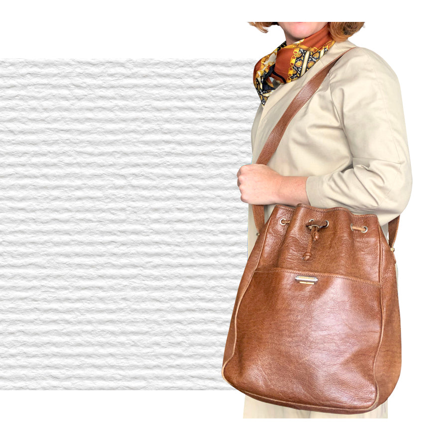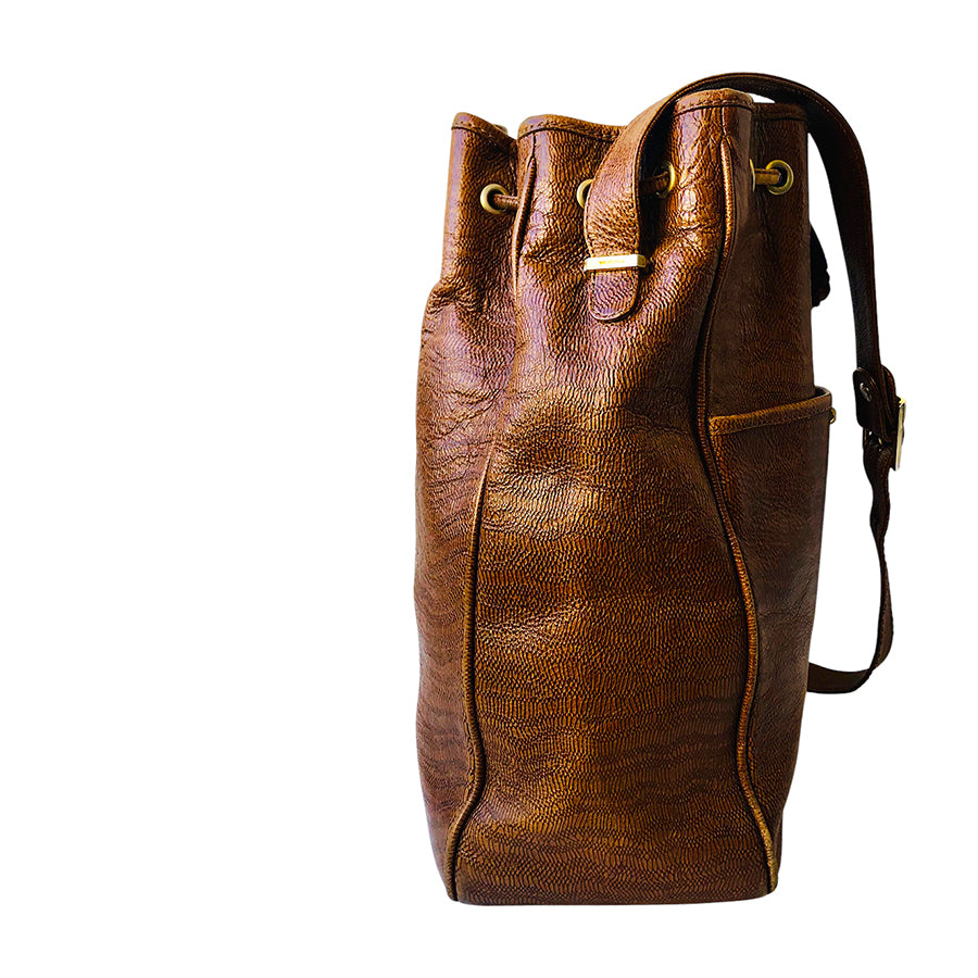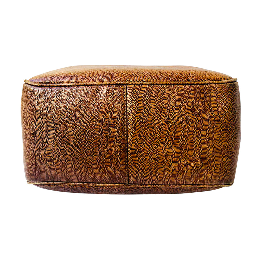 Tracolla vintage ’80–’90 Mario Valentino in pelle color cuoio caldo e texture effetto lucertola. Secchiello rigido con chiusura a coulisse, tracolla regolabile e placca dorata con logo.