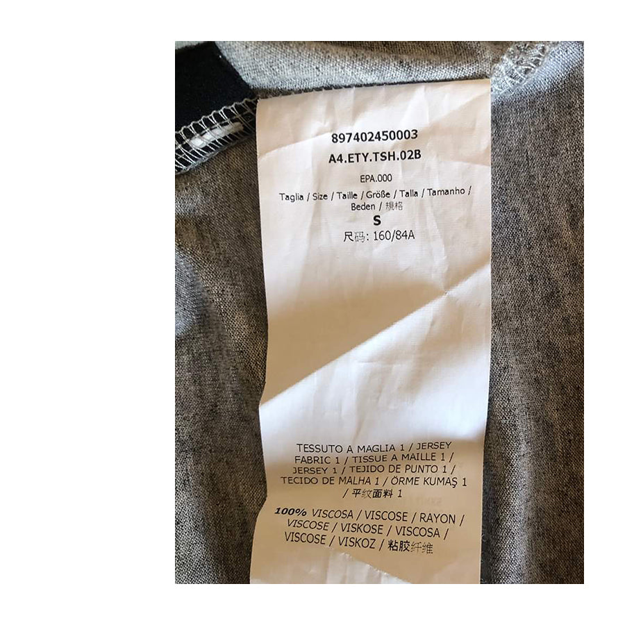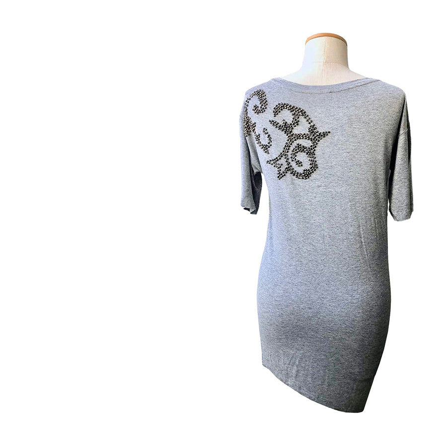 T-shirt grigia asimmetrica in jersey di viscosa con decorazioni brillanti a forma di arabeschi.