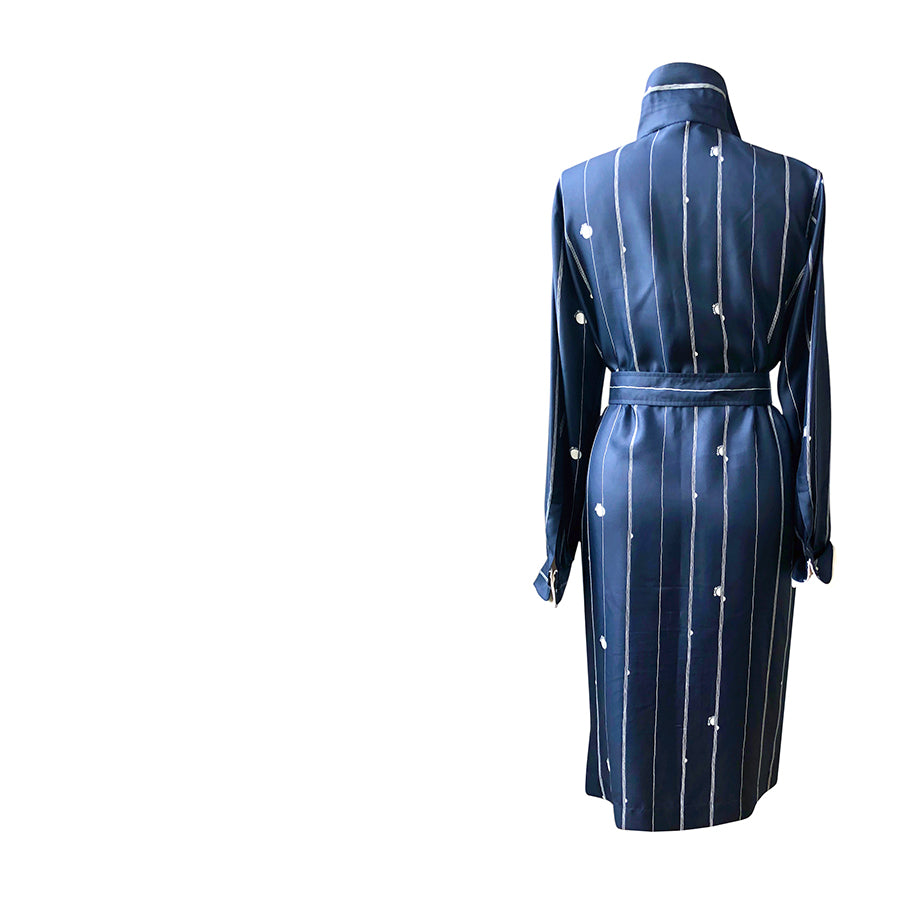 Chemisier vintage ’80 Max Mara in seta con stampa a righe sottili verticali su fondo blu navy e micro motivi bianchi che ne esaltano la texture fluida e luminosa.
