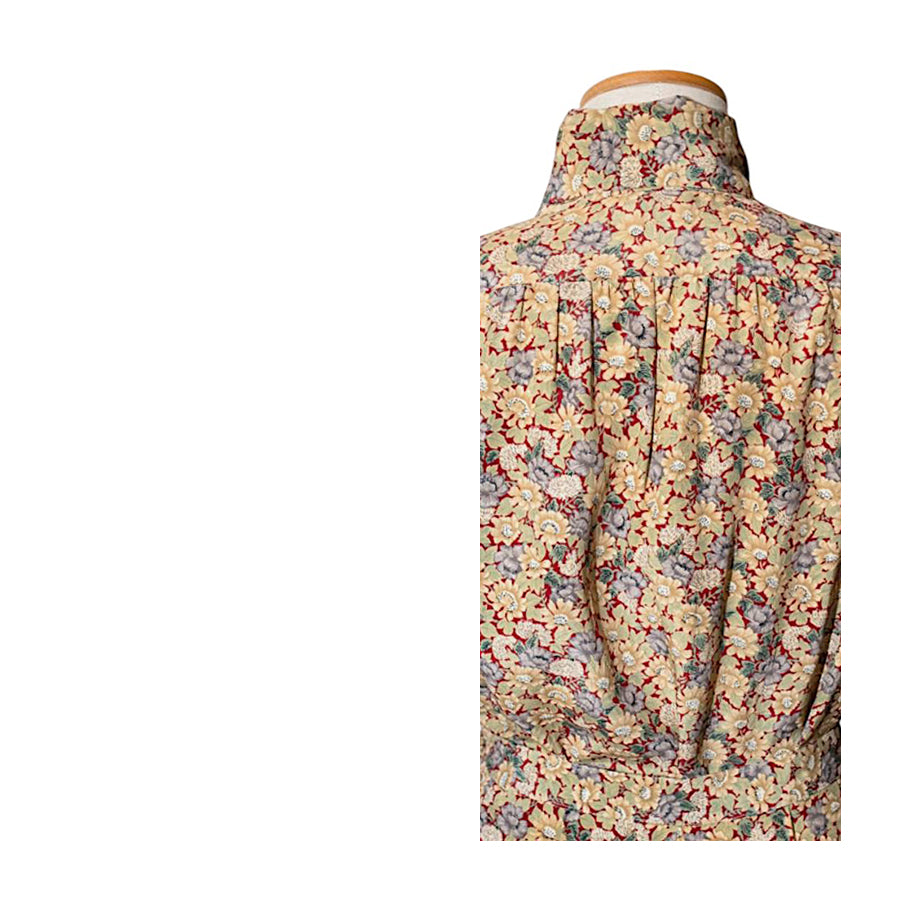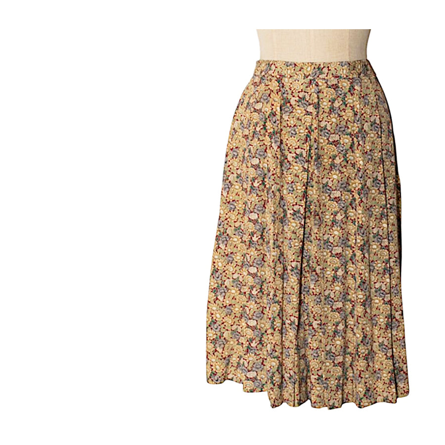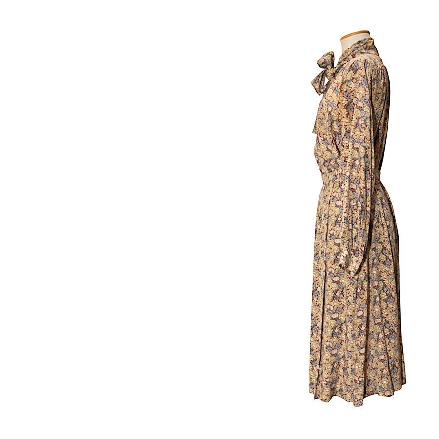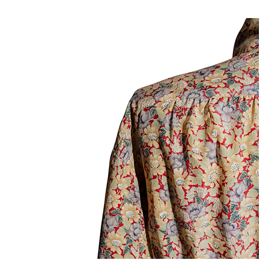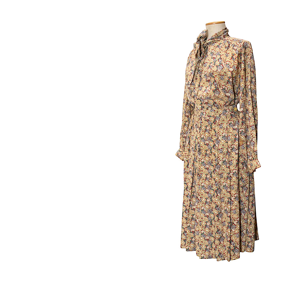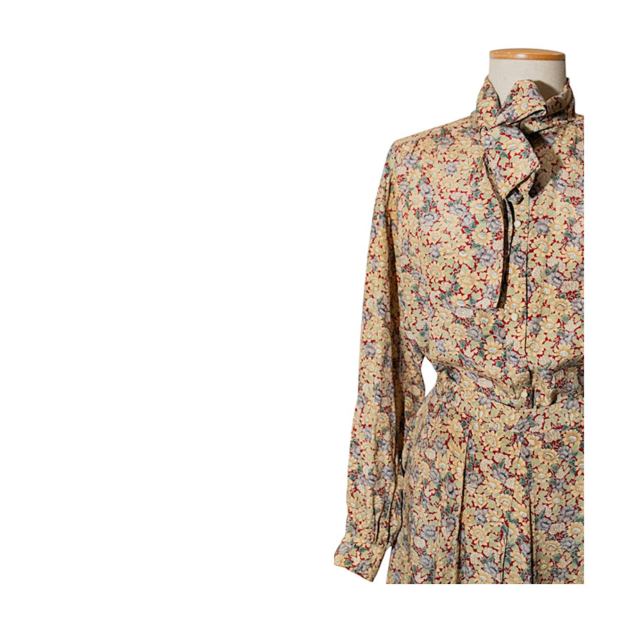 Completo vintage in pura seta con stampa floreale micro all-over, composto da blusa a maniche lunghe con collo annodabile e gonna midi a pieghe con vita alta. Leggerissimo, fluido e ultra femminile, è perfetto per dare un tocco retrò e raffinato al tuo guardaroba.