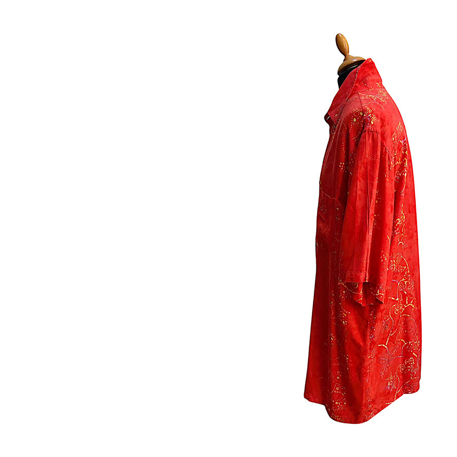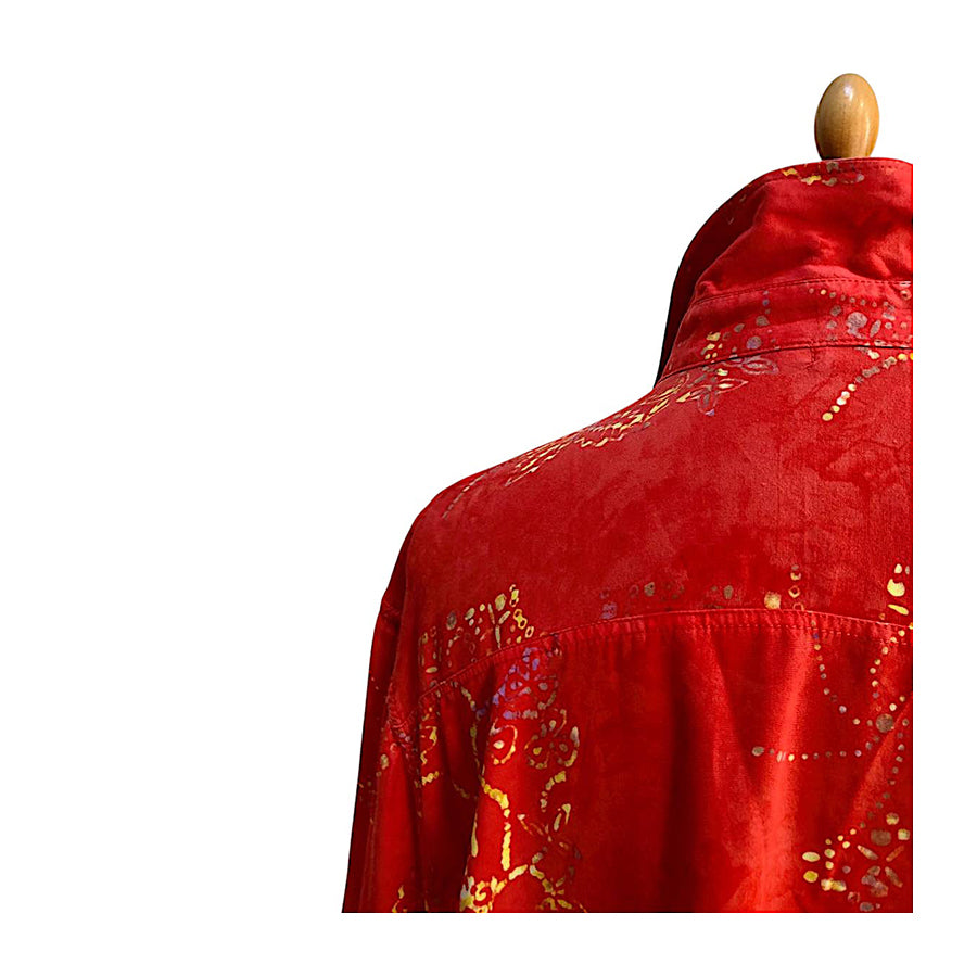 Aloha shirt vintage Mission Canyon in rayon con stampa floreale effetto batik nei toni del rosso, giallo e viola. Caratterizzata da maniche corte, vestibilità relaxed e bottoni in cocco è una autentica collezione anni '90.