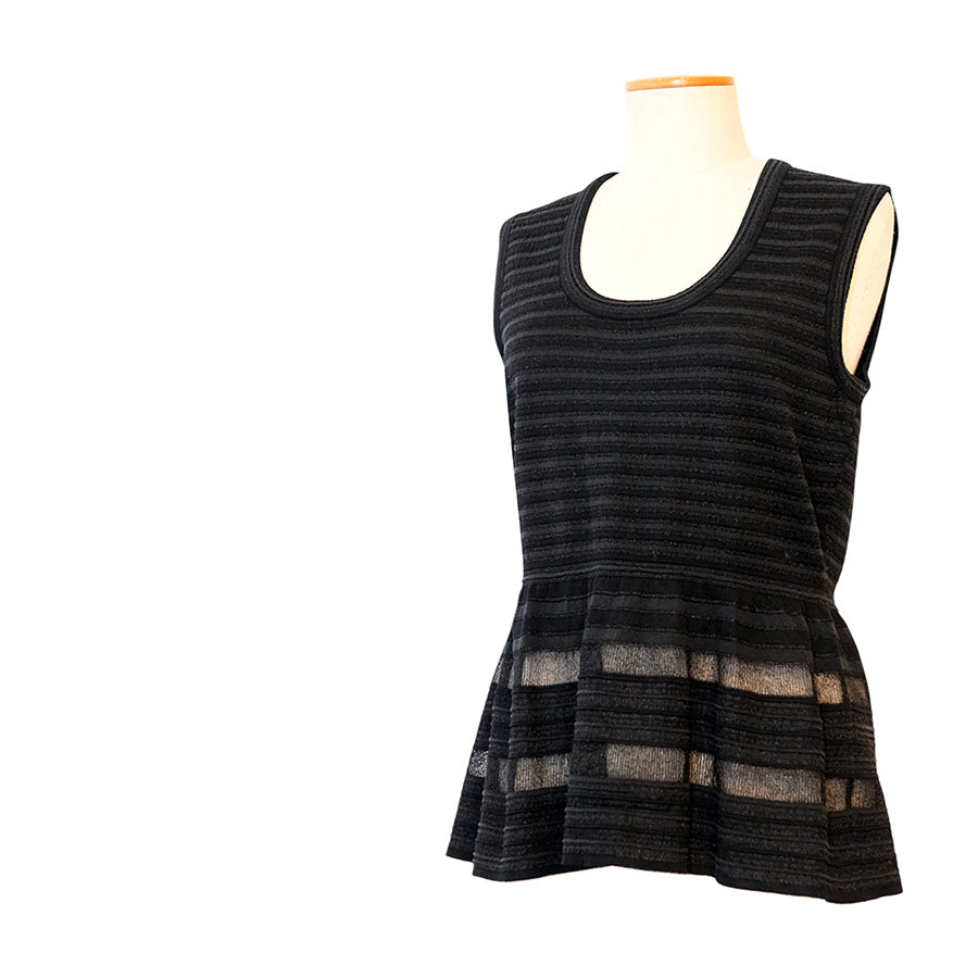 Top smanicato vintage ‘90 Missoni in maglia leggera con motivo a righe sottili lurex e inserti trasparenti. Capo Made in Italy ideale per amanti della moda vintage di lusso.
